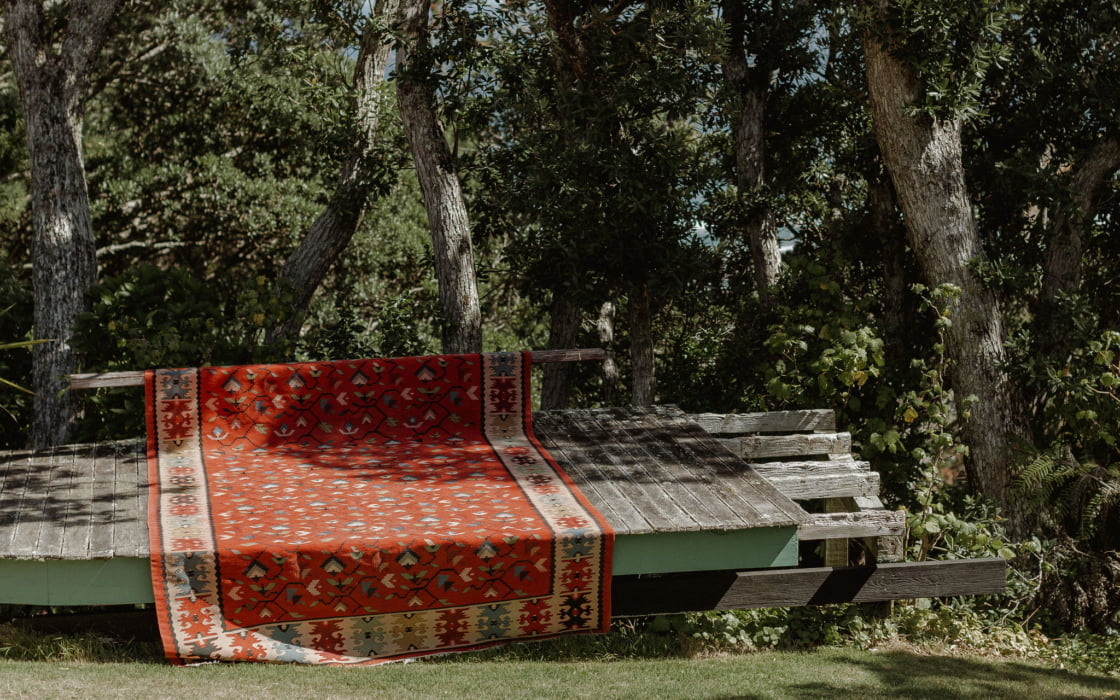 THE VIBE “We didn’t have a specific theme, we just wanted it to be a casual day where our loved ones got to celebrate with us and enjoy good food and drinks. We didn’t have any decorations, instead letting the natural setting of native New Zealand trees and Muriwai Beach be our backdrop. We did have a Persian rug as a sort of centrepiece, which is where we actually stood during the ceremony to exchange vows. Before the wedding, we dragged out all the various Persian rugs Henry’s parents owned and selected one we loved to use on the day. After the wedding, Henry’s parents gifted us the rug, which is now in our lounge in our home and is a lovely reminder of the day. It will furnish our home forever.“