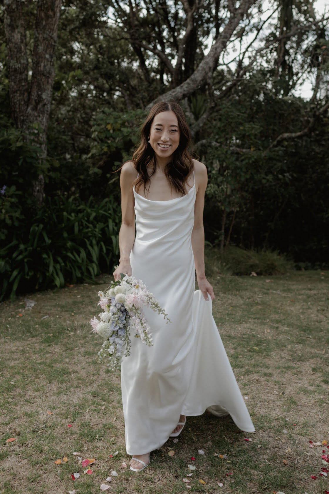 THE DRESS “Because it was going to be a family-only wedding, I initially planned on getting a simple slip dress off the rack, but it turned out to be more difficult to find one than expected. I booked into a wedding dress store in Christchurch one weekend not expecting much as I hadn’t had much luck and was running out of time. But that’s when I came across the dress by Oui The Label. The timing was perfect and I was lucky to find it when I did, because the dress was literally only at the store for a couple of weeks for a trunk show. It was only three months before the wedding so I had to make the decision regarding the dress on the day and we had to put a rush order on it getting made, shipped, etc!”