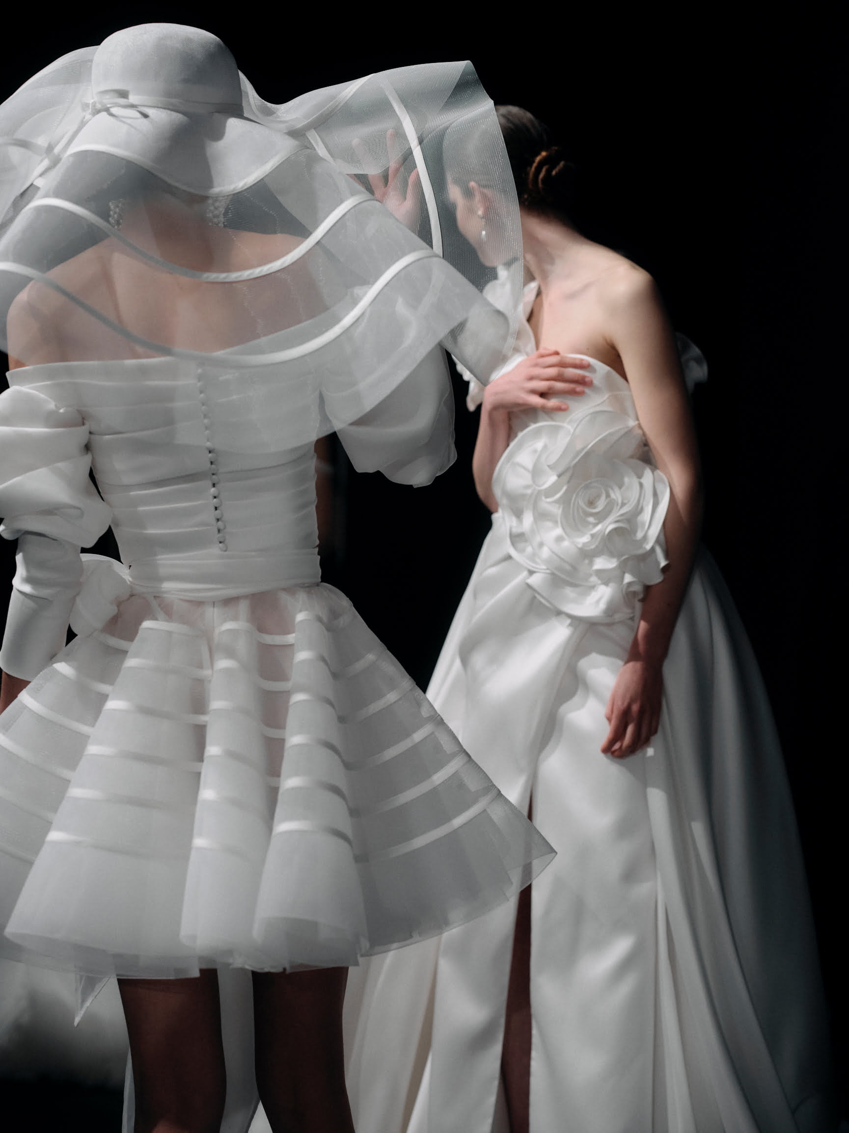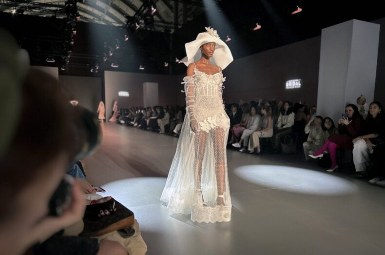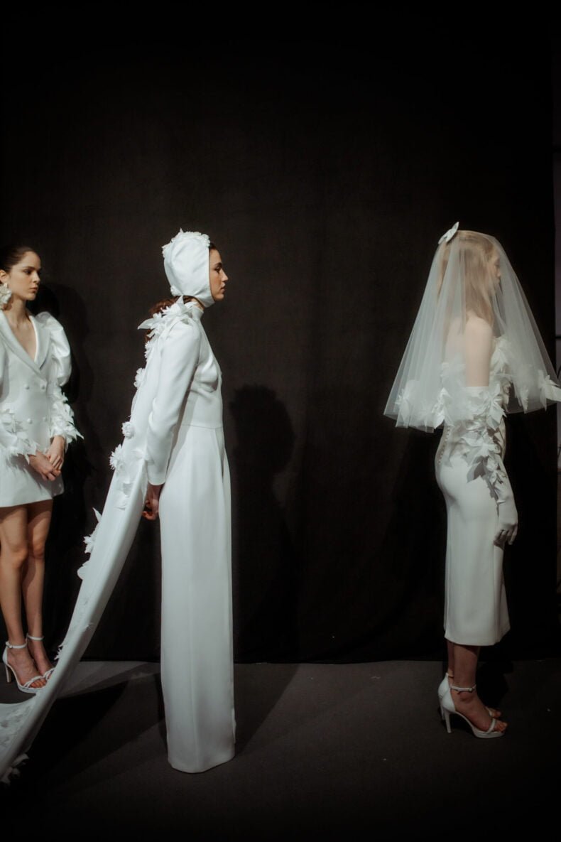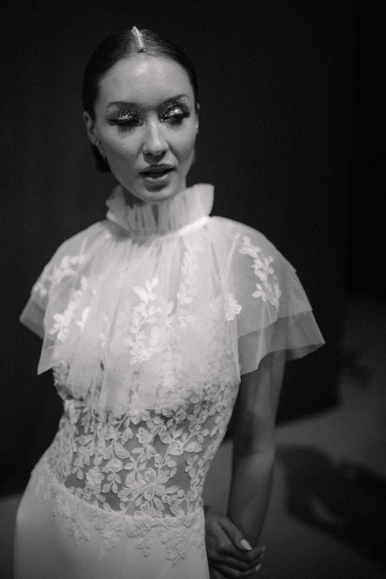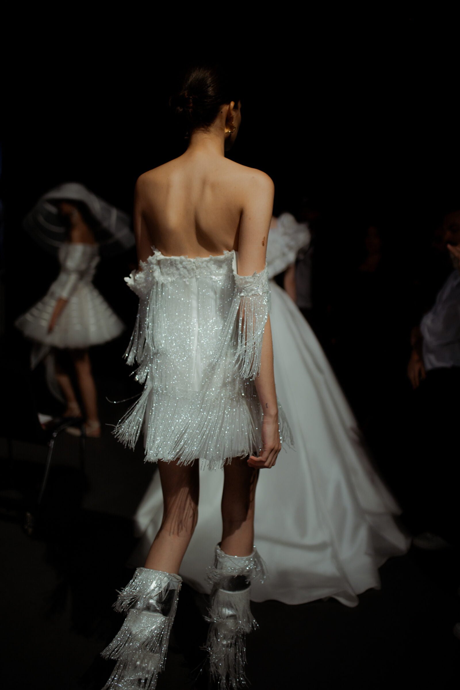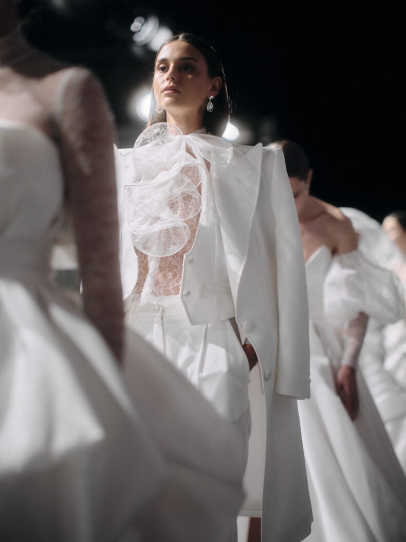 Another huge highlight was cutting-edge Spanish designer Yolancris. The show’s mechanics and drama alone was breathtaking enough, but the collection that followed… Ooft! Picture this: dark runway, classical tune To The Hills blasting, spotlights start flashing and then the most epic suit and statement veil combo strut out. From there, it was hit after hit – sheer gloves, lavish lace, adorned minis and on-trend floral motifs. Each look was uber-romantic yet edgy, weaving modern chic with classic allure.