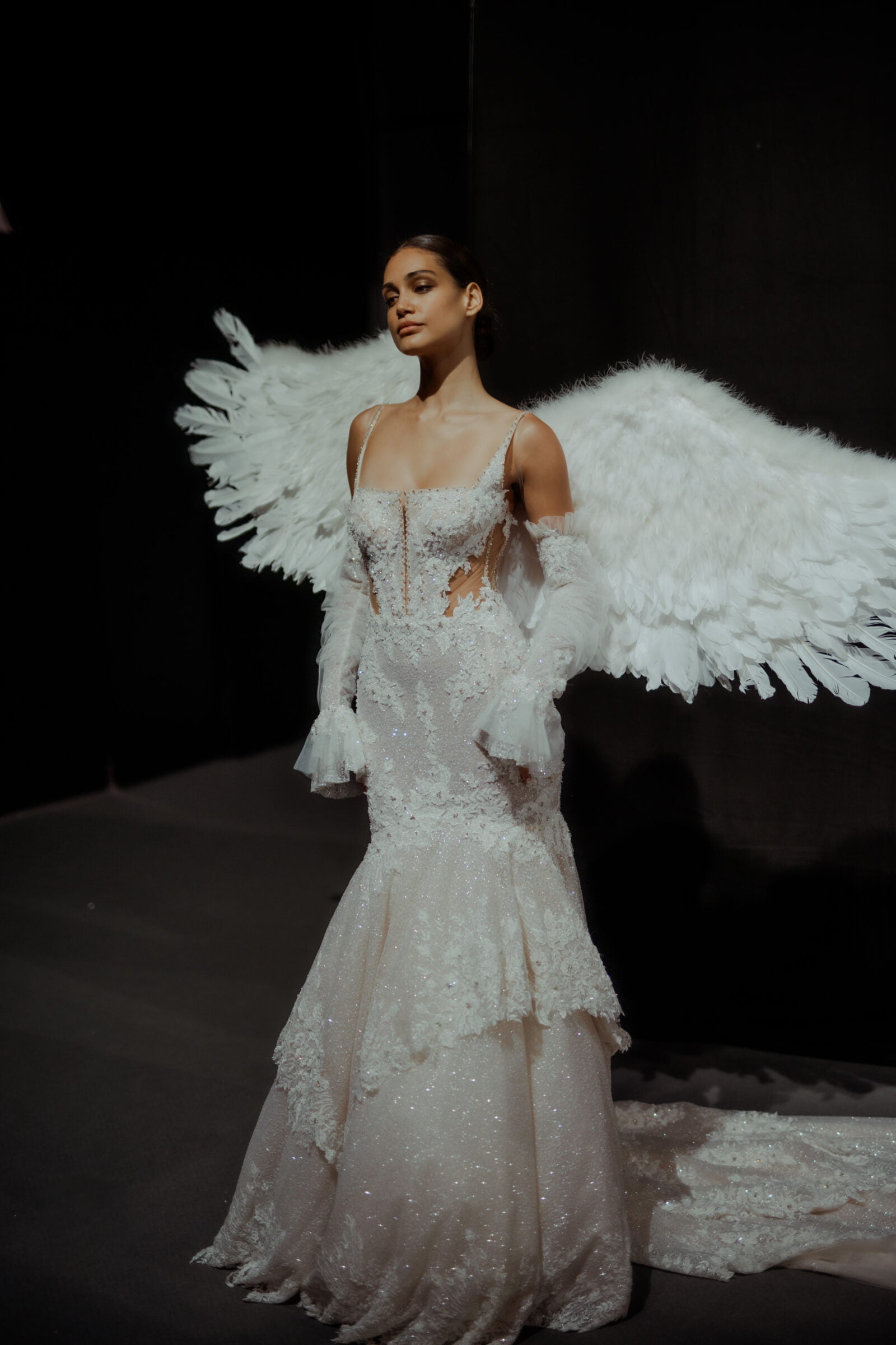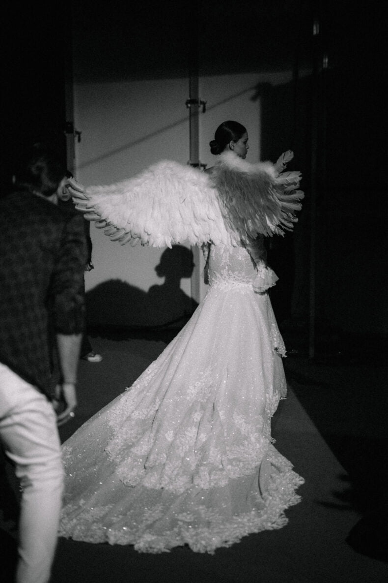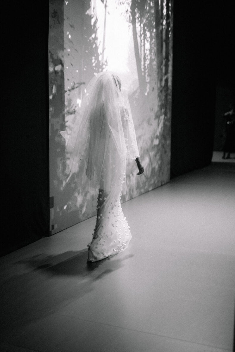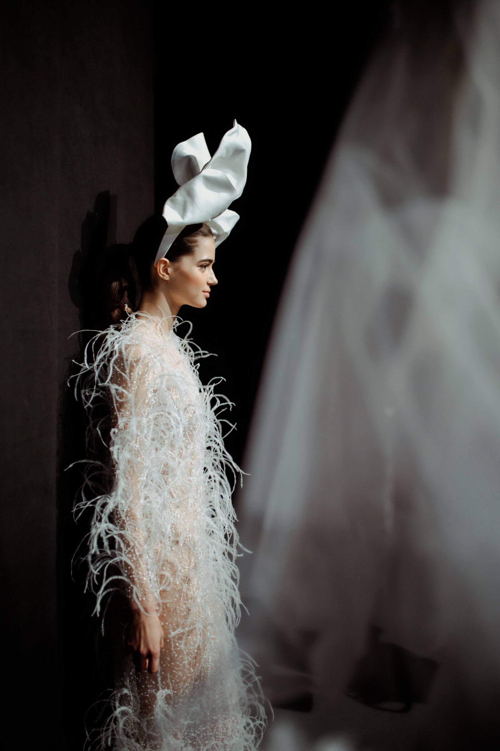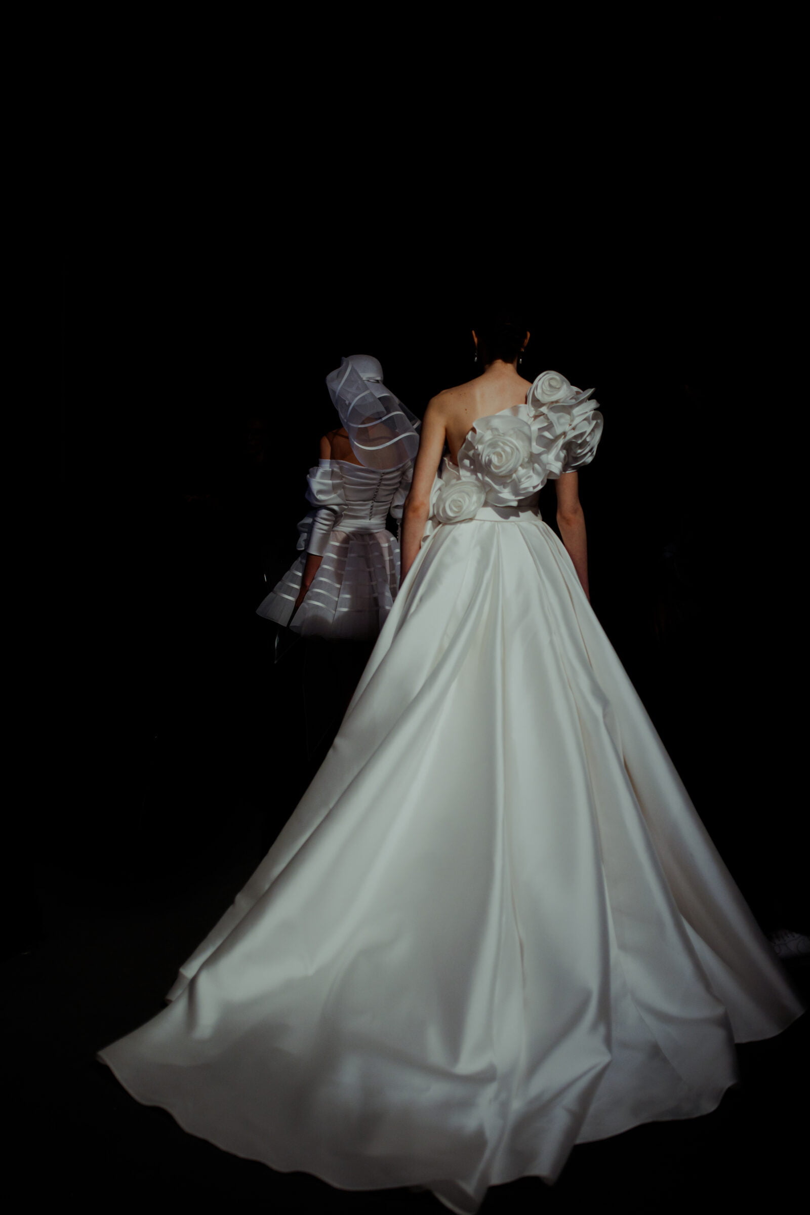 Another huge highlight was cutting-edge Spanish designer Yolancris. The show’s mechanics and drama alone was breathtaking enough, but the collection that followed… Ooft! Picture this: dark runway, classical tune To The Hills blasting, spotlights start flashing and then the most epic suit and statement veil combo strut out. From there, it was hit after hit – sheer gloves, lavish lace, adorned minis and on-trend floral motifs. Each look was uber-romantic yet edgy, weaving modern chic with classic allure.