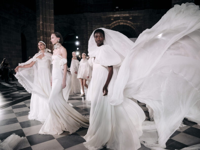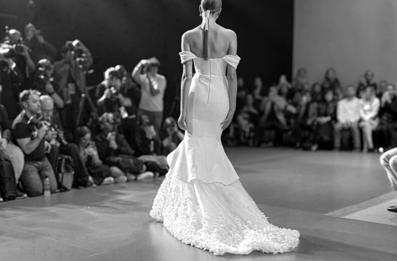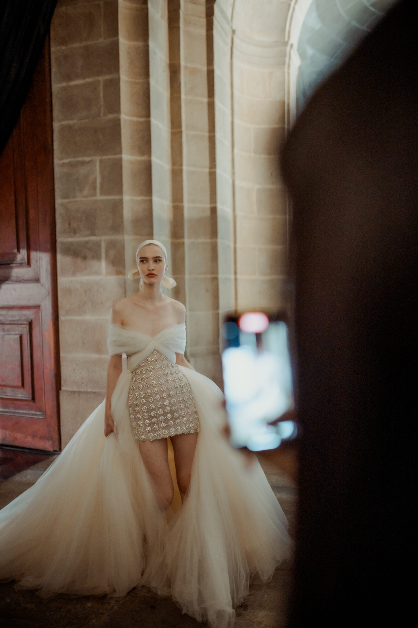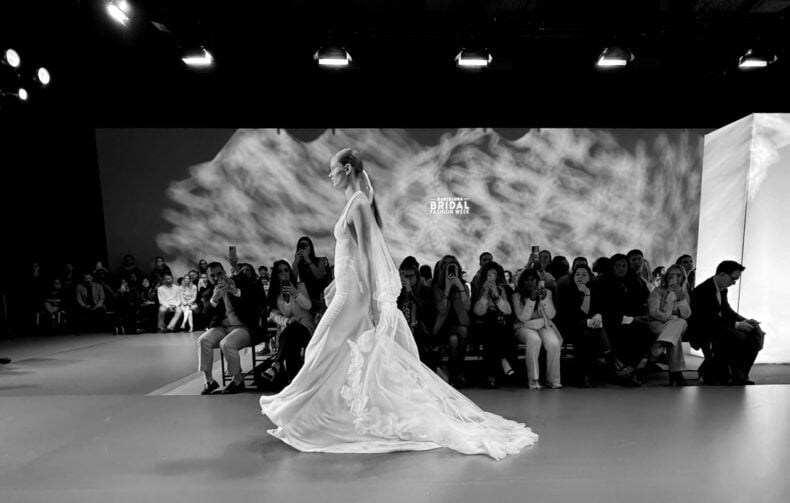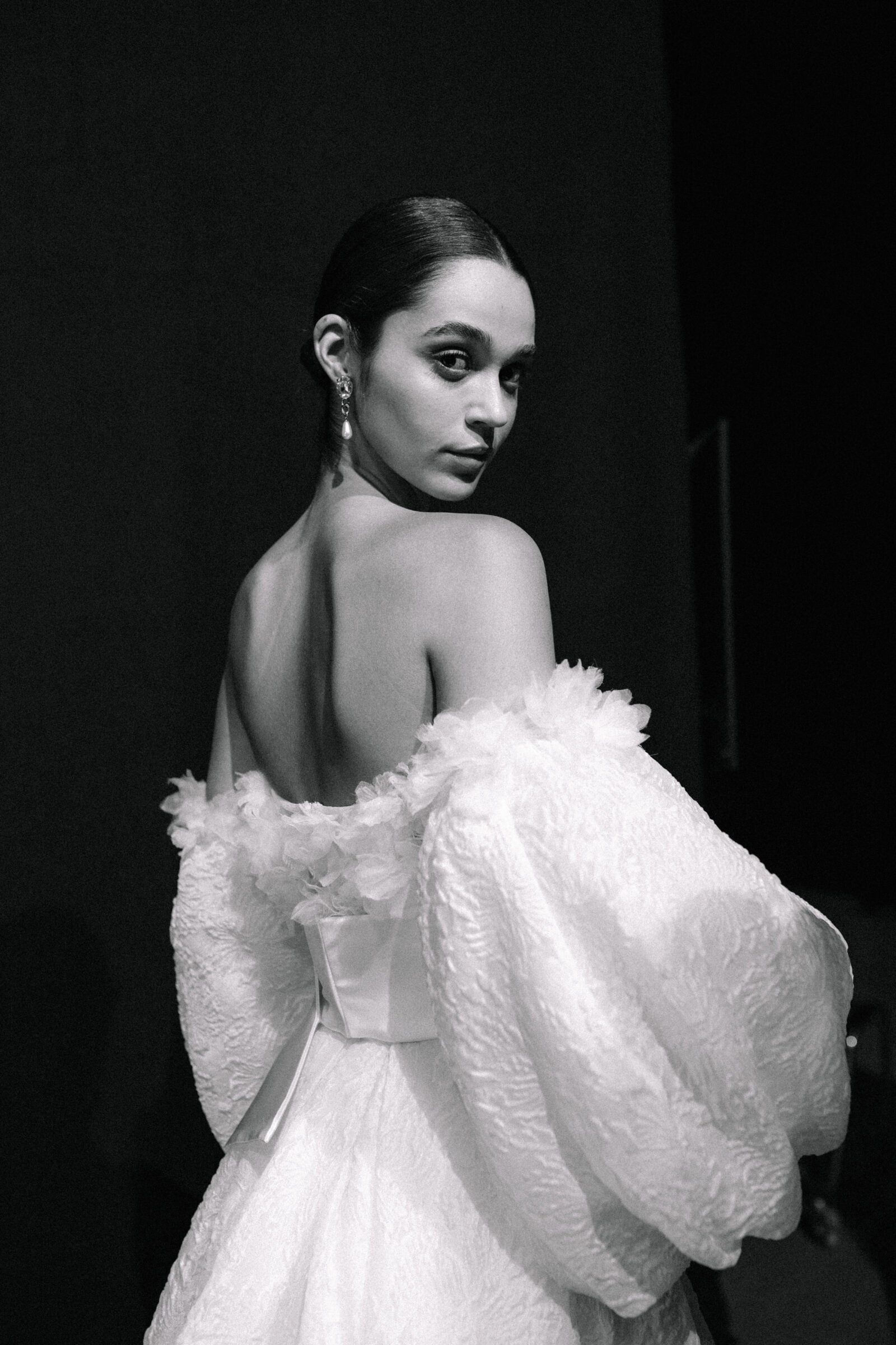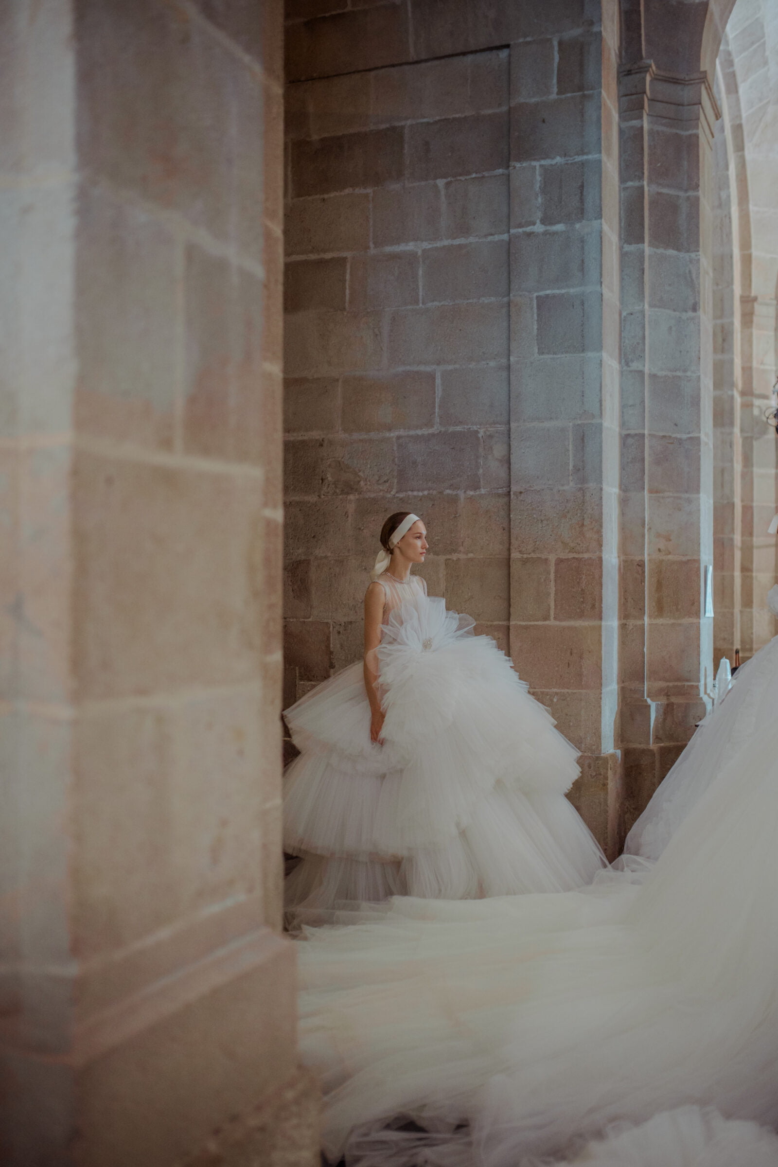 The biggest drawcard of the (seriously impressive) bunch was haute couturist and high fashion royalty Giambatistta Valli. While the Italian designer has been whipping up couture masterpieces for nearly 20 years, the collection he debuted in Barcelona was only his third time round in the bridal sphere. On a fresh, spring evening in the historic and stunning La Llotja de Mar building, the Giambatistta Valli Love Collection 3 sashayed around the runway as part of the event’s ‘Gala Night’. The 30-piece strong range went big on volume, with bold ballgown silhouettes, dramatic trains, statement ruffles and luxe layers of dreamy tulle taking centre stage – all crafted with meticulous detail and paired with oversized accessories.