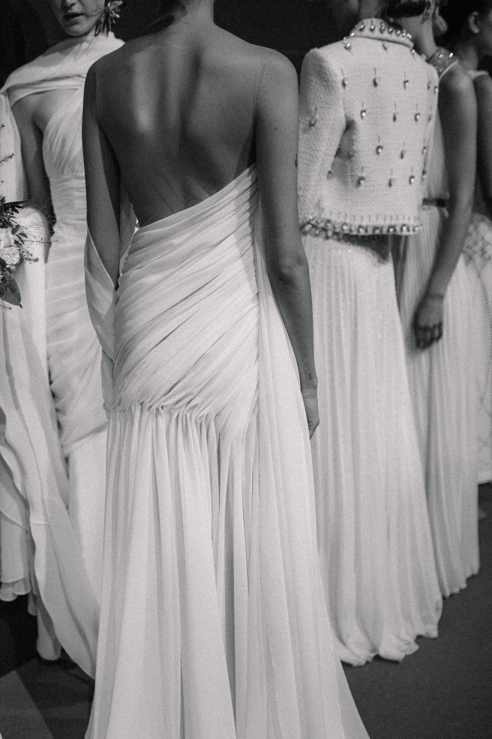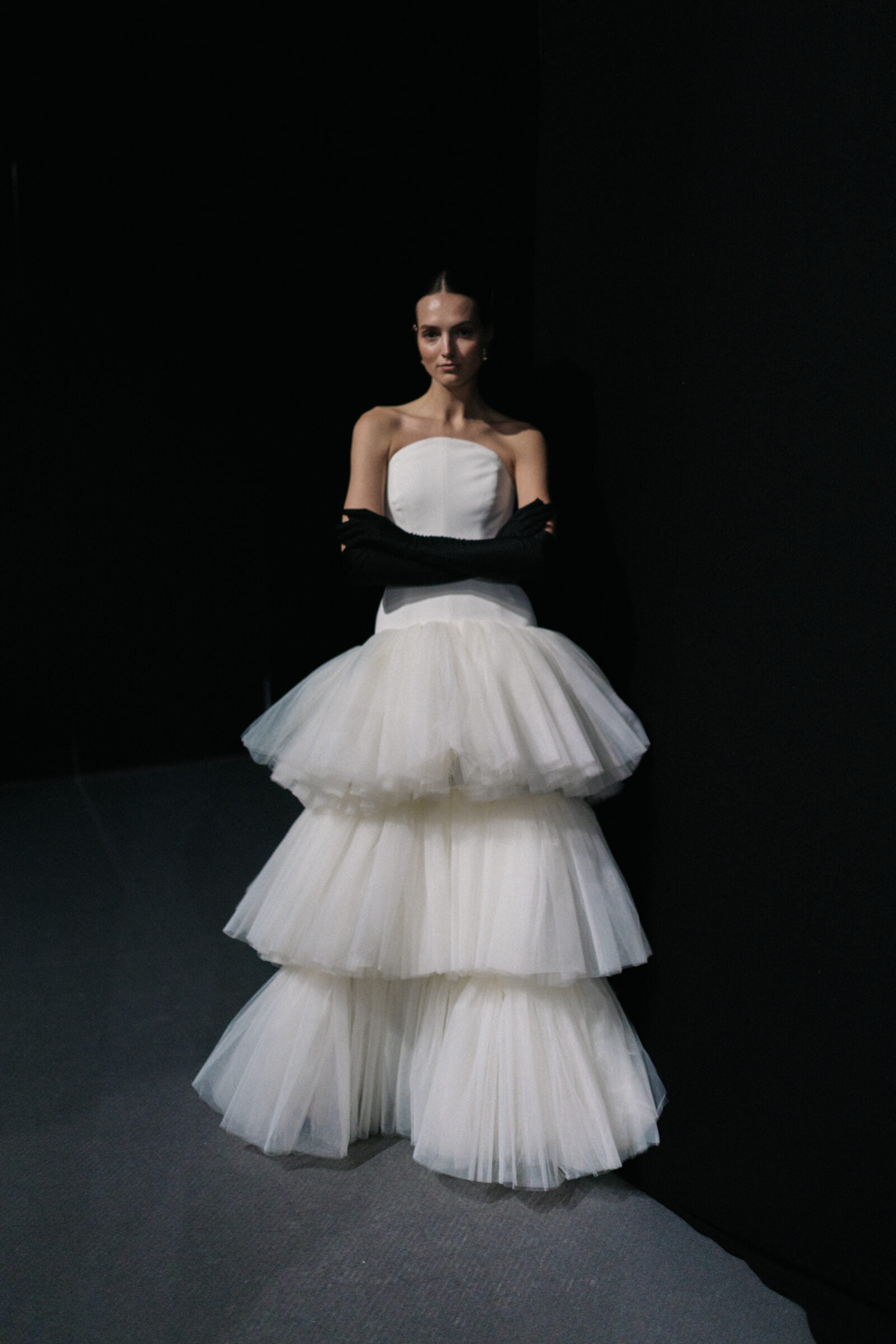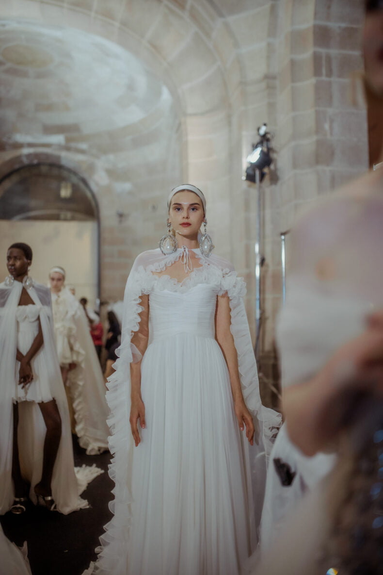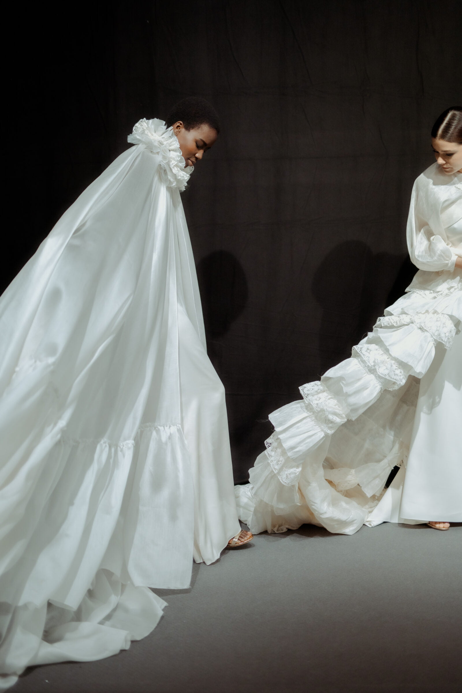The biggest drawcard of the (seriously impressive) bunch was haute couturist and high fashion royalty Giambatistta Valli. While the Italian designer has been whipping up couture masterpieces for nearly 20 years, the collection he debuted in Barcelona was only his third time round in the bridal sphere. On a fresh, spring evening in the historic and stunning La Llotja de Mar building, the Giambatistta Valli Love Collection 3 sashayed around the runway as part of the event’s ‘Gala Night’. The 30-piece strong range went big on volume, with bold ballgown silhouettes, dramatic trains, statement ruffles and luxe layers of dreamy tulle taking centre stage – all crafted with meticulous detail and paired with oversized accessories.