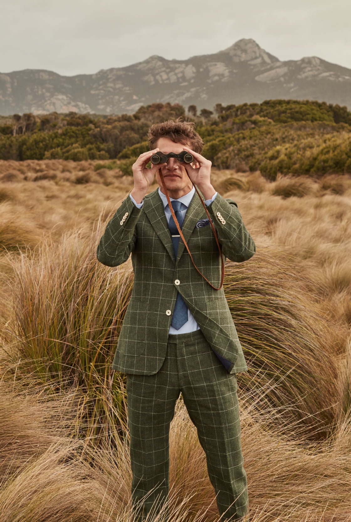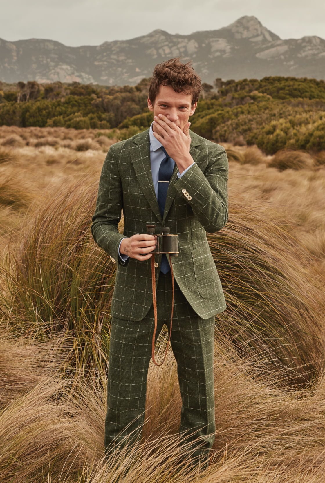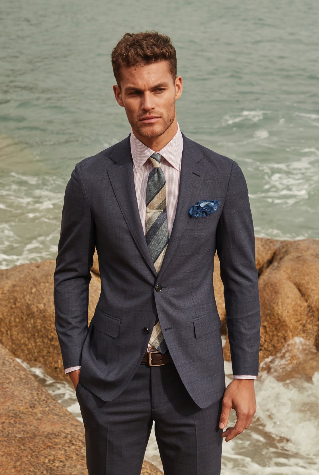M.J. Bale Anton Jacket $399, Anton Trouser $199, Elstree Shirt $109.95, Voce Blue Tie $TBA, Garner Pocket Square $39.95. Shop online at M.J. Bale.