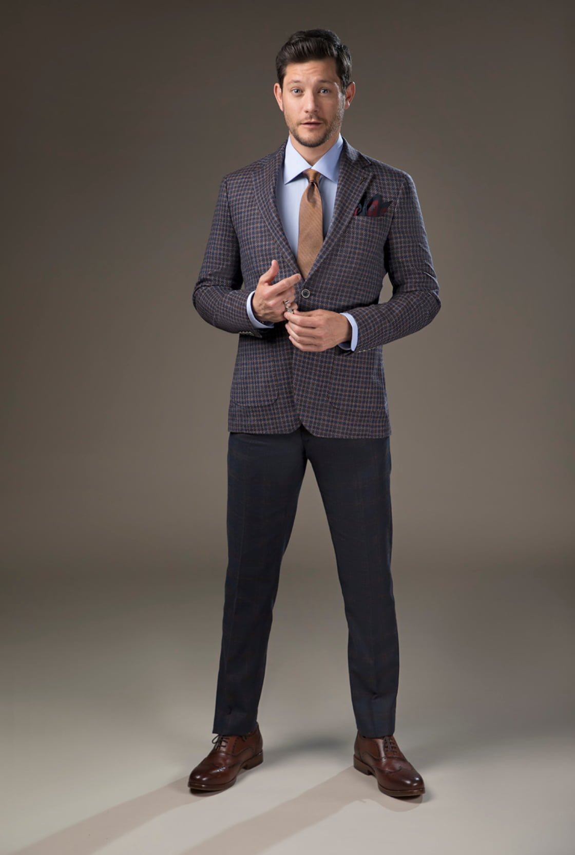 M.J. Bale Galani Jacket $599, Galani Trouser $299, Balmyle Shirt $109.95, Cobb Pocket Round $39.95, Veneziano Tie, $119.95. Shop online at M.J. Bale.