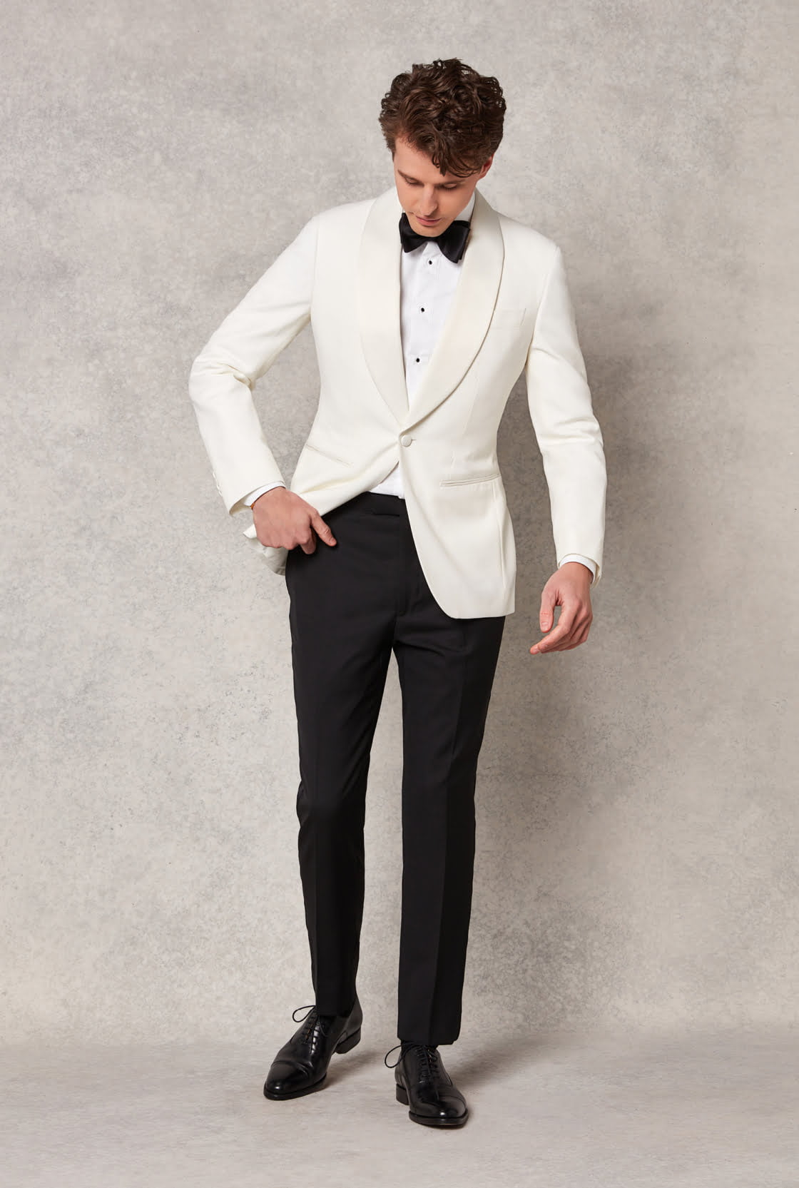 Oscar Hunt Tailors White Wool Dinner Jacket, from $1045, Black Wool Tuxedo Trousers, from $450. Make an appointment at Oscar Hunt Tailors.