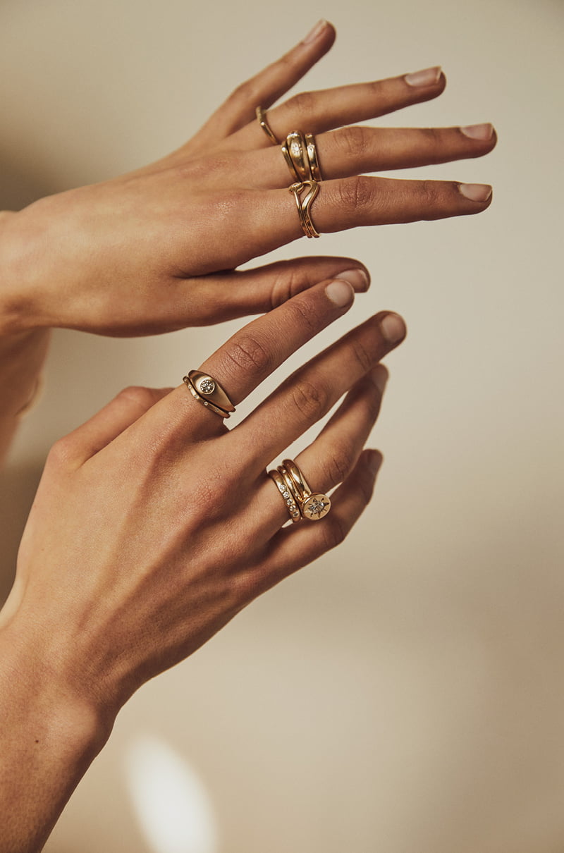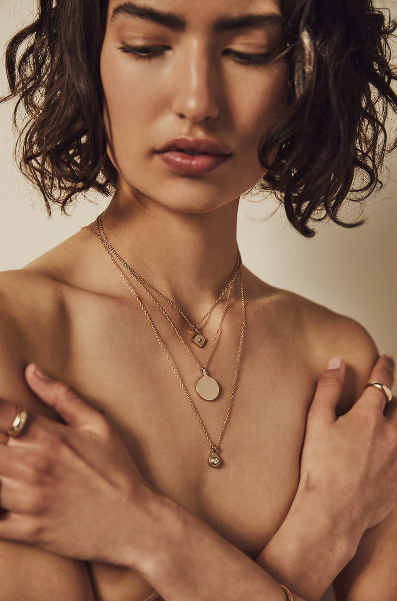 RUUSK Diamond Square Pendant Necklace, from $1040, Large Pendant Necklace, from $1065, Diamond Sol Necklace, from $1580, Lola Ring, from $1100. Shop online at RUUSK.