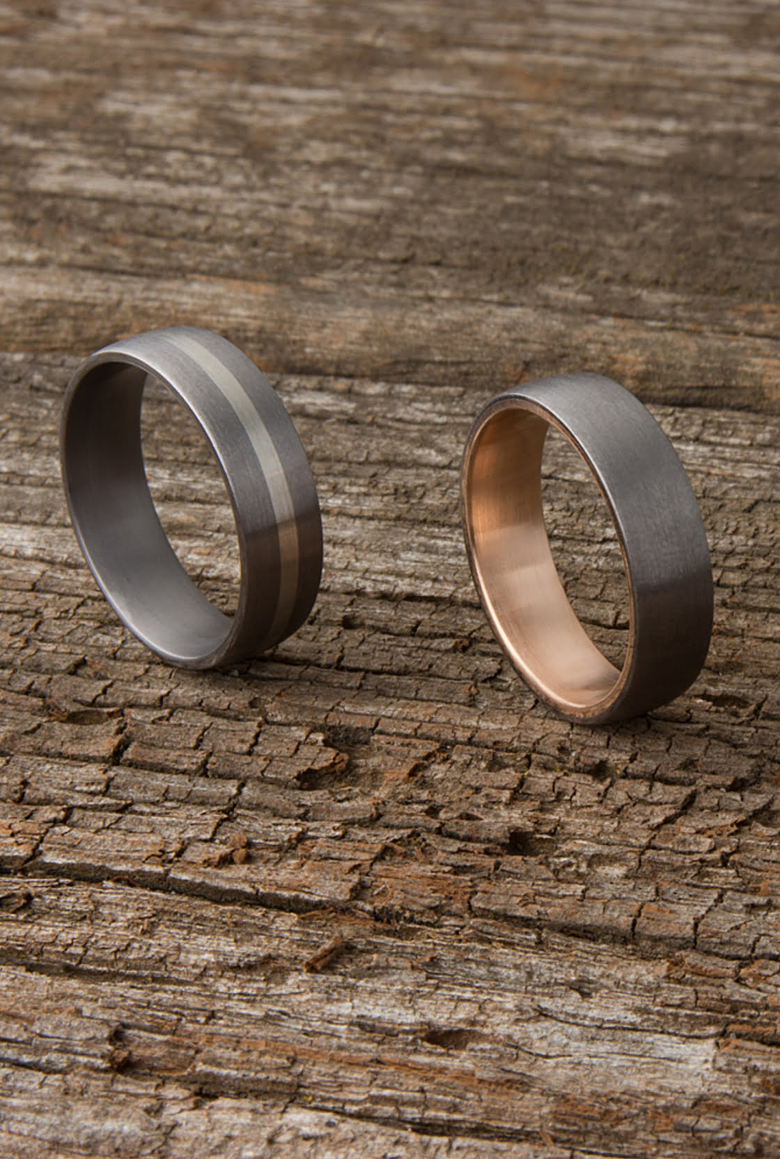 Kavalri Tantalum and Platinum 600 Striped Inlay Wedding Ring from $1165 and Tantalum and Rose Gold Inner Sleeve Wedding Ring from $1500. Shop online at Kavalri.