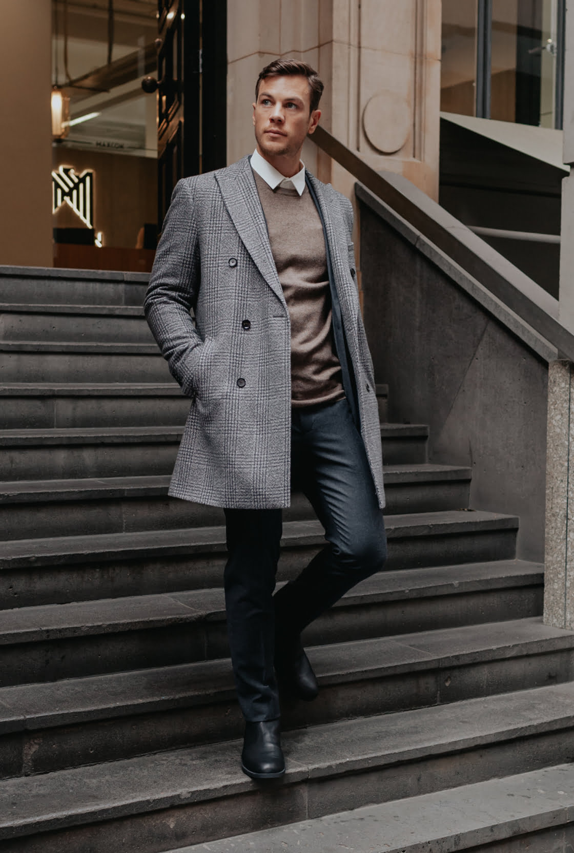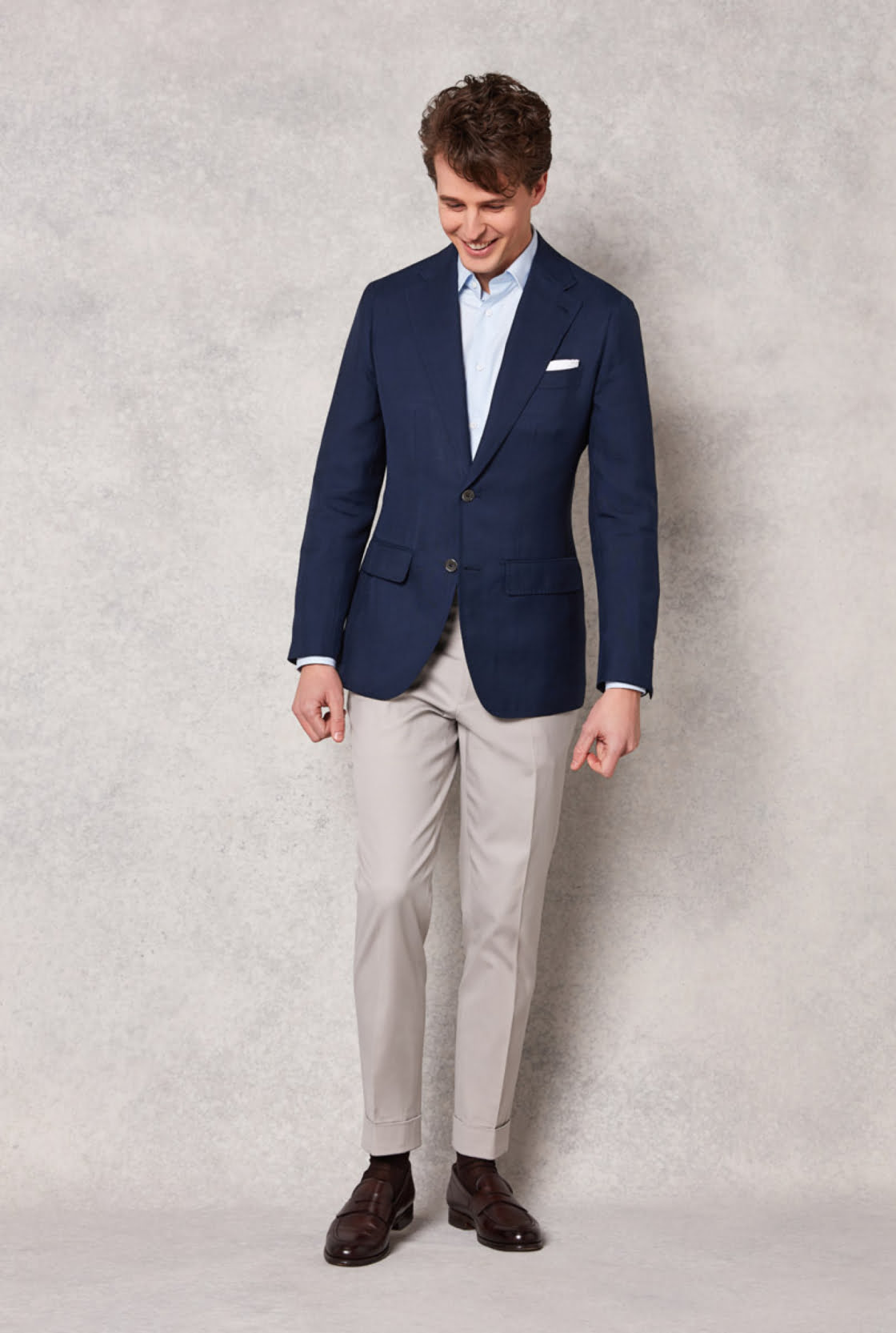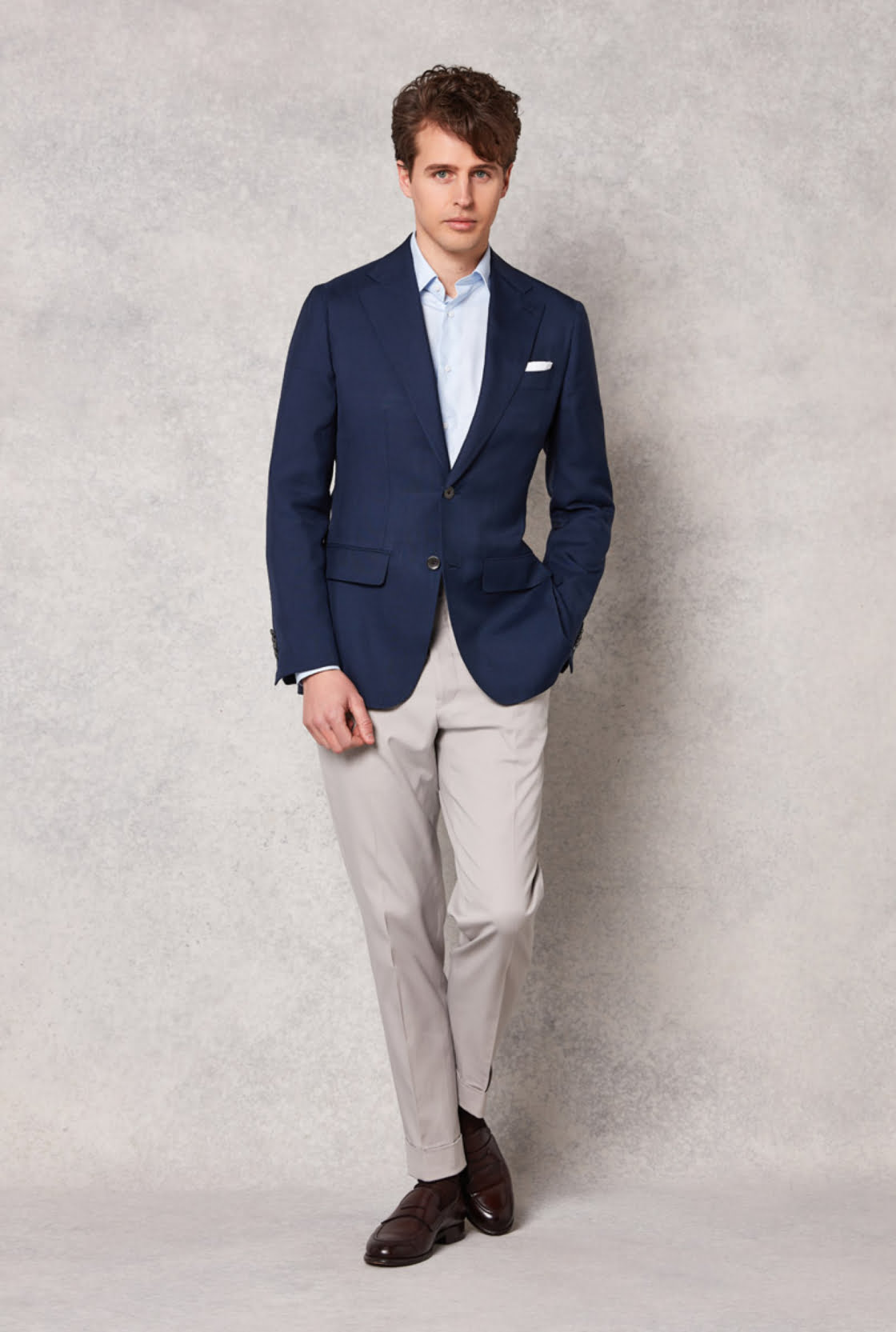 Oscar Hunt Navy Silk Jacket from $649, Grey Cotton Chino from $349. Shop online at Oscar Hunt.