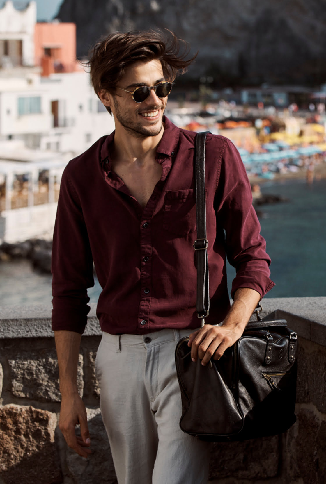 Joe Black Marine Jacket in Sand $345, Pioneer Shirt in Light Blue $149, Jaipur Paisley Pochette $49. Shop online at Joe Black.