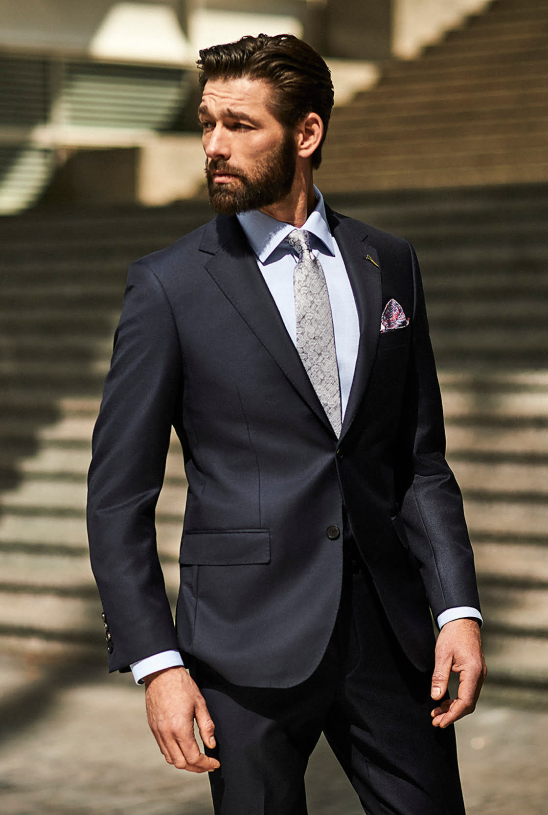Joe Black Falcon Jacket in Navy $645, Garrison Trouser in Navy $350, Pioneer Shirt in Blue $99, Melange Paisley Tie in Grey $99, Melange Paisley Pochette in berry $49. Shop online at Joe Black.