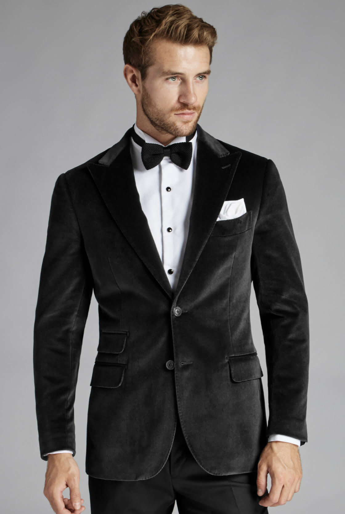MJ Bale Giacomo Velvet Jacket $599, Ramini White Tuxedo shirt $149.95, Maurico Black Bow Tie $69.95 & Lorde Tuxedo Button Pack $19.95. Shop online at MJ Bale.