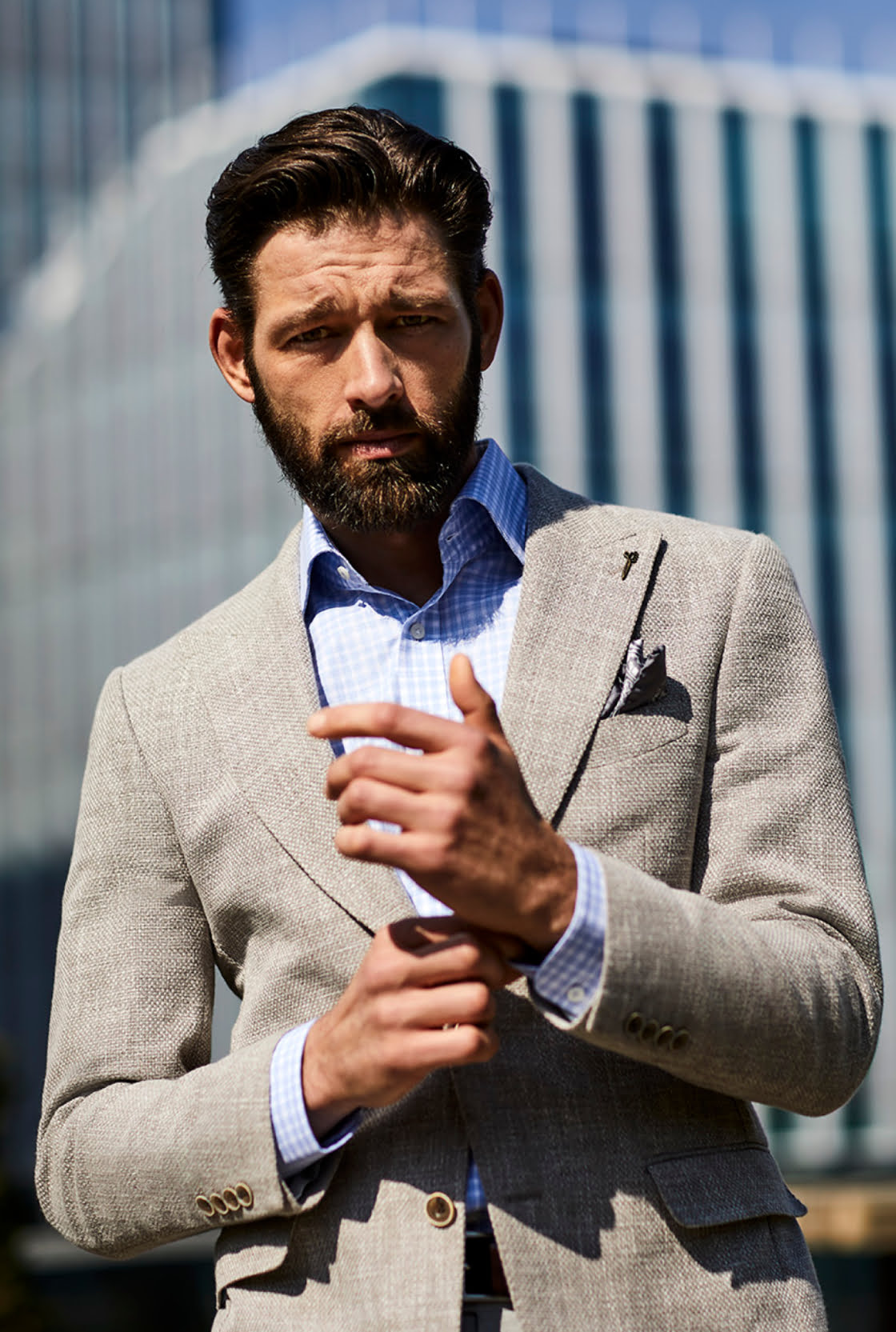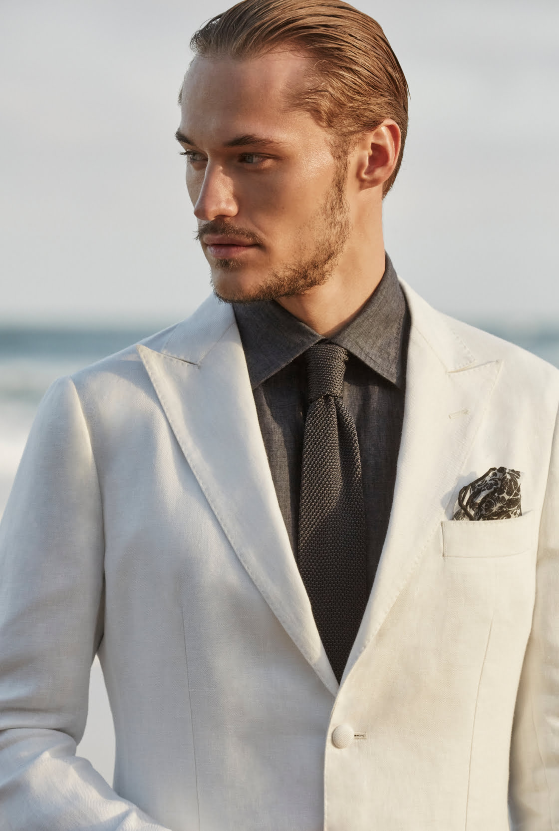 MJ Bale Hamilton Linen Jacket $299, Darley Knitted Tie $79.95, Benito Linen Shirt $129.95 & Maui Pocket Square $39.95. Shop online at MJ Bale.