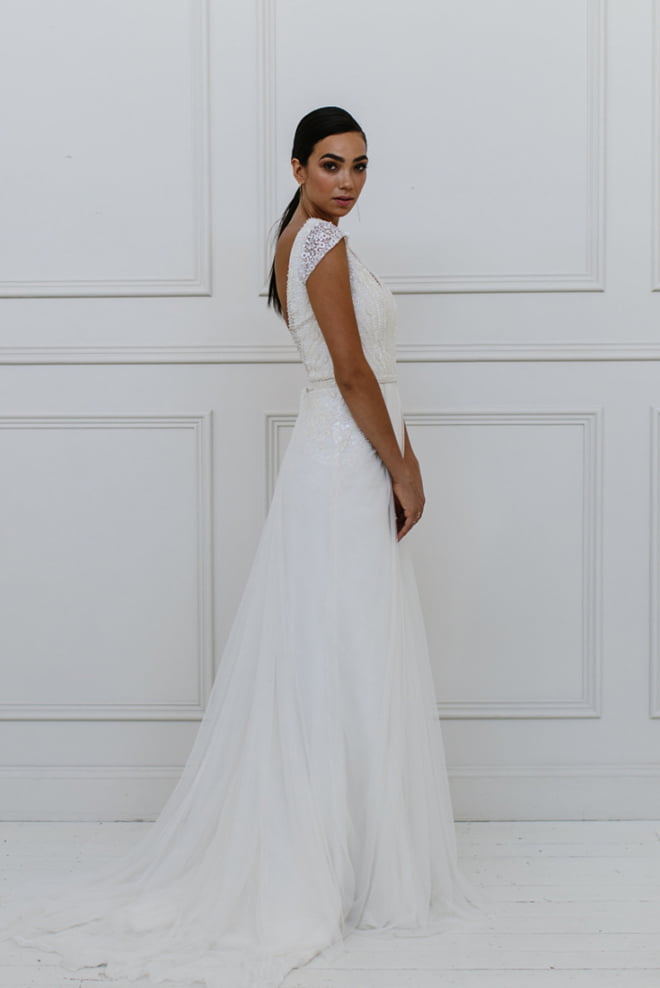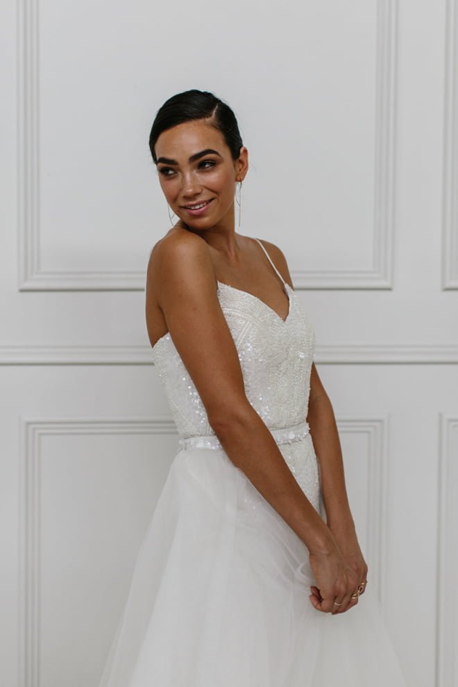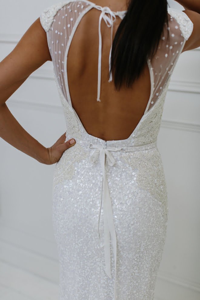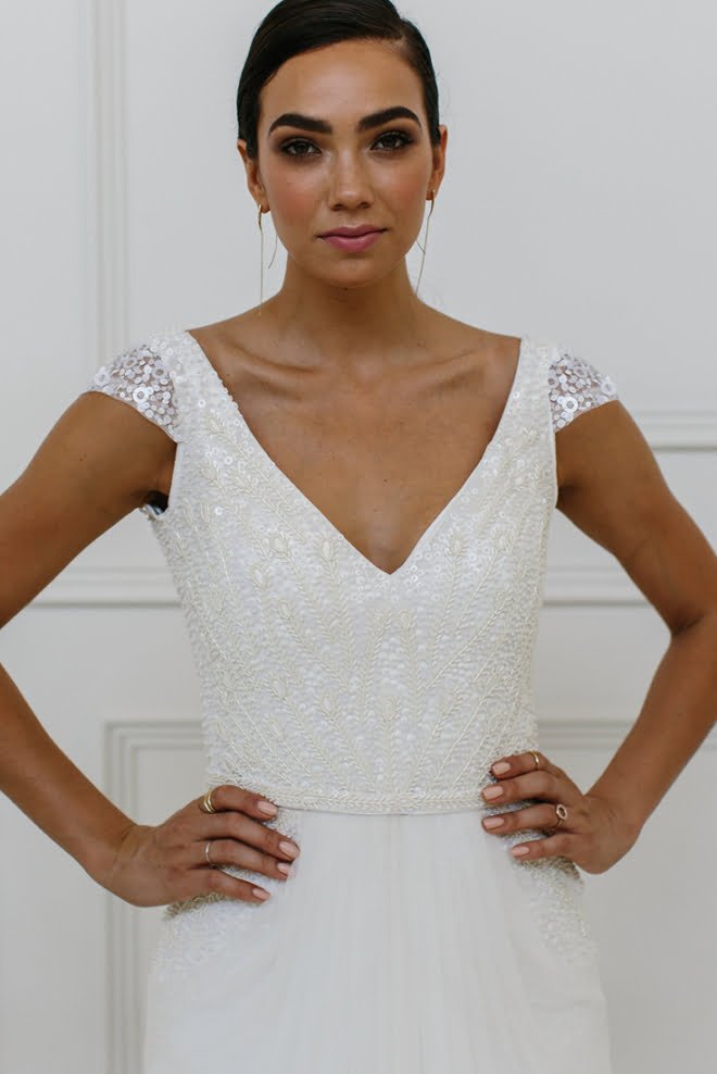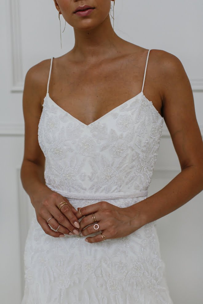 Feather beaded bodices trickle into swaths of sheer tulle, slinky sheaths beaded from head to toe fall to the floor with weight and necklines are simple and refined, revealing stunning open backs and a gown that that is effortlessly elegant at every angle. Each dress is designed in Australia then hand beaded and crafted in India, allowing for an exceptional level of detail and we’ve come to expect from a Karen Willis Holmes design.