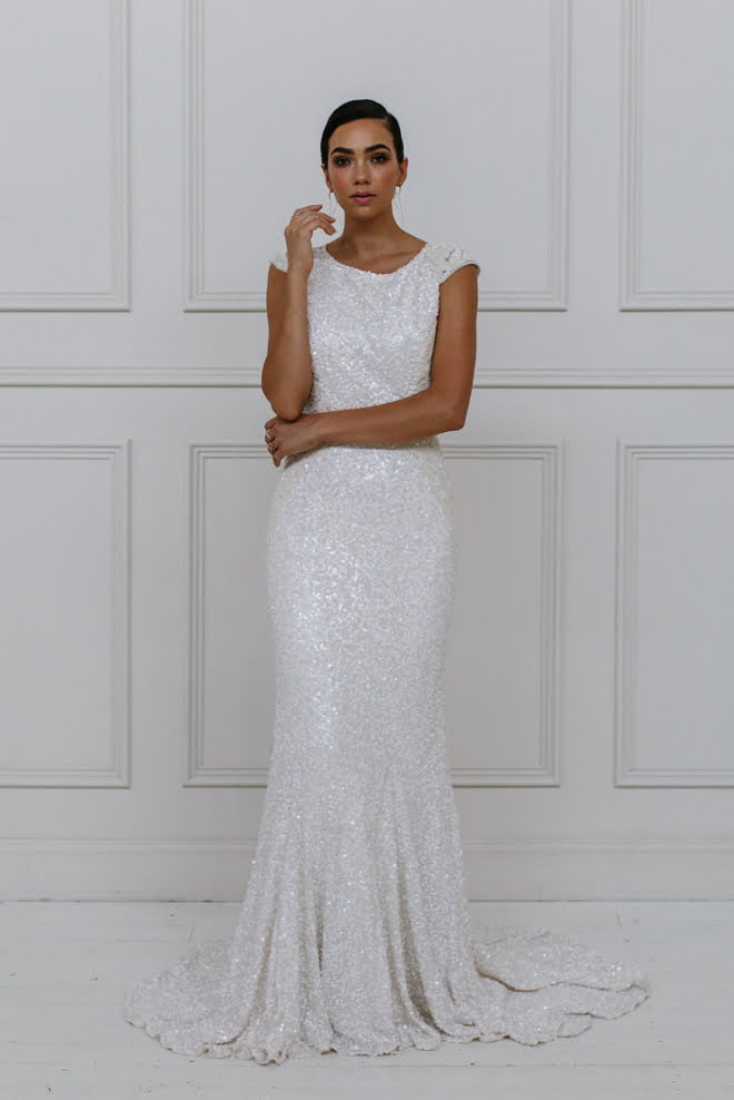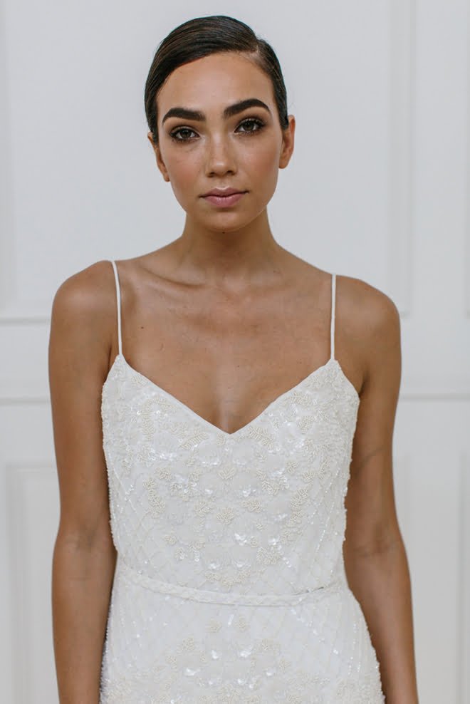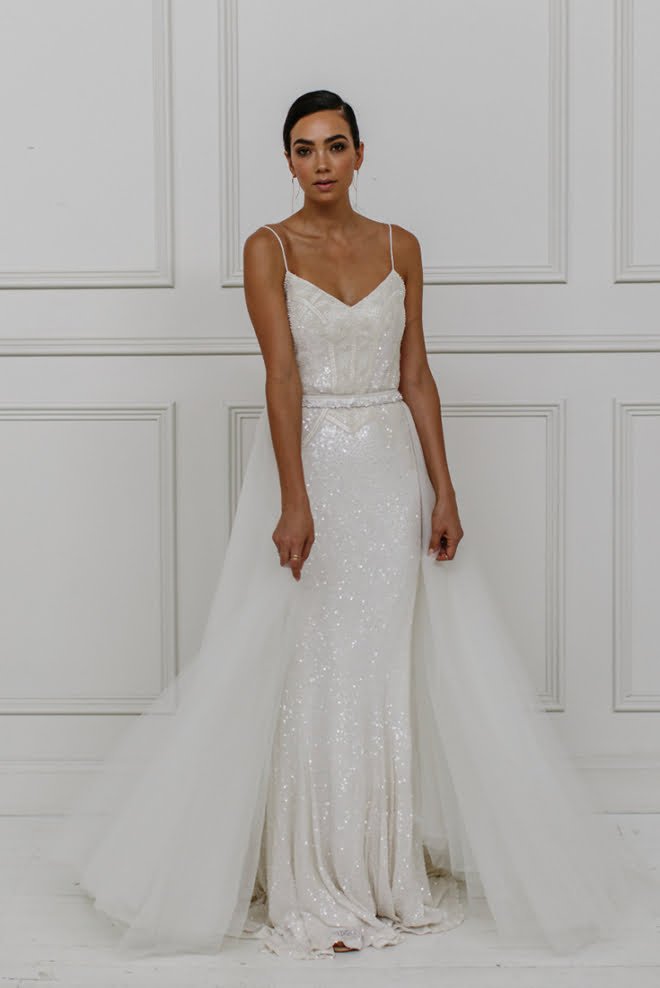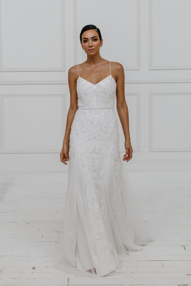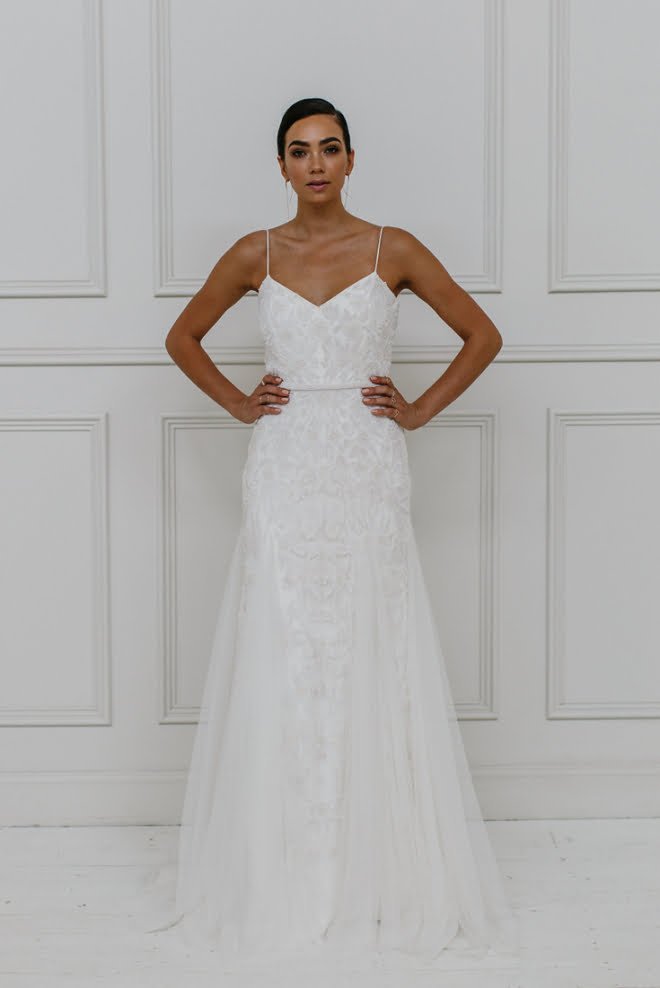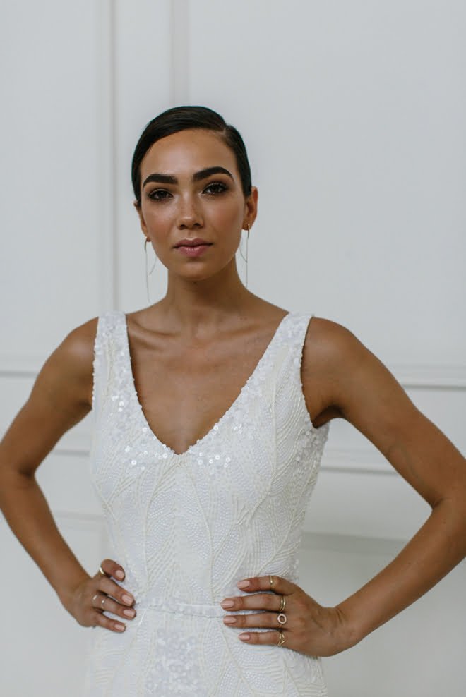 Feather beaded bodices trickle into swaths of sheer tulle, slinky sheaths beaded from head to toe fall to the floor with weight and necklines are simple and refined, revealing stunning open backs and a gown that that is effortlessly elegant at every angle. Each dress is designed in Australia then hand beaded and crafted in India, allowing for an exceptional level of detail and we’ve come to expect from a Karen Willis Holmes design.