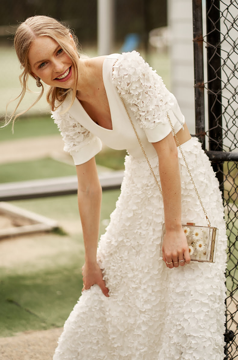 Baby I’m Yours Top, $899 and Skirt, $1999, White Meadow. Daisy Clutch, $120, Forever Soles. Fortune Gold Earrings, $99, Kitte.