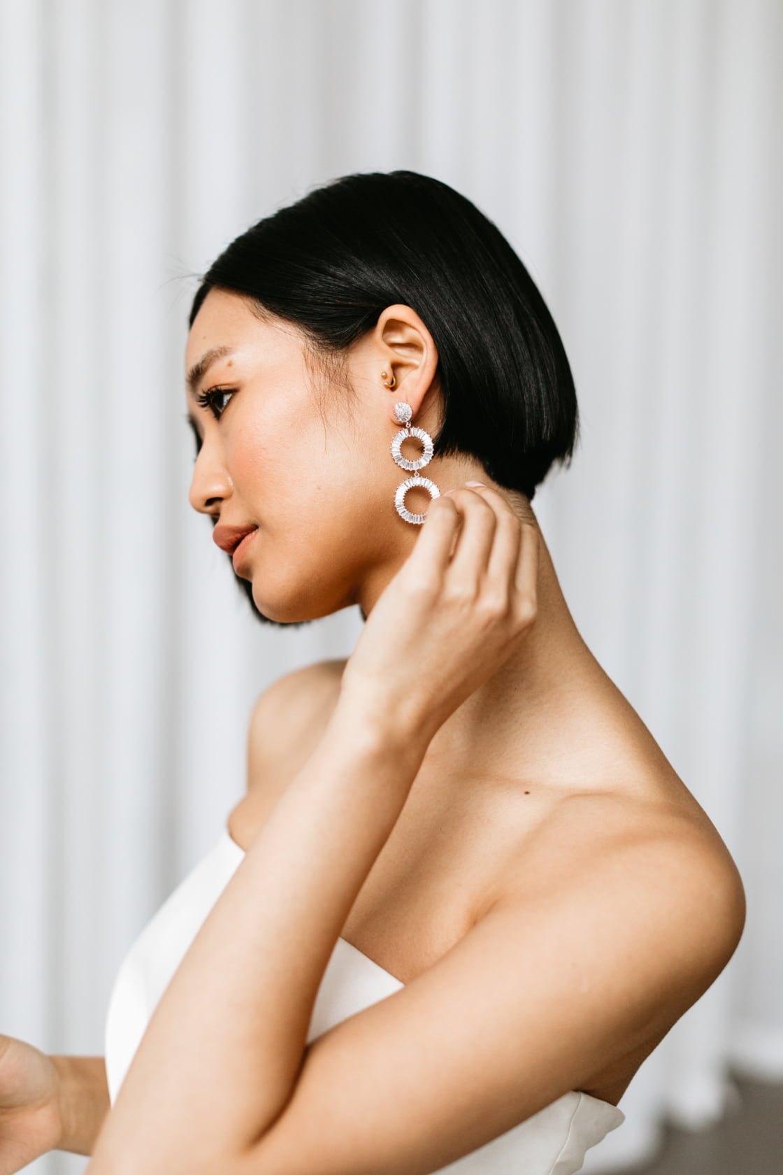 Where do you draw inspiration for your collections? In terms of our earrings, we actually don’t have what would normally be considered ‘collections’ as we prefer to see our pieces as one offering that we add to about once a year. A big driver when we design is to avoid fashion trends that will date and instead aim for pieces that will still look modern and beautiful when brides look back at their wedding photos in 50 years’ time. Another aim is to modernise wedding traditions that our brides feel are dated or tend to be ‘trinkety’. Our first mission was to modernise the ‘something new, something blue’ tradition and we answered it with a topaz stone set in an anklet that can be worn long after a wedding day.