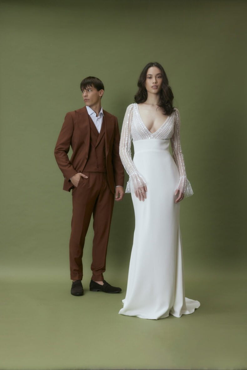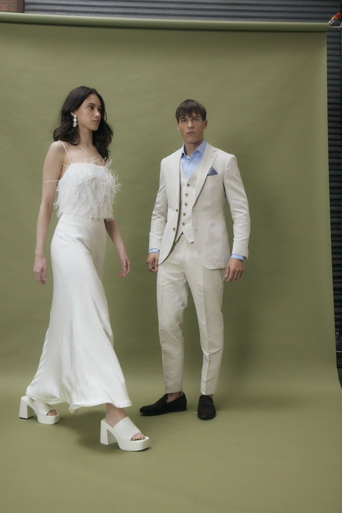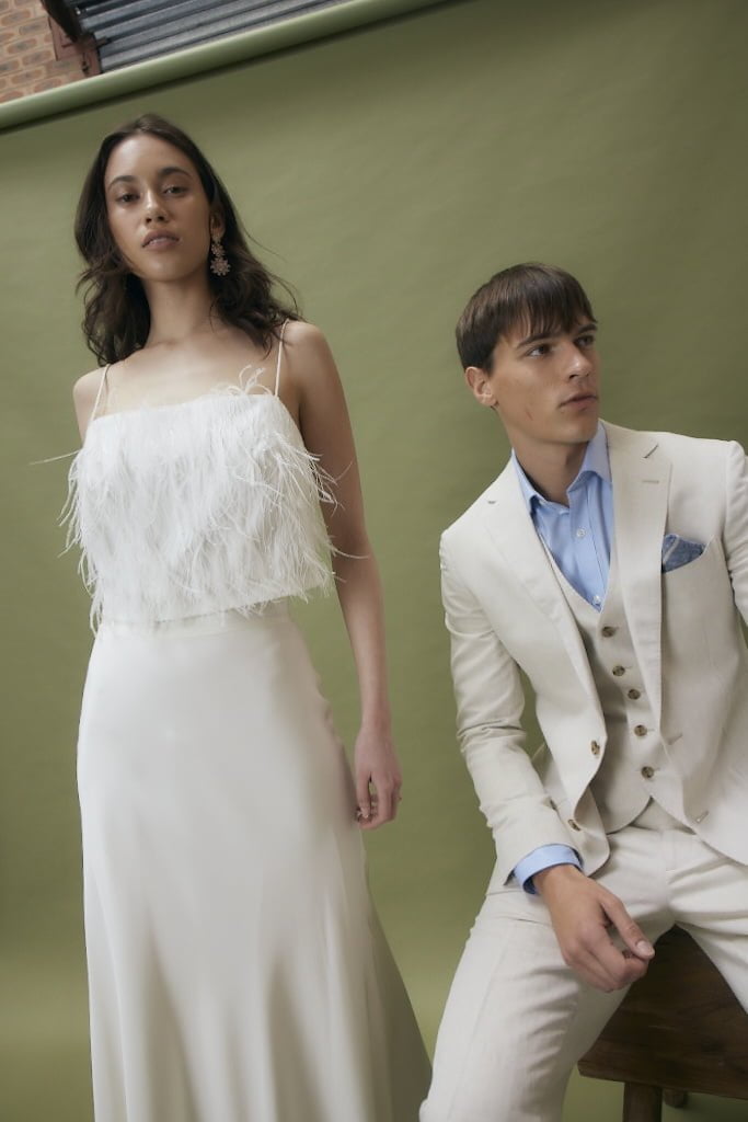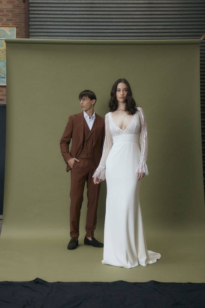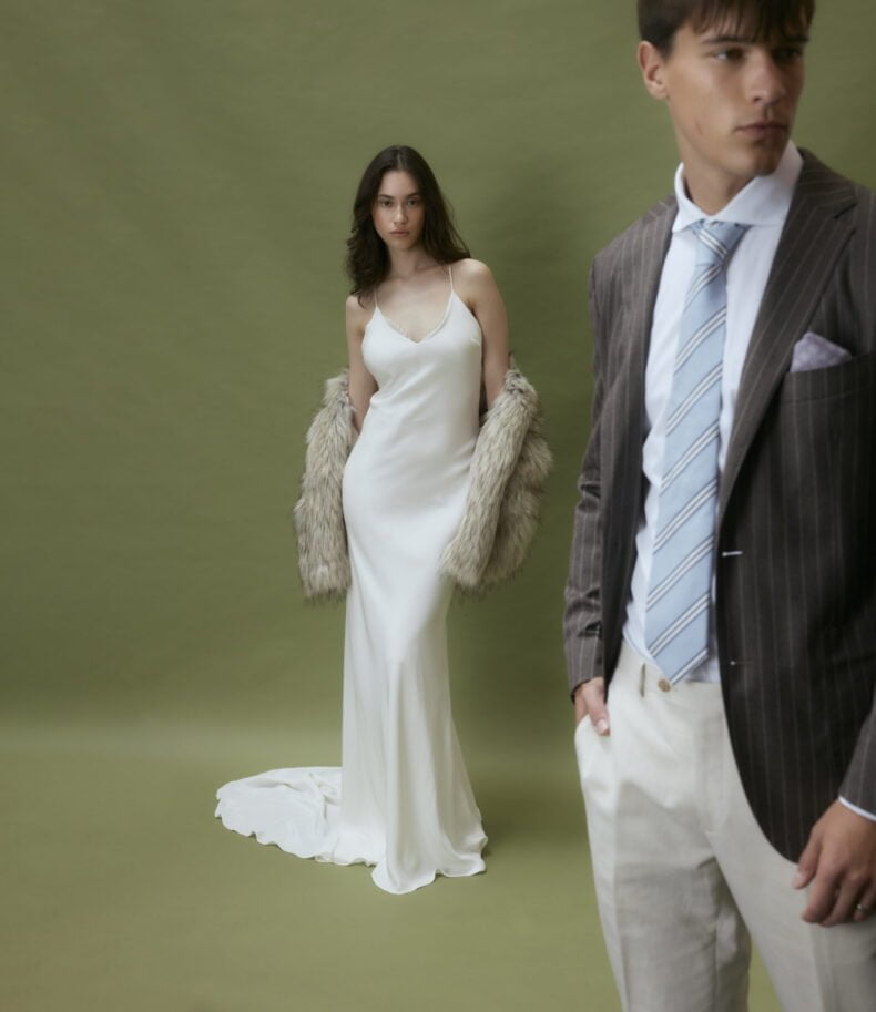 Our models, Mia and Matej, are absolute visions in Lola Varma and Theodore above with the fab Samantha Lee providing the glam for the day. But if these classic and chic looks aren’t calling you, never fear, we have you well covered with a tonne of fashion inspo below. There’s stunning pieces from all our faves – sleek simplicity courtesy of Grace Loves Lace, volume and dreamy detail from Luci Di Bella, as well as suave styling options for the fellas from our mates at M.J. Bale.