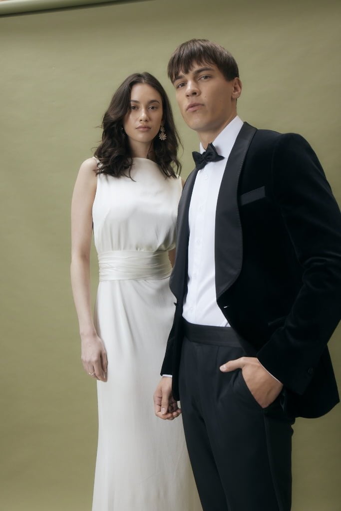 Matt: Dormeuil Barathea Ivory Jacket, $1650, Thomas Mason White Dinner Shirt, $299, Dormeuil Barthea Black Trouser, $1000, Florence Bow Tie, $149, Oscar Hunt. Barium Shoes, $339, Bared Footwear.