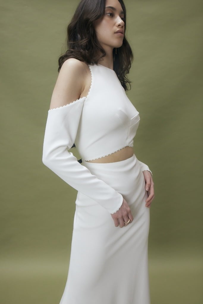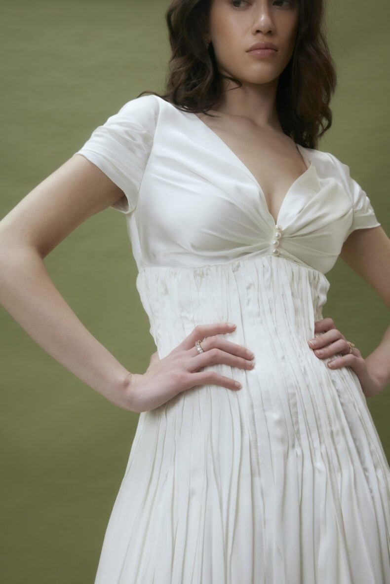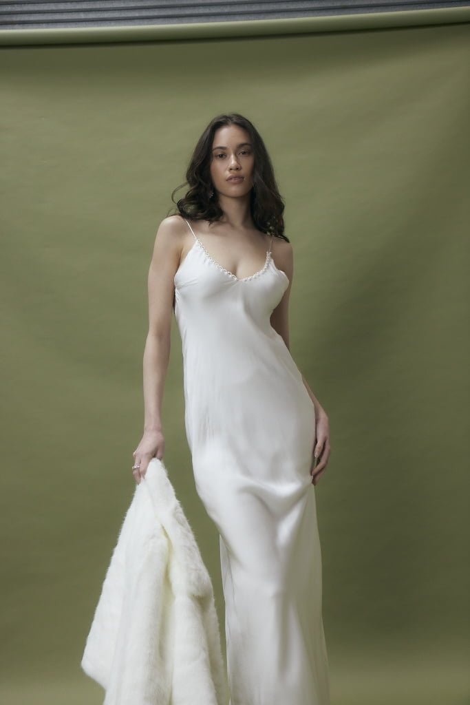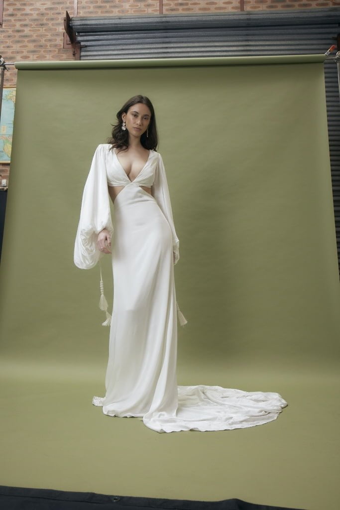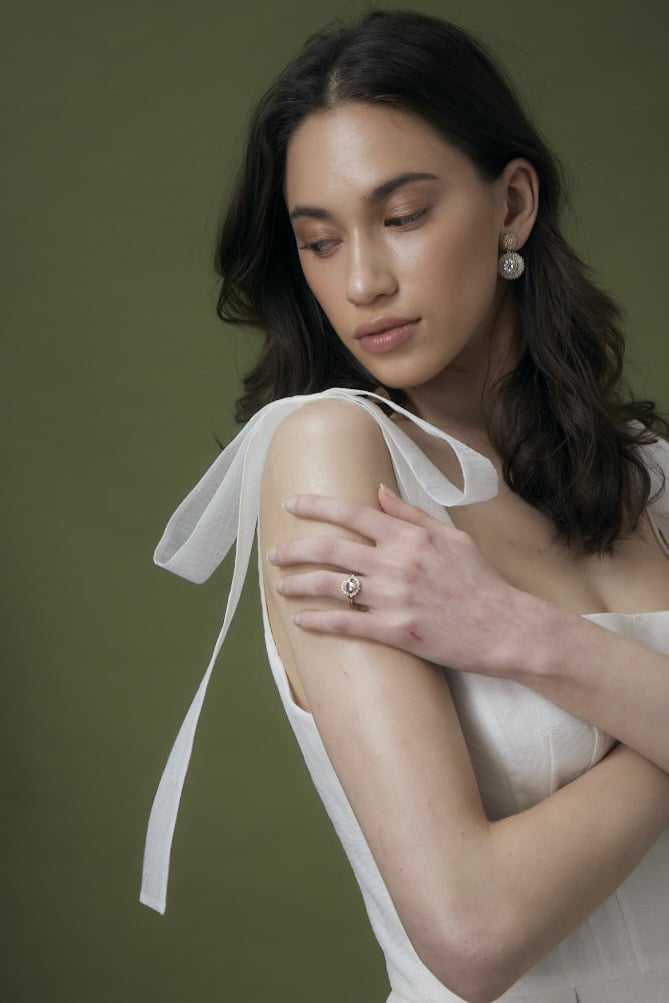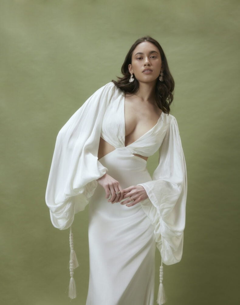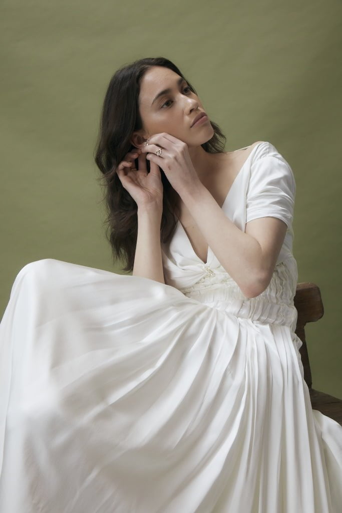 Mia: Dane Gown, $POA, Lola Varma. Kendra Earrings, $159, Amelie George Bridal.