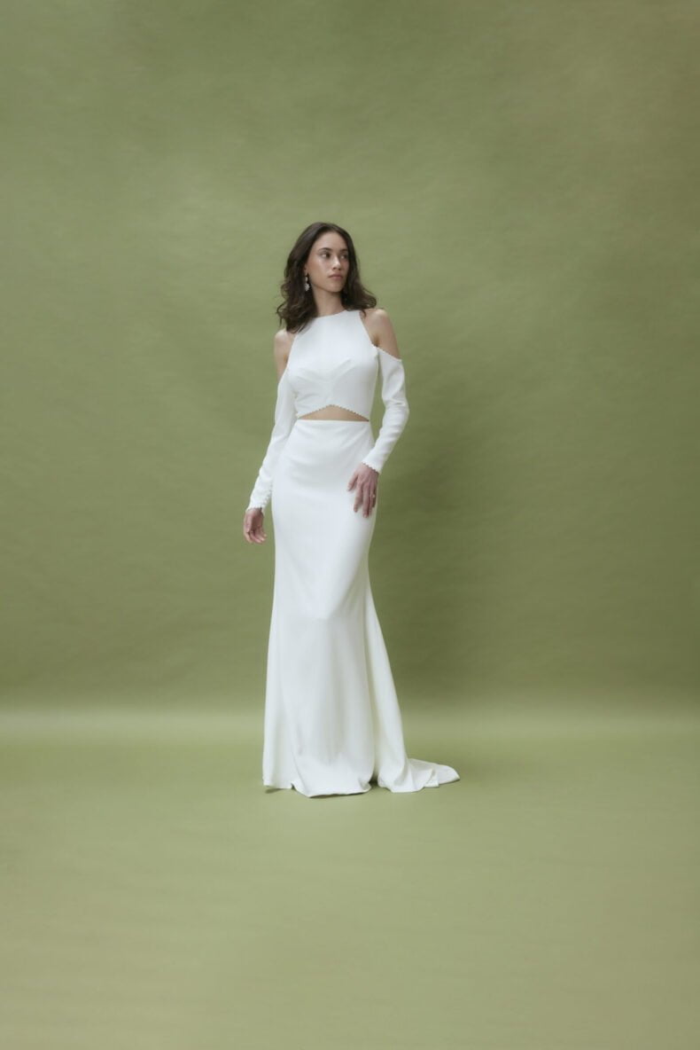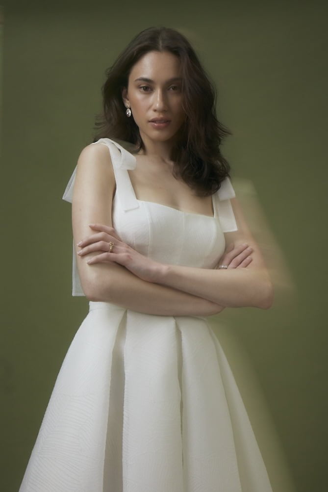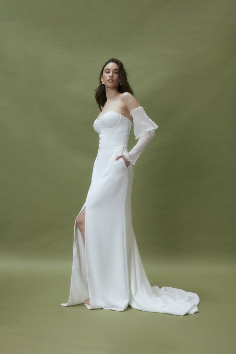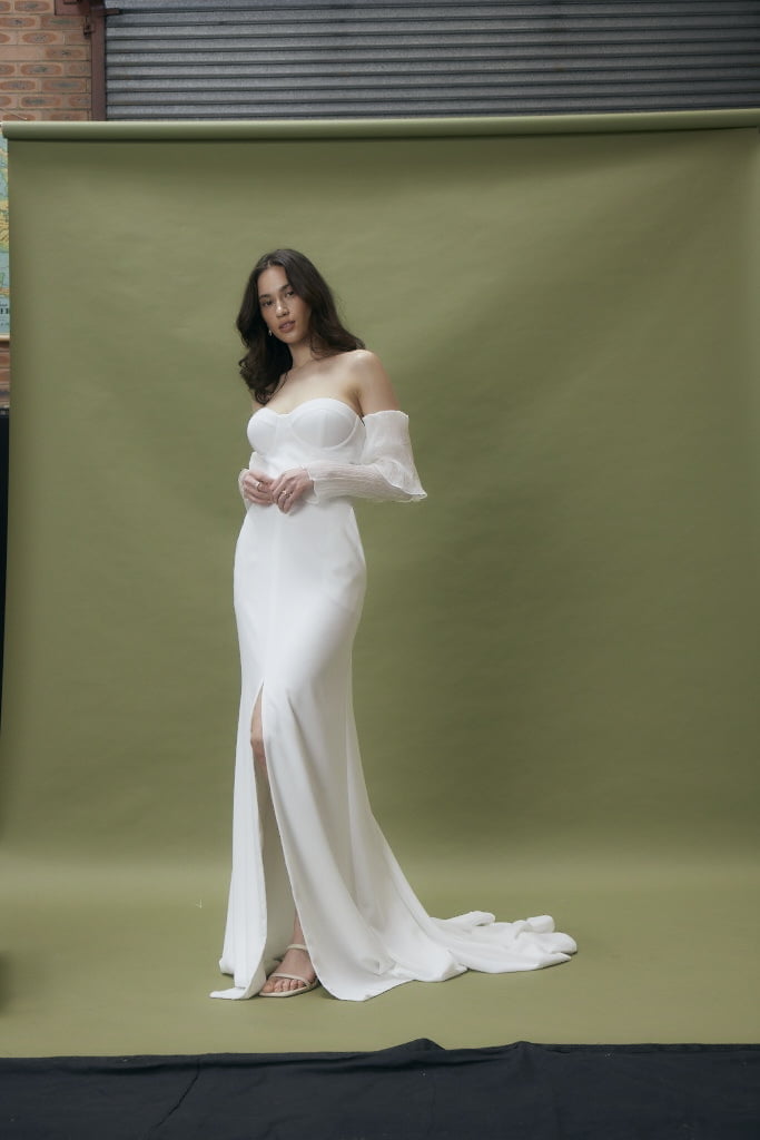 Mia: Atelier Blanche, Paula Gown, $POA, Carte Blanche Bride. Kendra Earrings, $159, Amelie George Bridal.