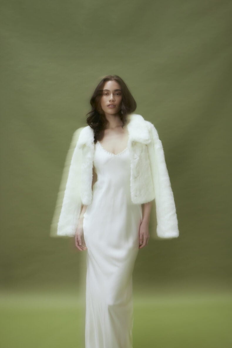 Sloane Gown, $3800, By Kinsman. Tirage Cropped Jacket in Blanc, $389, Unreal Fur. Kendra Earrings, $159, Amelie George Bridal.