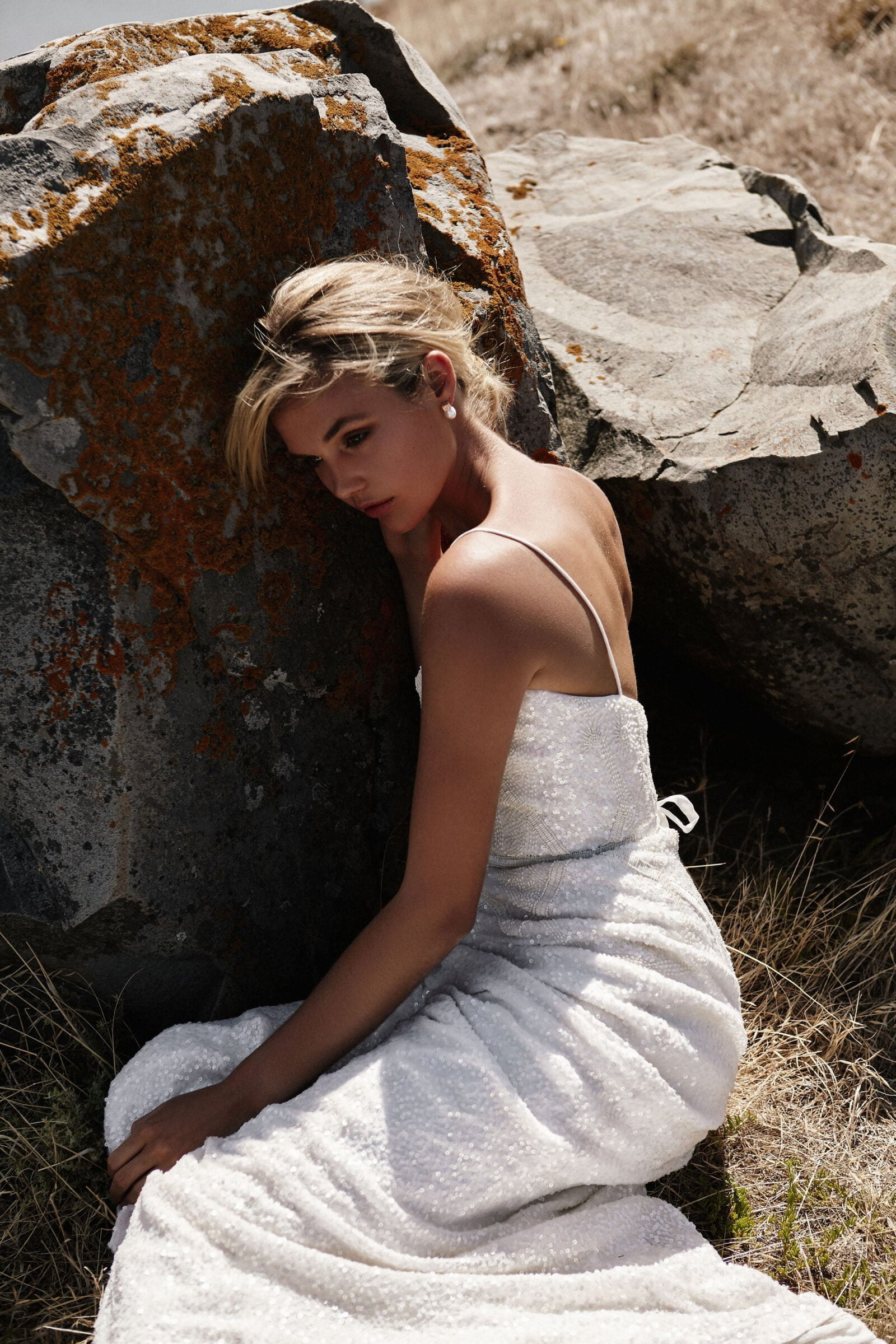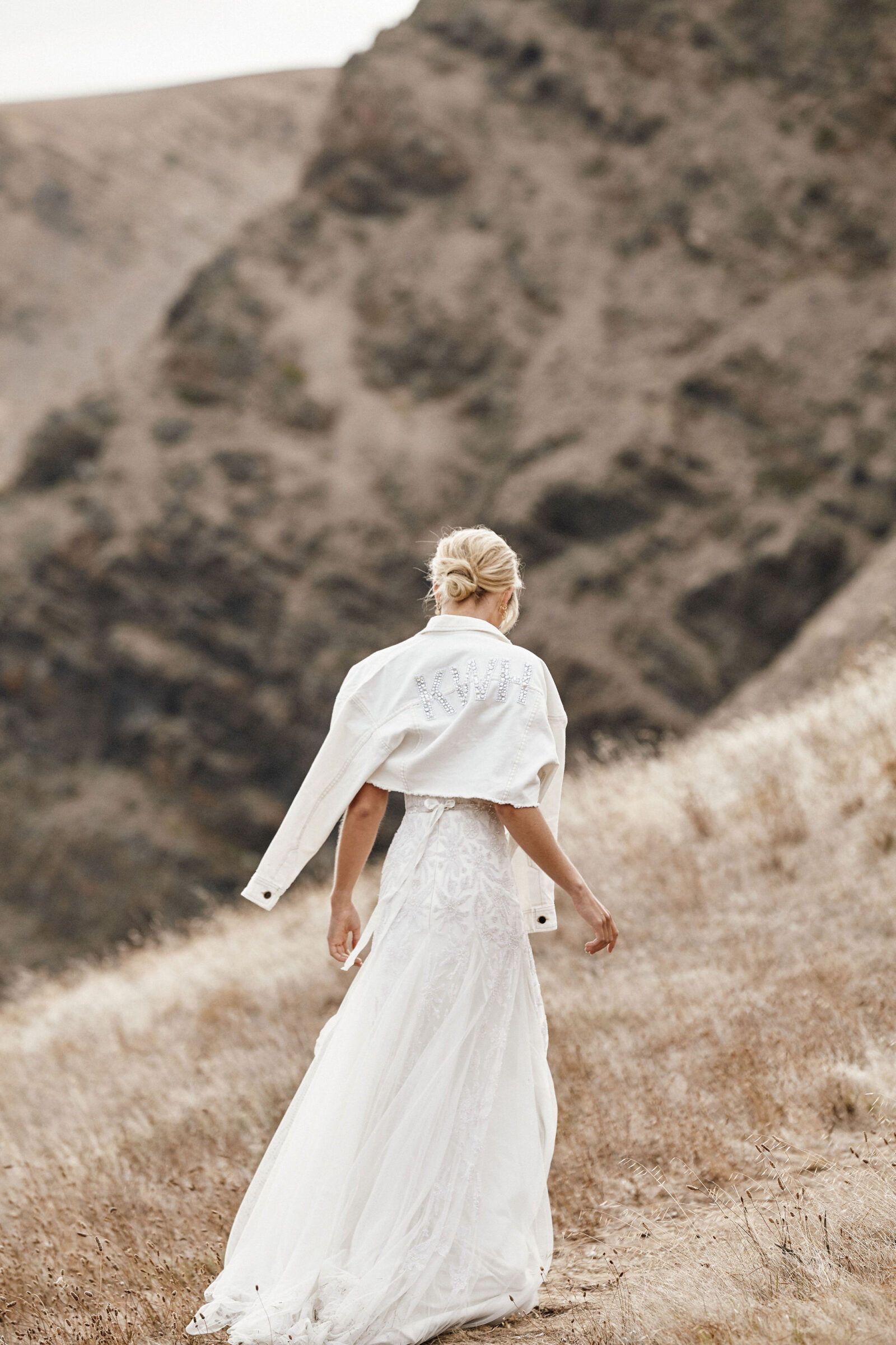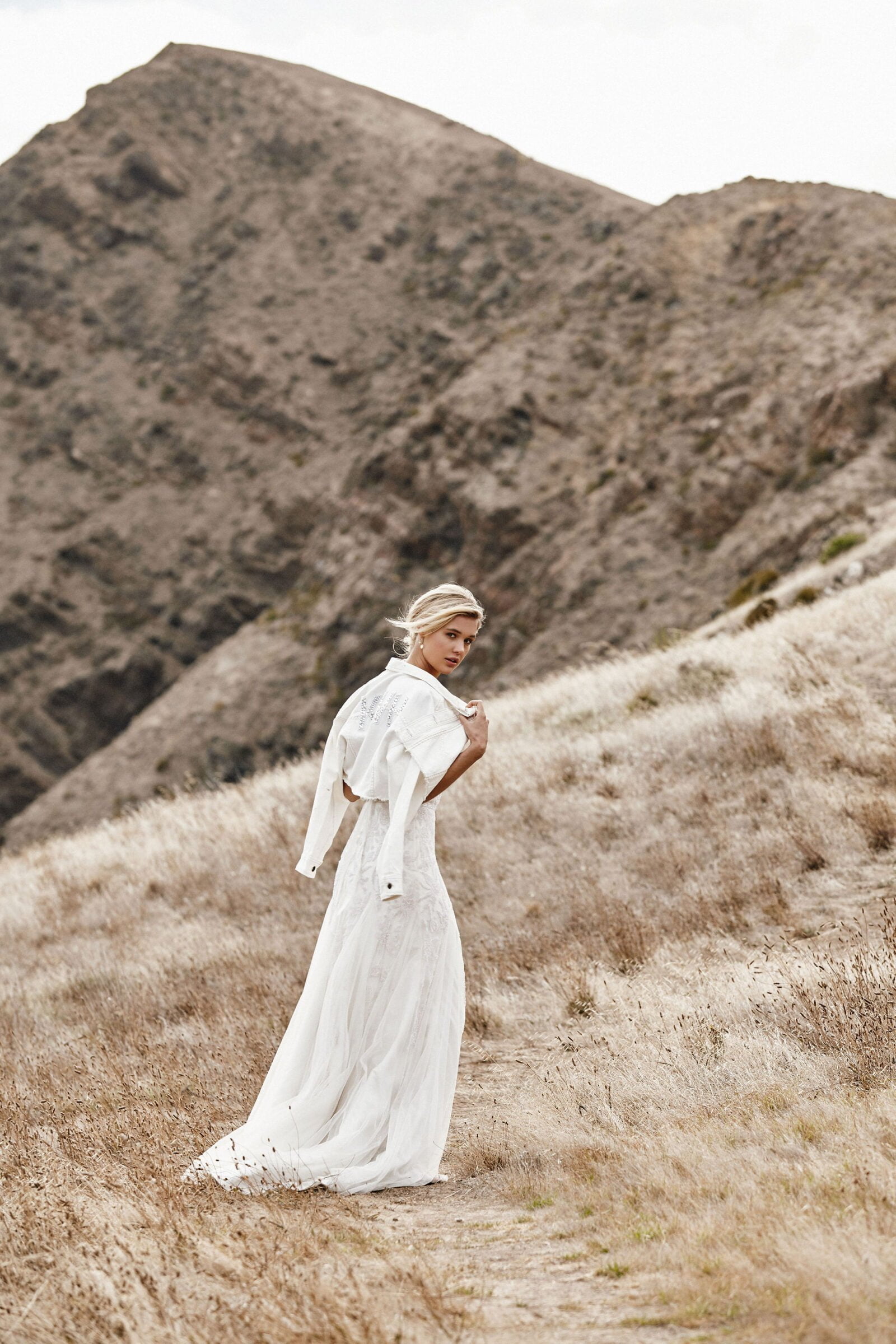 CREDITS // Photographer Gretl Watson-Blazewicz Gowns Karen Willis Holmes Earrings Amelie George Bridal Hair & Makeup Kelly Allison Model Laura de Wit via PRIDE Models Location Second Valley South Australia Custom Denim Jacket The Parker