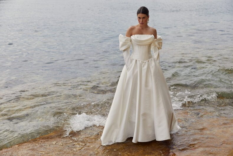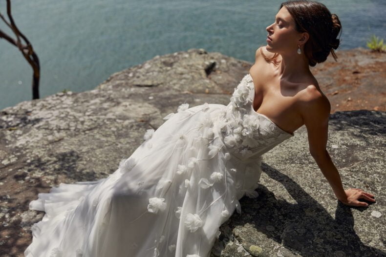 “A collection of gowns true to my couture heritage, the Parsley Bay BESPOKE Collection represents the cool, and effortless Australian lifestyle we all enjoy,” Karen shares. “With a heightened touch of luxury, I explored intricate embroidery, delicate laces, statement 3D elements and sculptural art to create these wedding dresses.”