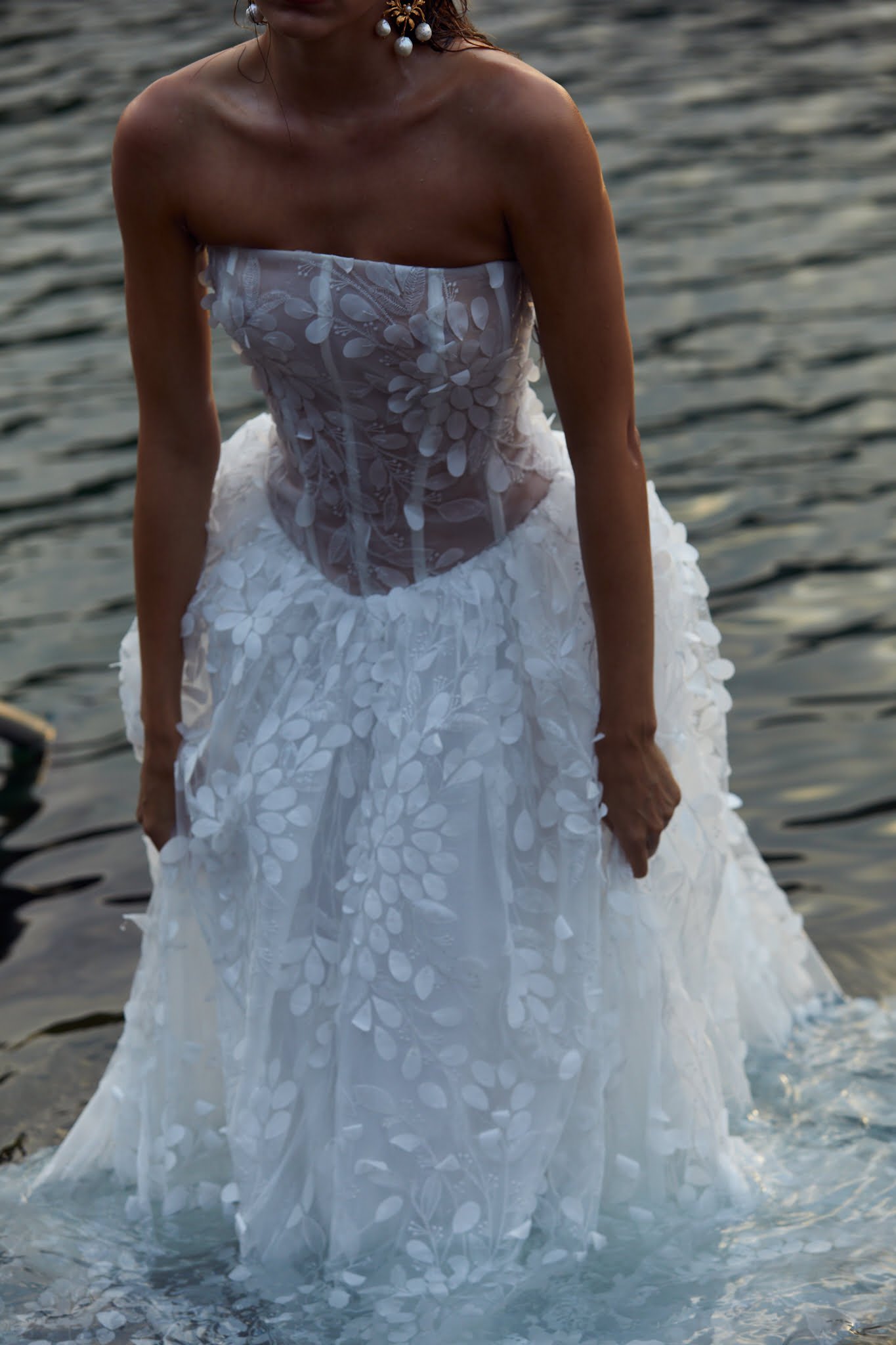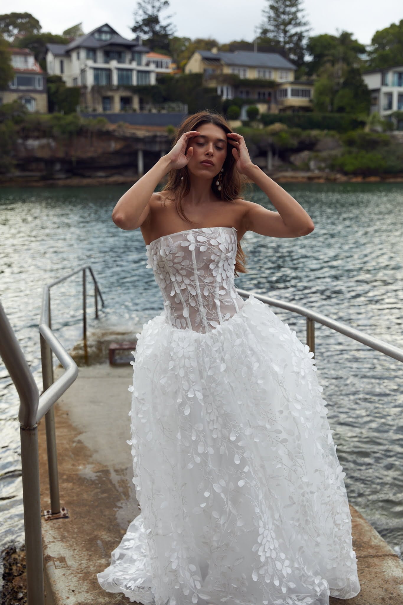 “A collection of gowns true to my couture heritage, the Parsley Bay BESPOKE Collection represents the cool, and effortless Australian lifestyle we all enjoy,” Karen shares. “With a heightened touch of luxury, I explored intricate embroidery, delicate laces, statement 3D elements and sculptural art to create these wedding dresses.”
