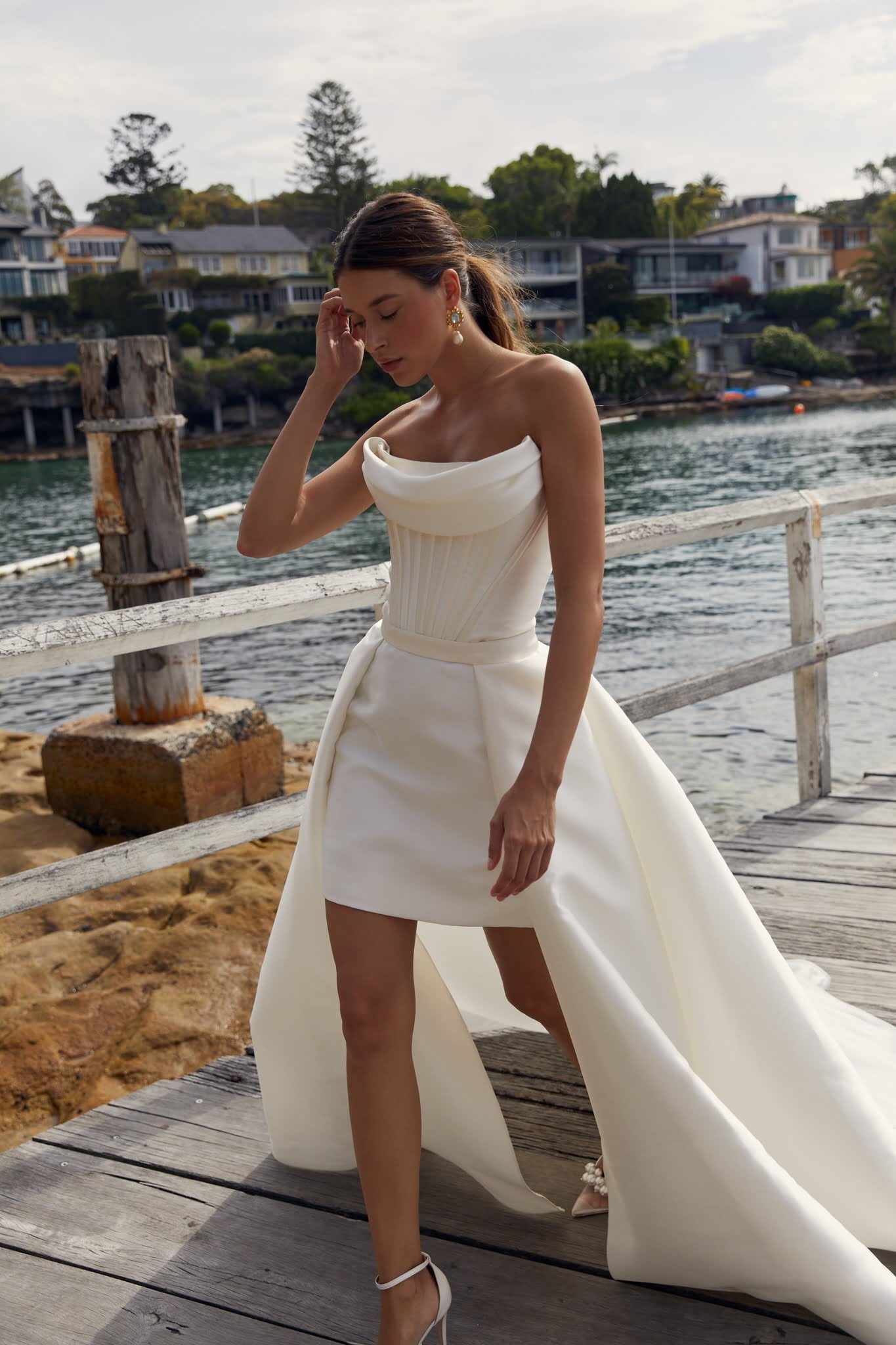 We are low-key obsessed with each and every piece in the Parsley Bay range, but there are a few gowns that we truly feel deserve a special shoutout… like Bailey, with her stunning 3D floral embroidery that sparkles at all angles and that floaty and femme silhouette. We can’t go past the Ines Bodice and the Avery Skirt either, pared with the Lindy Train like above. D.R.E.A.M.Y! The on-trend sculptural bow, against the flattering and figure-hugging sequinned skirt is an epic combo in our books. We are also totally swooning over the Evie & Neve Mini – this daring structural number is the epitome of classic with just the right amount of modern flair. Ideal for all our bold babes.
