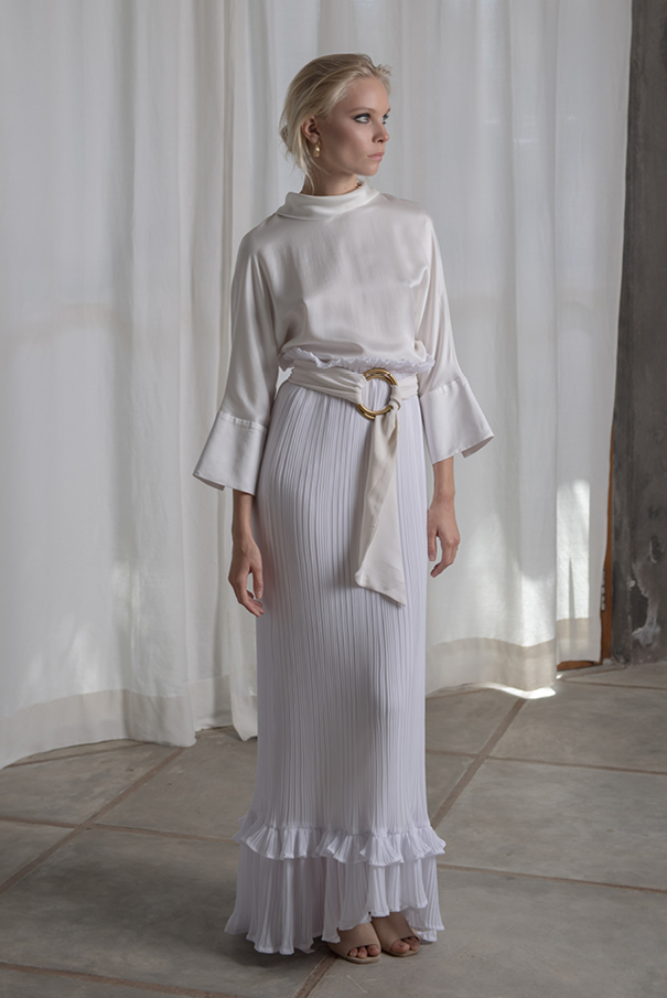 With a focus on minimalism and gentle romance, these slinky silhouettes meet a refreshing burst of 60’s inspired detailing, like the tortoiseshell buttons of the Parisi Gown (an HM office crowd pleaser), or the Beverly Belt, a stunning ode to the era of disco chi – and a gorgeous accompaniment to the variety of top/skirt combos.