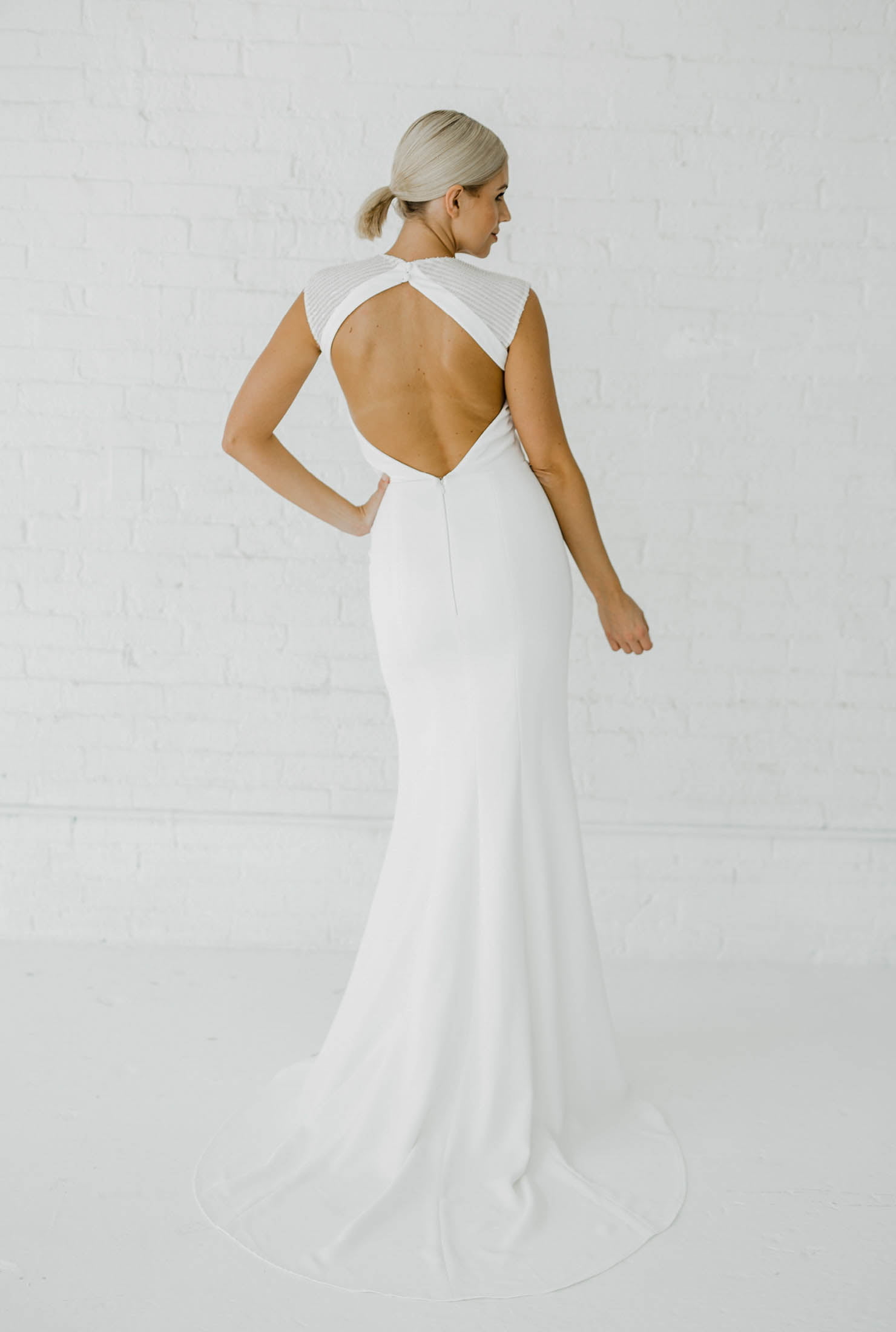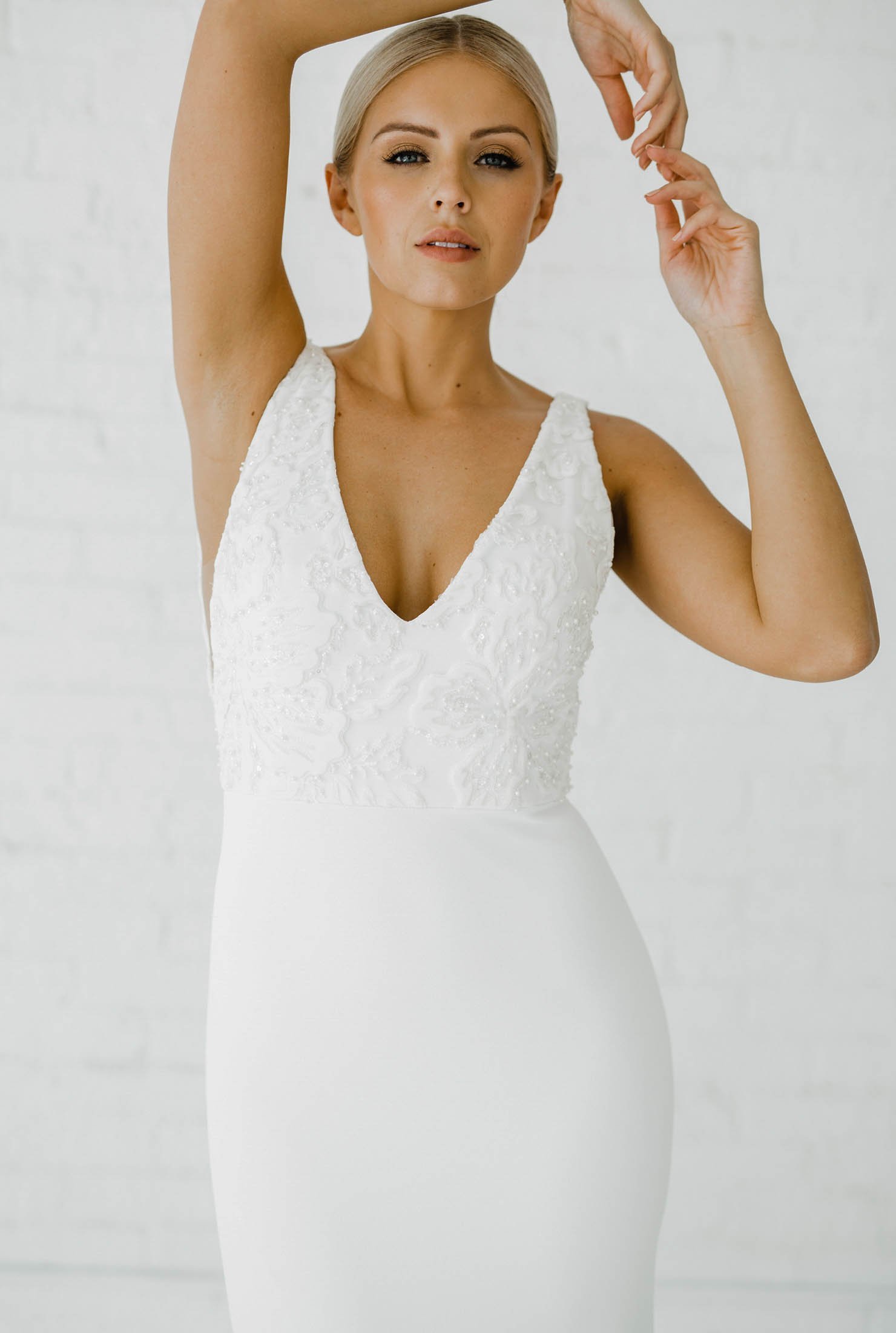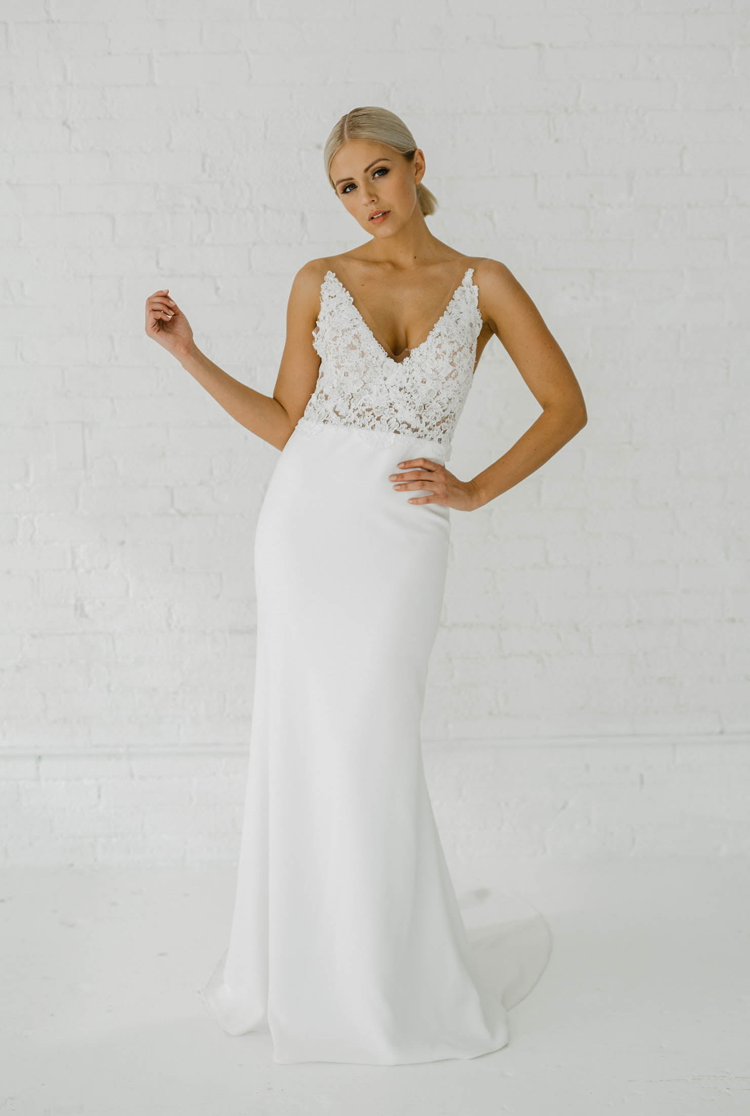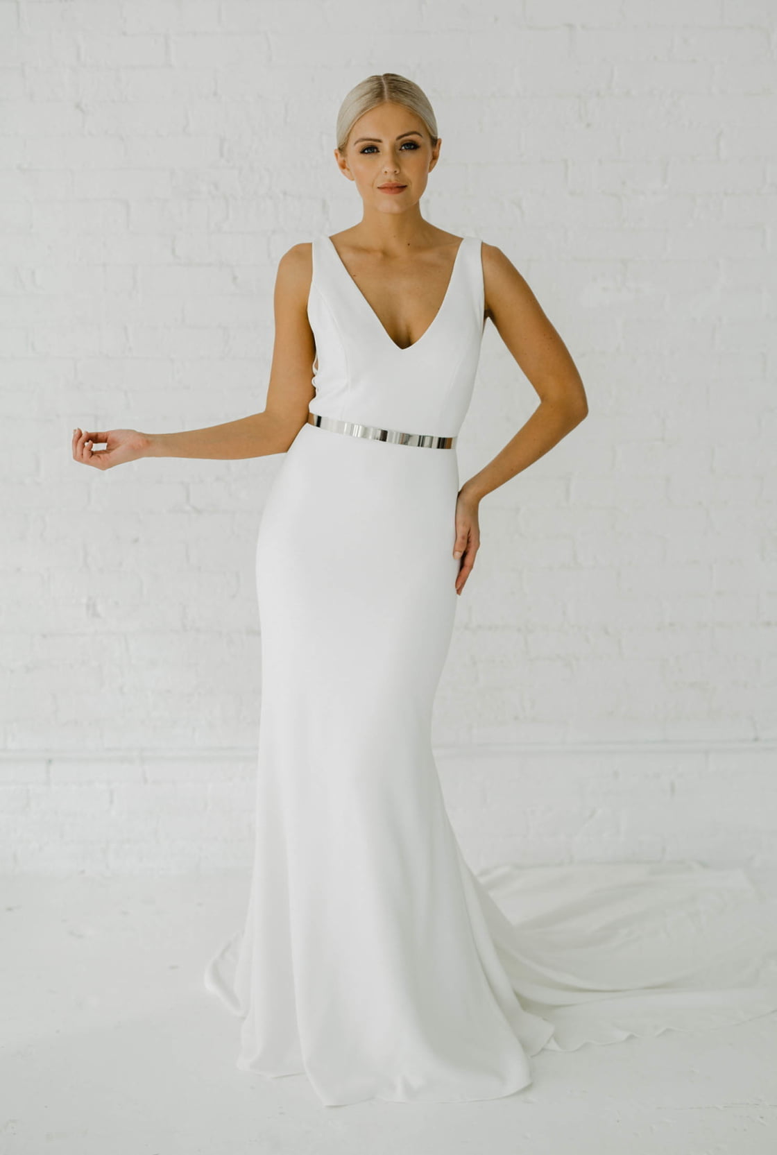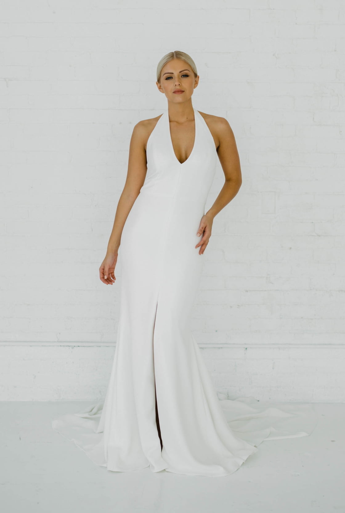 Amy, owner of Love Marie Bridal Boutique (in Camden, NSW) says the designer is most known for her chic crepe gowns. “The fit is perfect! They hug the booty just how you want them to and hide those funny underarm bits that no one likes!”