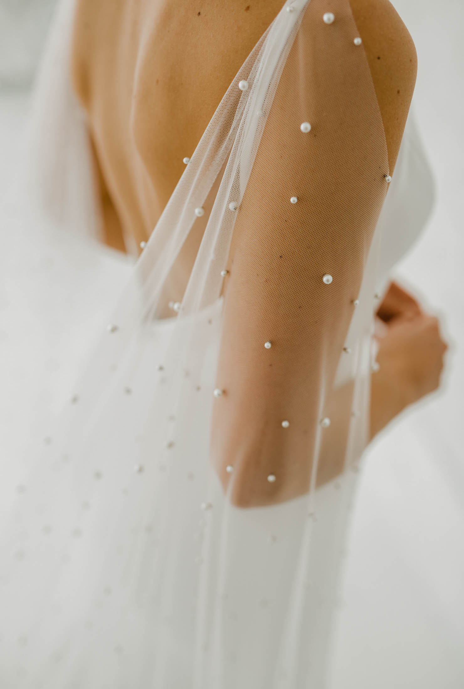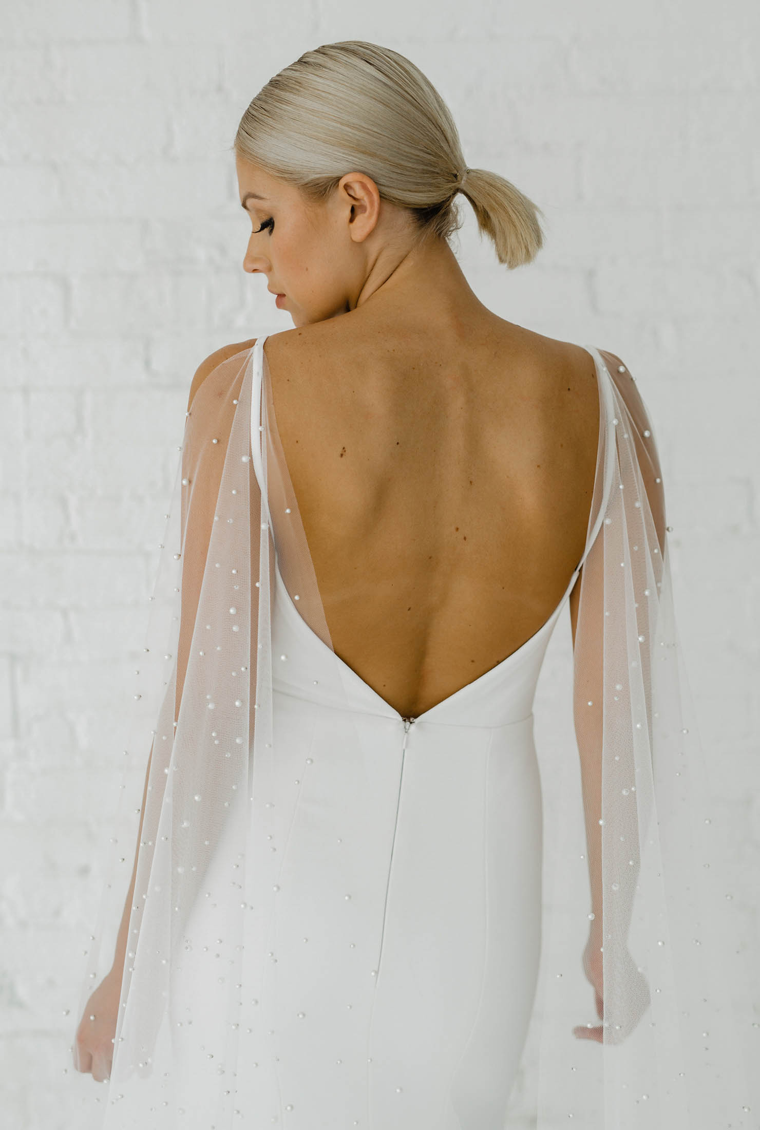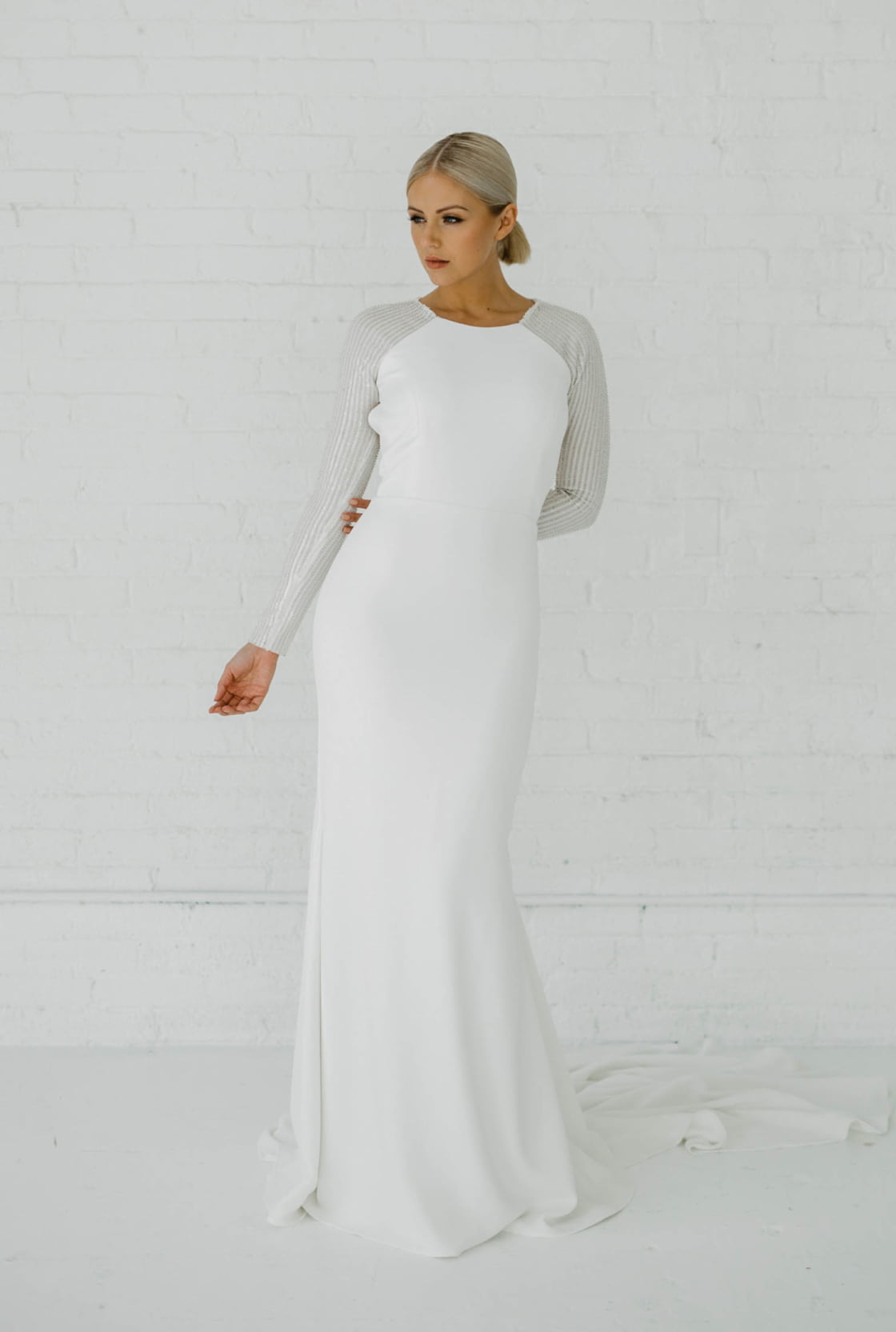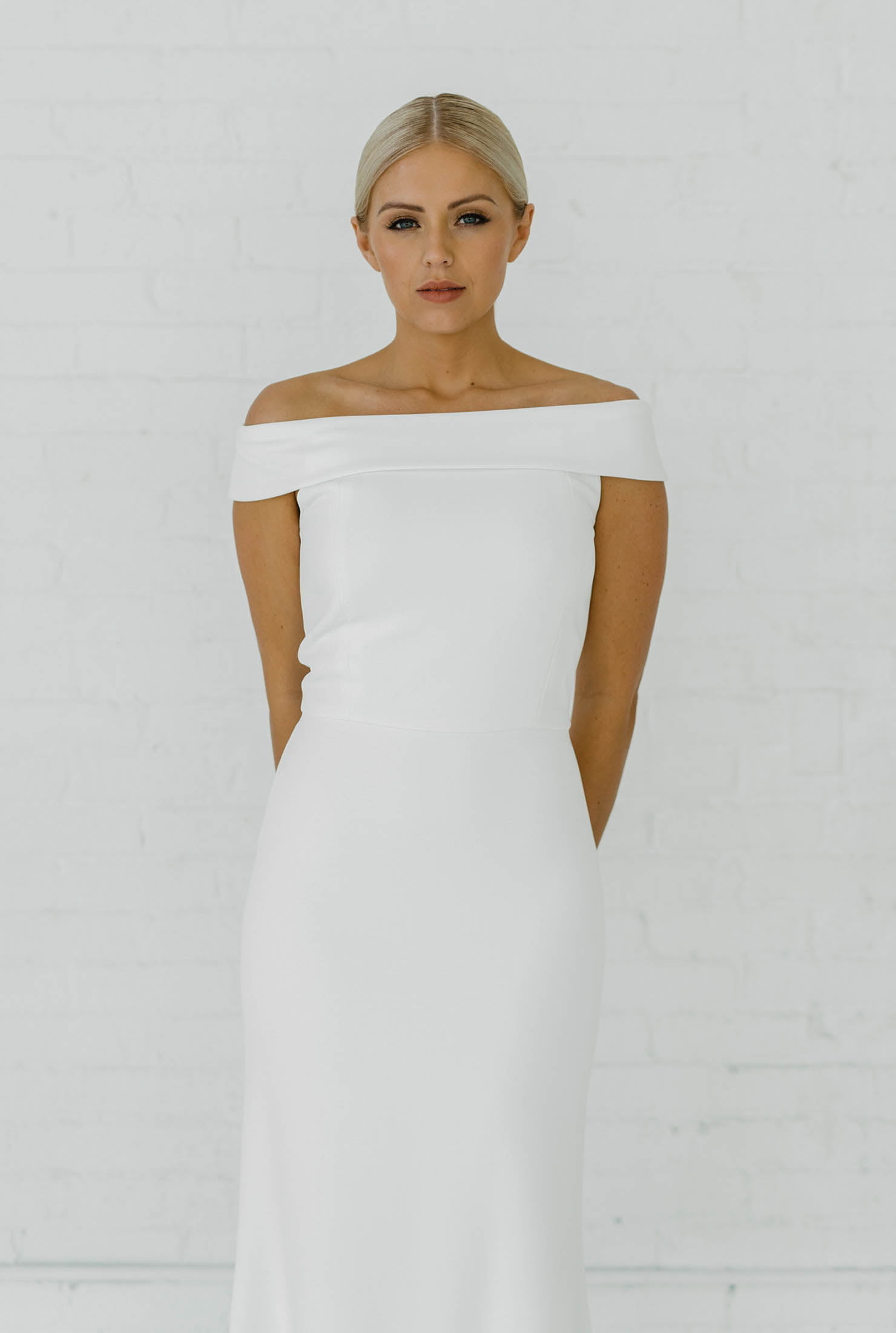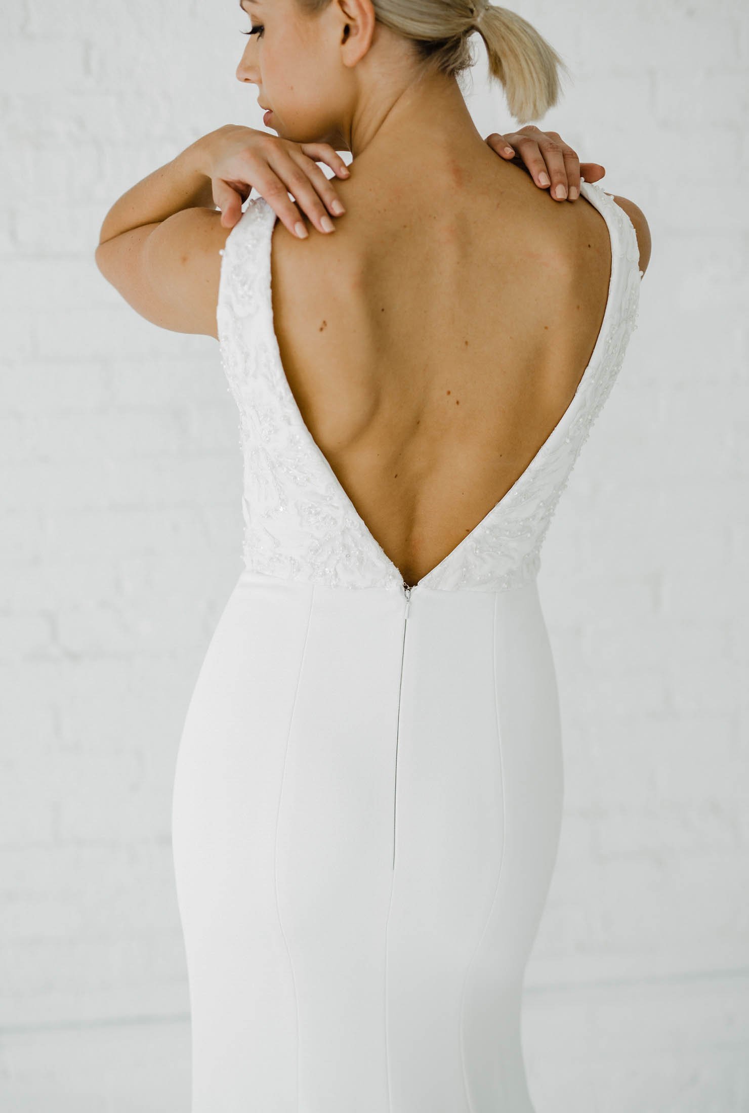 Amy, owner of Love Marie Bridal Boutique (in Camden, NSW) says the designer is most known for her chic crepe gowns. “The fit is perfect! They hug the booty just how you want them to and hide those funny underarm bits that no one likes!”
