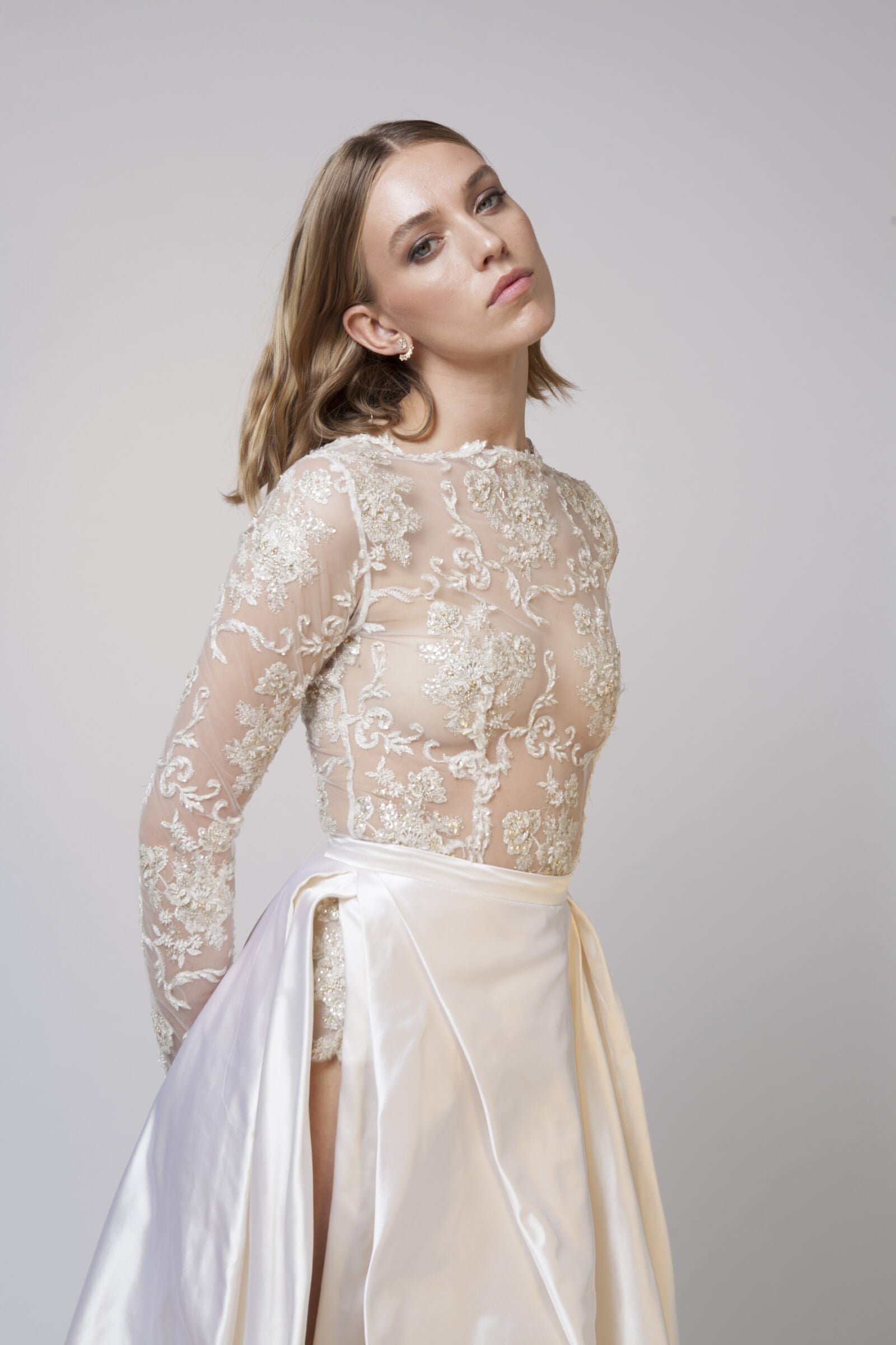 Dresses for days (there’s over 15 different gowns below) with back, front and side shots, that not only ensure you see every inch of the gowns, but show off a couple of their options too- sleeve/ no sleeve/ detachable skirt, etc. Layered lace, silk satin and intricate beading are just a few of the details that create what is special about Incarnation. The collection is made up of Ready to Wear and Made to Measure, and the quality is second to none.