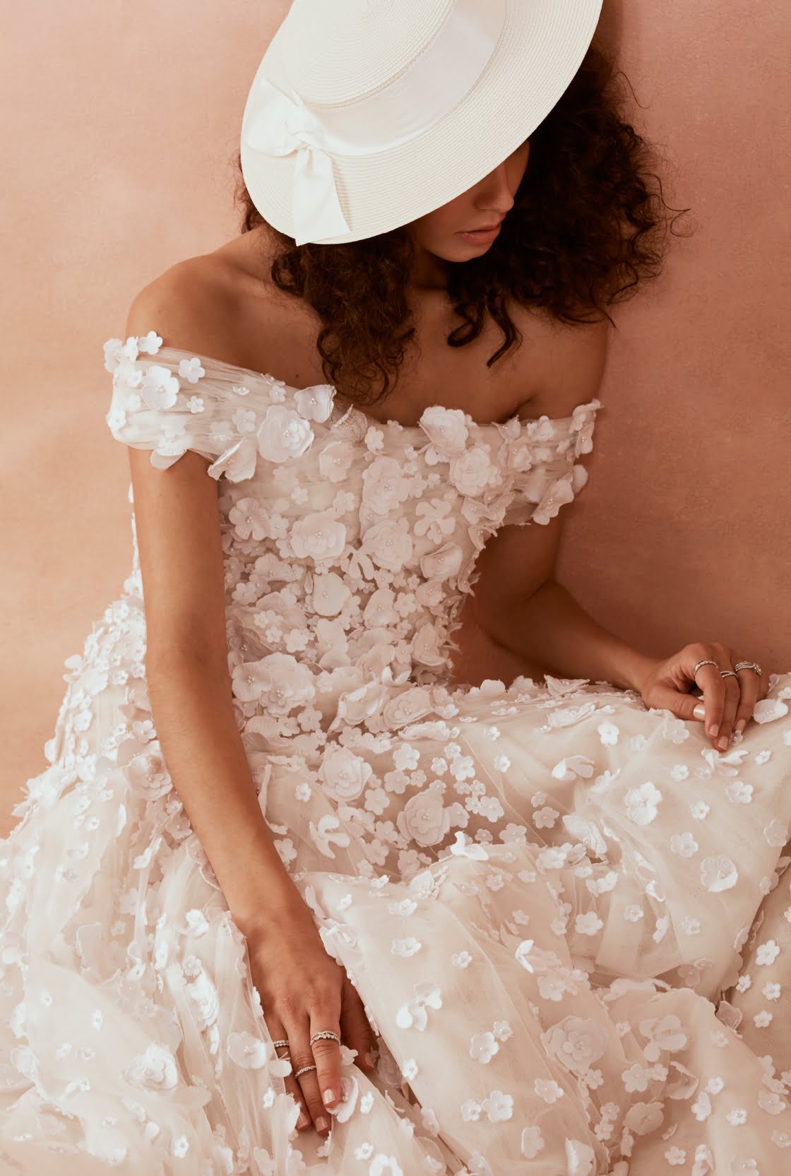 Valentina Gown, $6145, Prea James Bridal. PP Boater with G.Grain Side Twist, $79.95, Morgan & Taylor.