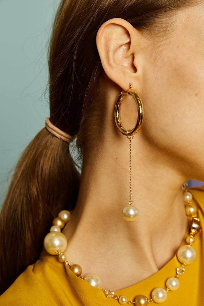 Natasha Schweitzer Double Drop Hoop Earrings with Pearl in Silver, $510, shop online at Natasha Schweitzer and Pearl Ring 9k Yellow Gold, $400, shop online at Natasha Schweitzer.