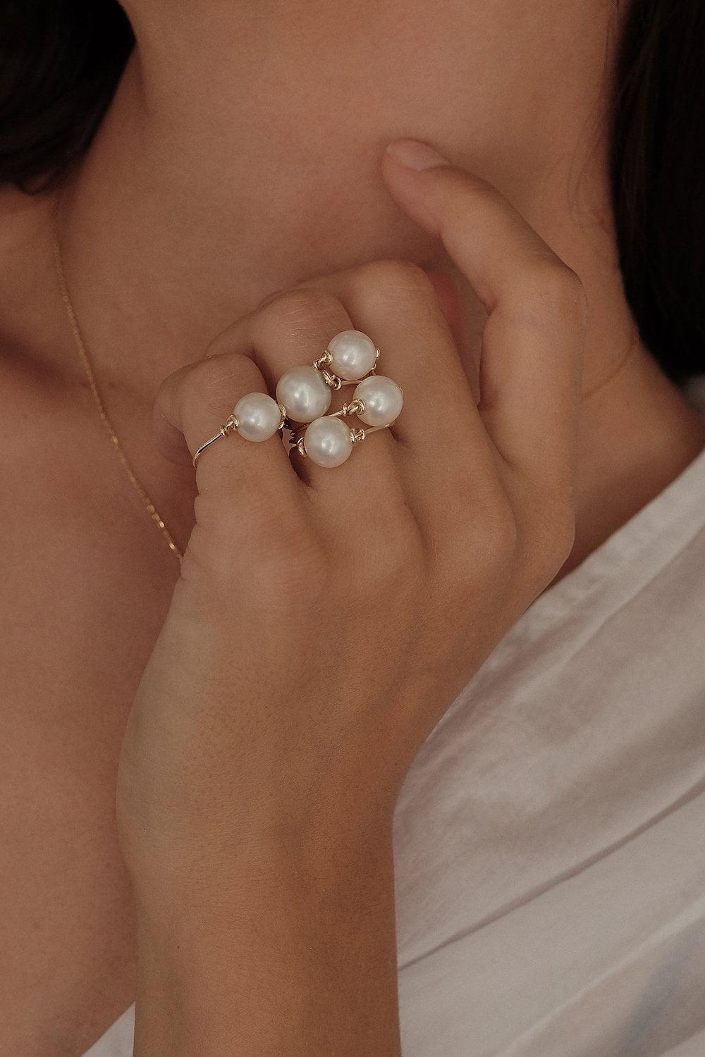 Sarah & Sebastian Curved Perle Heirloom Ring 9k Gold, $620, shop online at Sarah & Sebastian and Single Perle Ring, $220, shop online at Sarah & Sebastian.