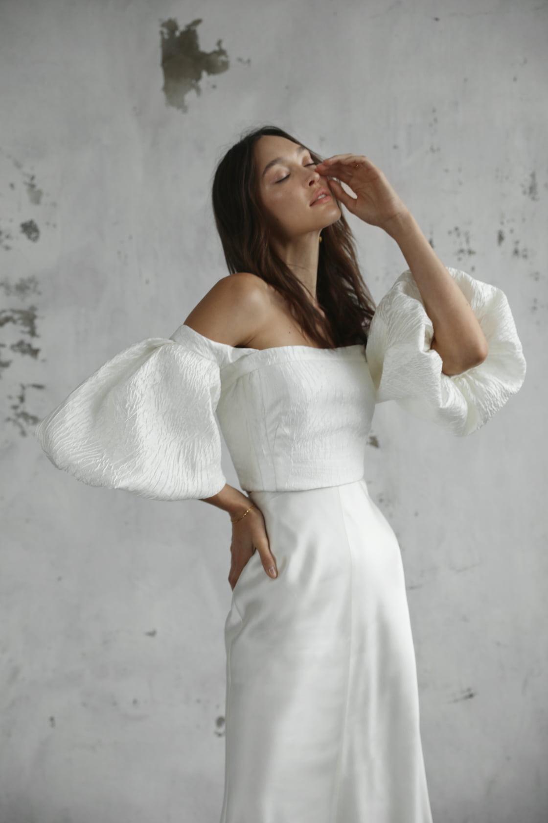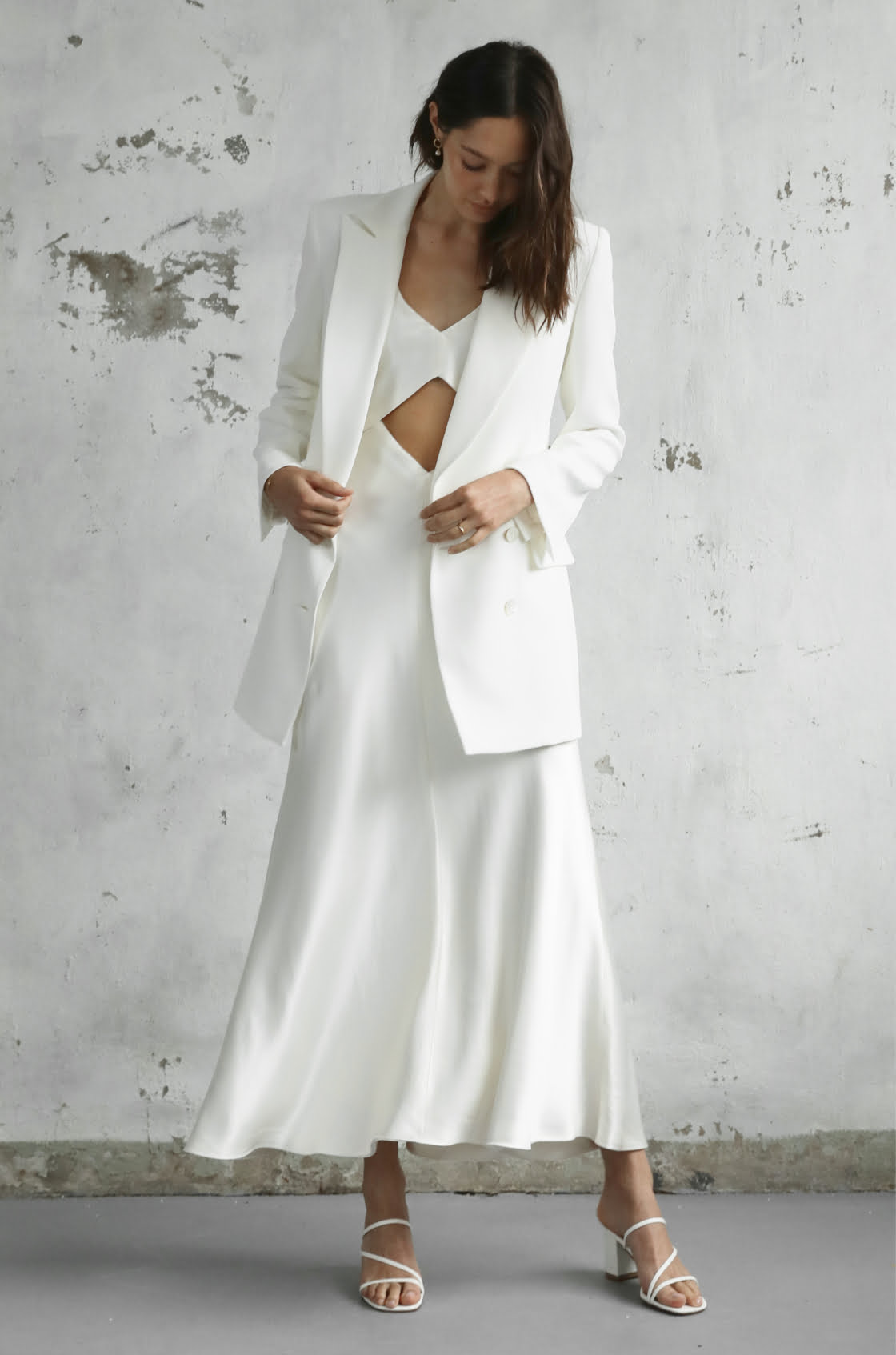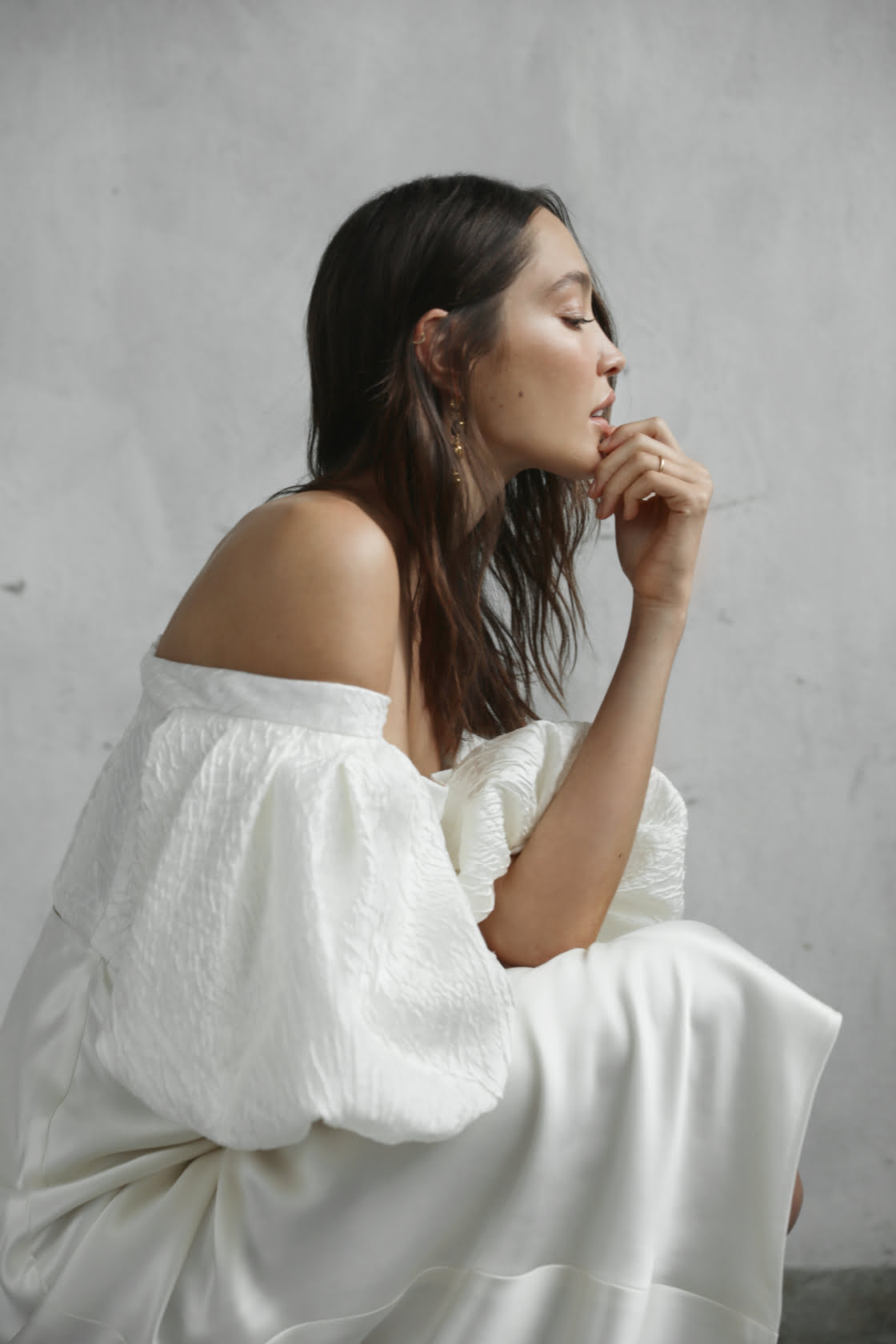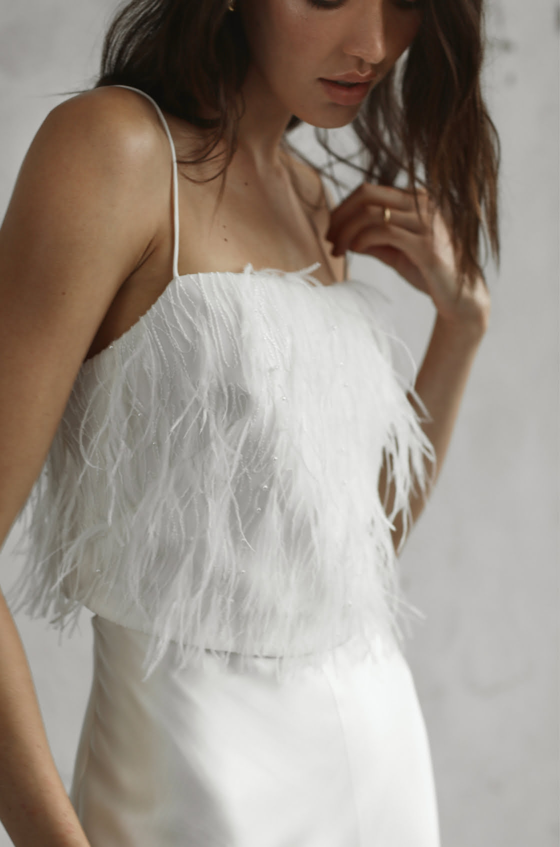 The six-strong collection boasts Prea’s signature relaxed tailoring with silhouettes that simply fall off the body in the very best way, chic lines, separates to mix and match and textures on tap – think crepe and feathers with stunning soft silks. Always keeping it classy, there are demure necklines, the highest, complete with a soft cowl lick and buttoned shoulders to ensure it is modern, contrasted with perfectly placed cutouts and slinky backs. There’s even a short, off the shoulder number that could double as a reception dress, rehearsal dinner, or hens party outfit. Sizes range from 6-18 (you’ll find a handy and very detailed guide here) and if you can’t get to Prea’s new boutique in Sydney, you’ll also find her pieces in Sphere Bridal Gallery in QLD and Mrs Fray in ACT.