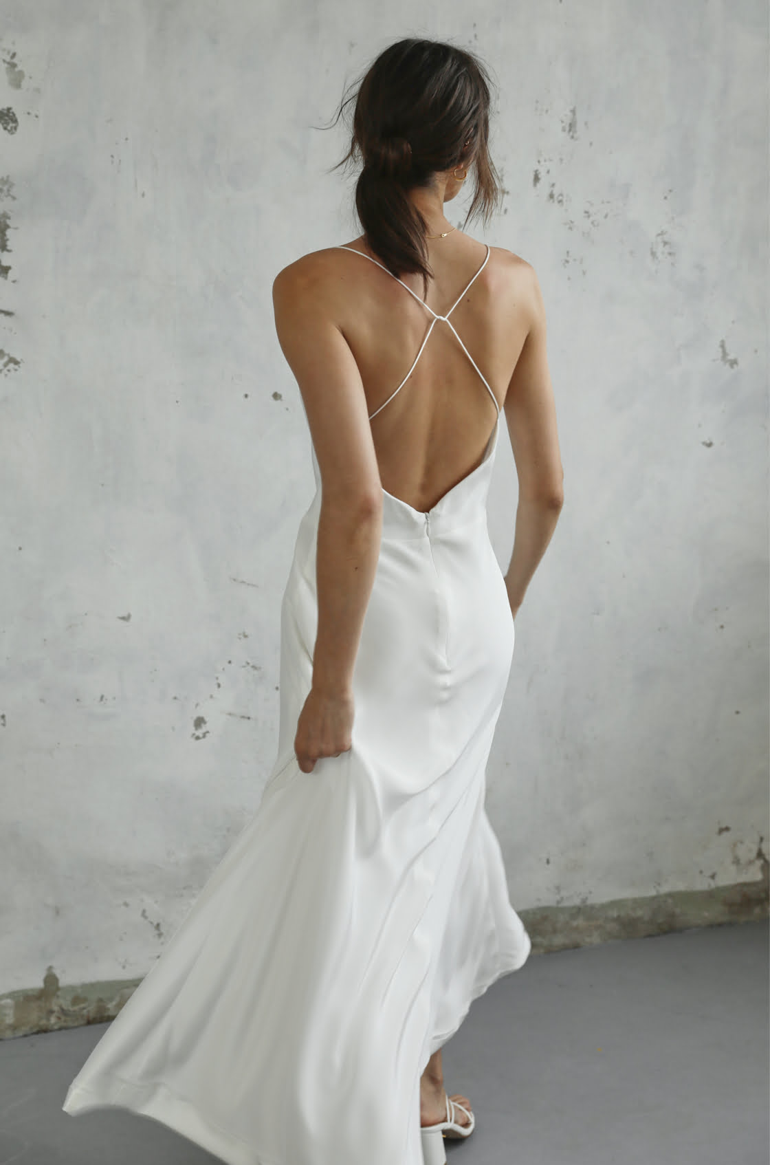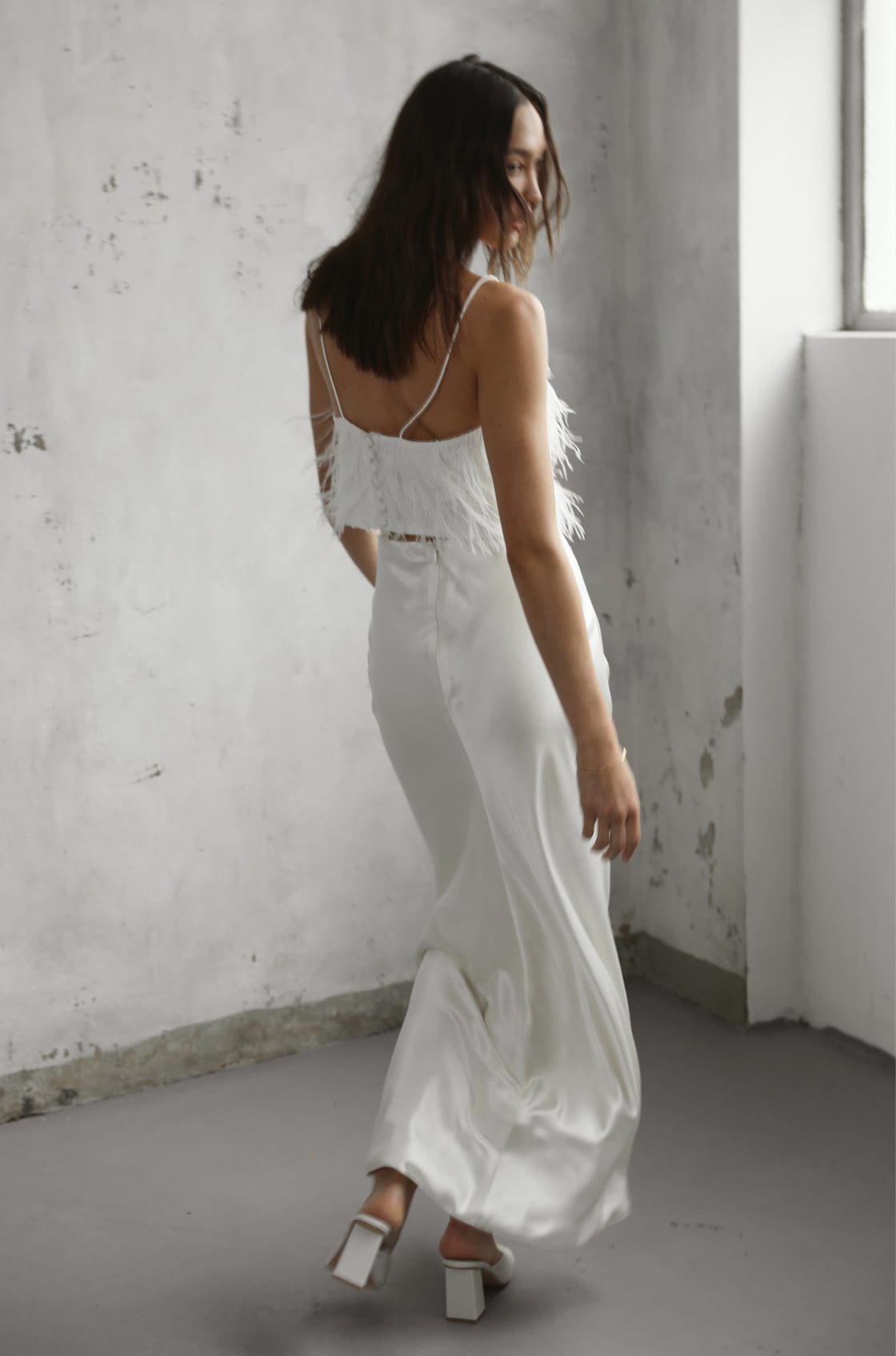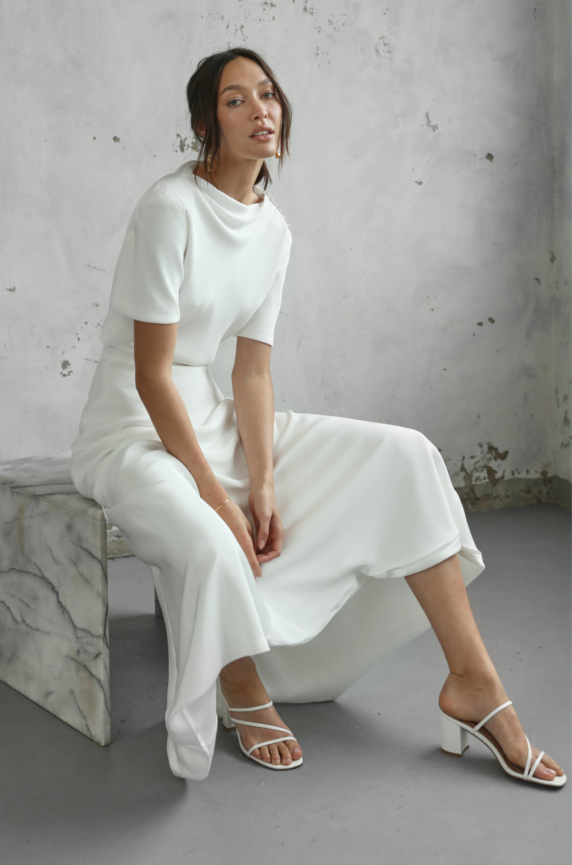 The six-strong collection boasts Prea’s signature relaxed tailoring with silhouettes that simply fall off the body in the very best way, chic lines, separates to mix and match and textures on tap – think crepe and feathers with stunning soft silks. Always keeping it classy, there are demure necklines, the highest, complete with a soft cowl lick and buttoned shoulders to ensure it is modern, contrasted with perfectly placed cutouts and slinky backs. There’s even a short, off the shoulder number that could double as a reception dress, rehearsal dinner, or hens party outfit. Sizes range from 6-18 (you’ll find a handy and very detailed guide here) and if you can’t get to Prea’s new boutique in Sydney, you’ll also find her pieces in Sphere Bridal Gallery in QLD and Mrs Fray in ACT.