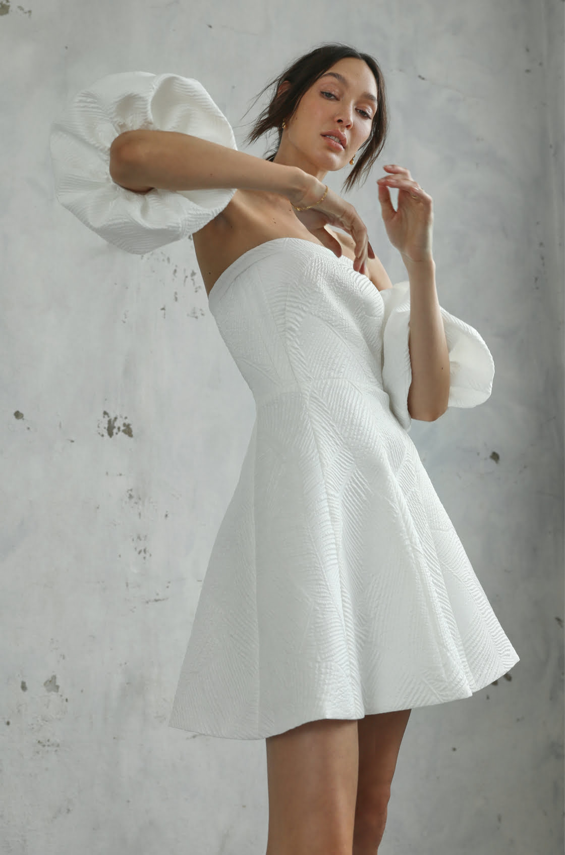 Her latest offering, Embrace, is a refined collection of civil ceremony options to tickle the fancy of the bride looking for a more low key look for her wedding, elopement, registry nuptials… you get the vibe. Also for the unique bride just looking to make her own way in the world of bridal gowns, the non-bridal bride, if you will.