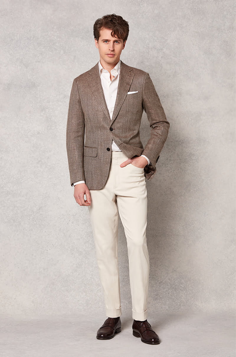 Oscar Hunt Tailors Brown Herringbone Jacket, from $999 and Off white Denim Trouser, from $450, enquire at Oscar Hunt Tailors