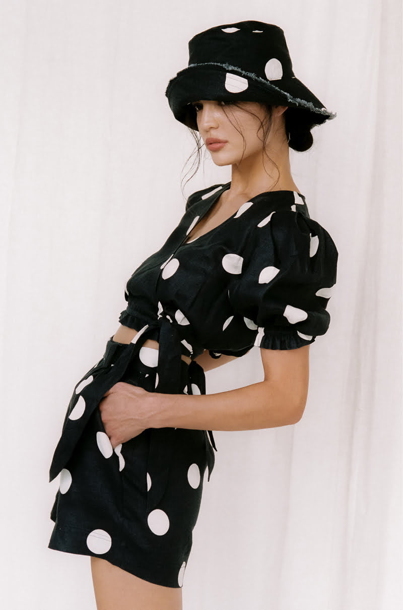 Peony Macaroon Bucket Hat, $125, Wrap Crop, $290 & Belted Short, $260, shop online at Peony