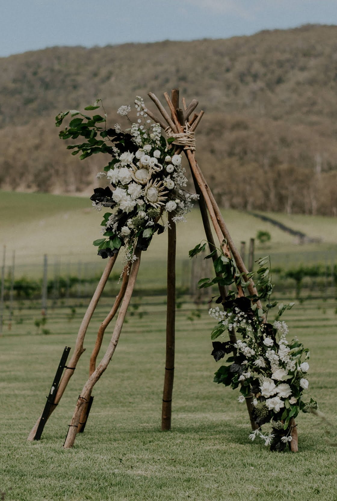 Maybe you’re keen on a more quirky vibe in which case the giant stack of old tyres spray painted purple and decorated with lemons by Victorian fave Nomad Styling (and photographed by Beck Rocchi) might be more up your alley? A naked tipi might tickle your fancy like the one Poppy Culture created below (complete with dream catchers mind you and photographed by Georgia Verrells) or something circular perhaps? Like that beautiful setup Sydney faves Aisle of Eden created at our fave bush venue Audley Dancehall (captured by Gui Jorge)