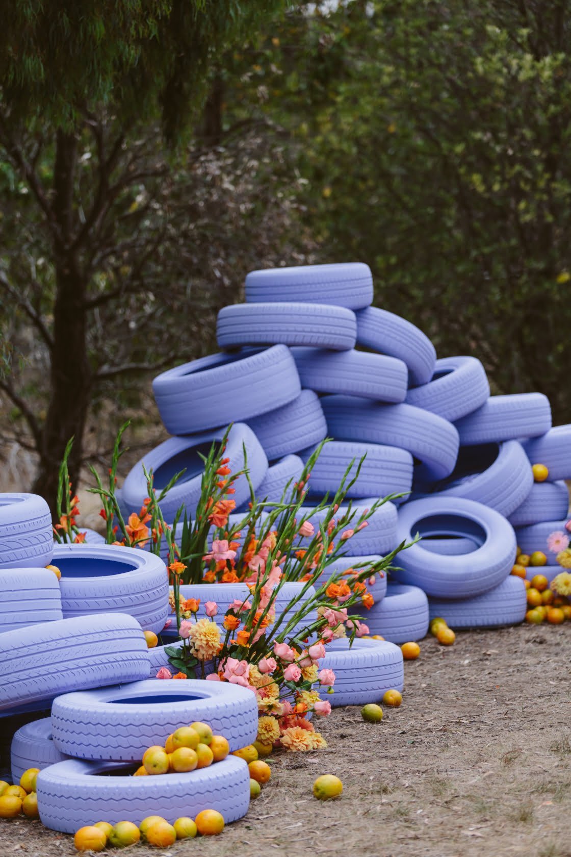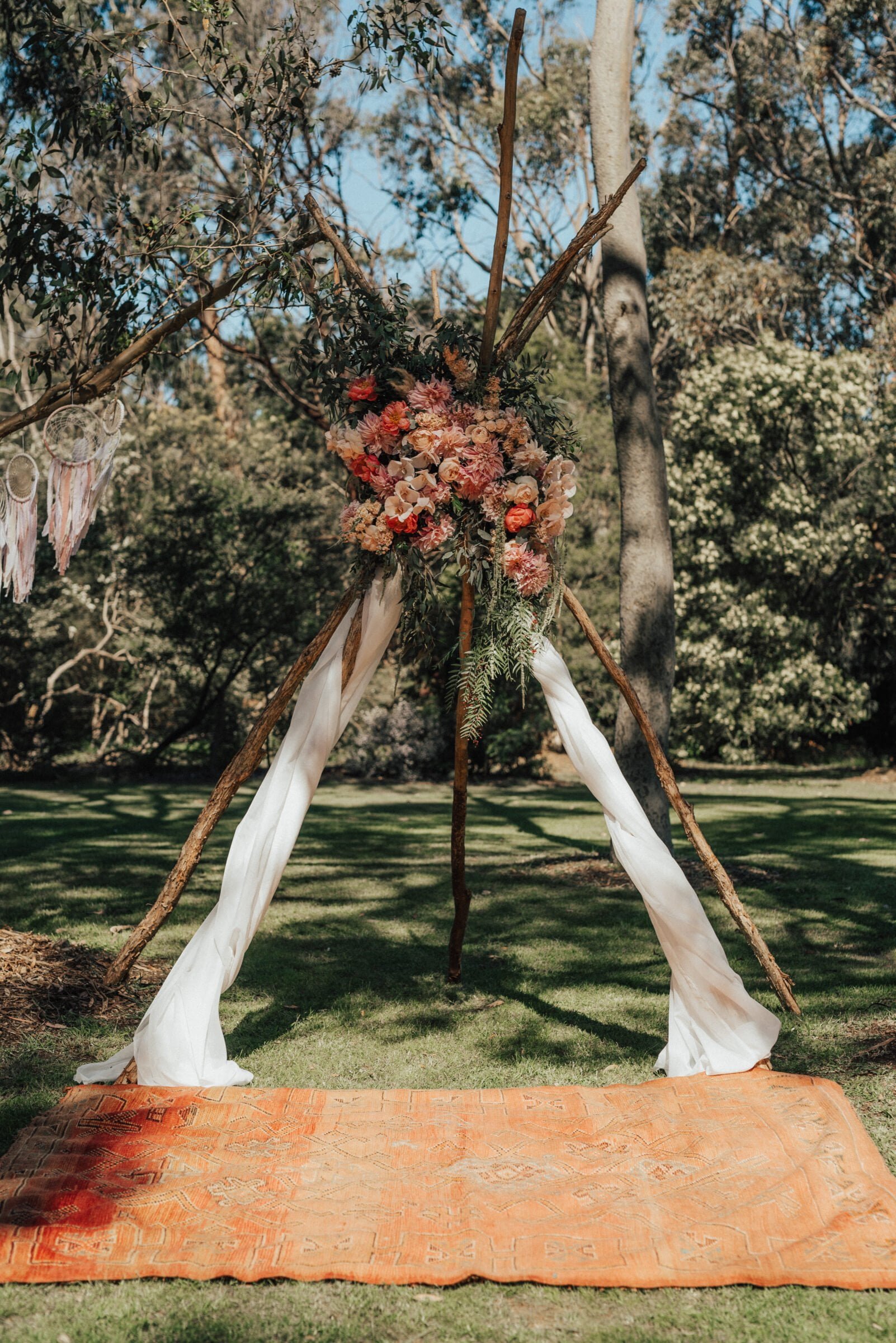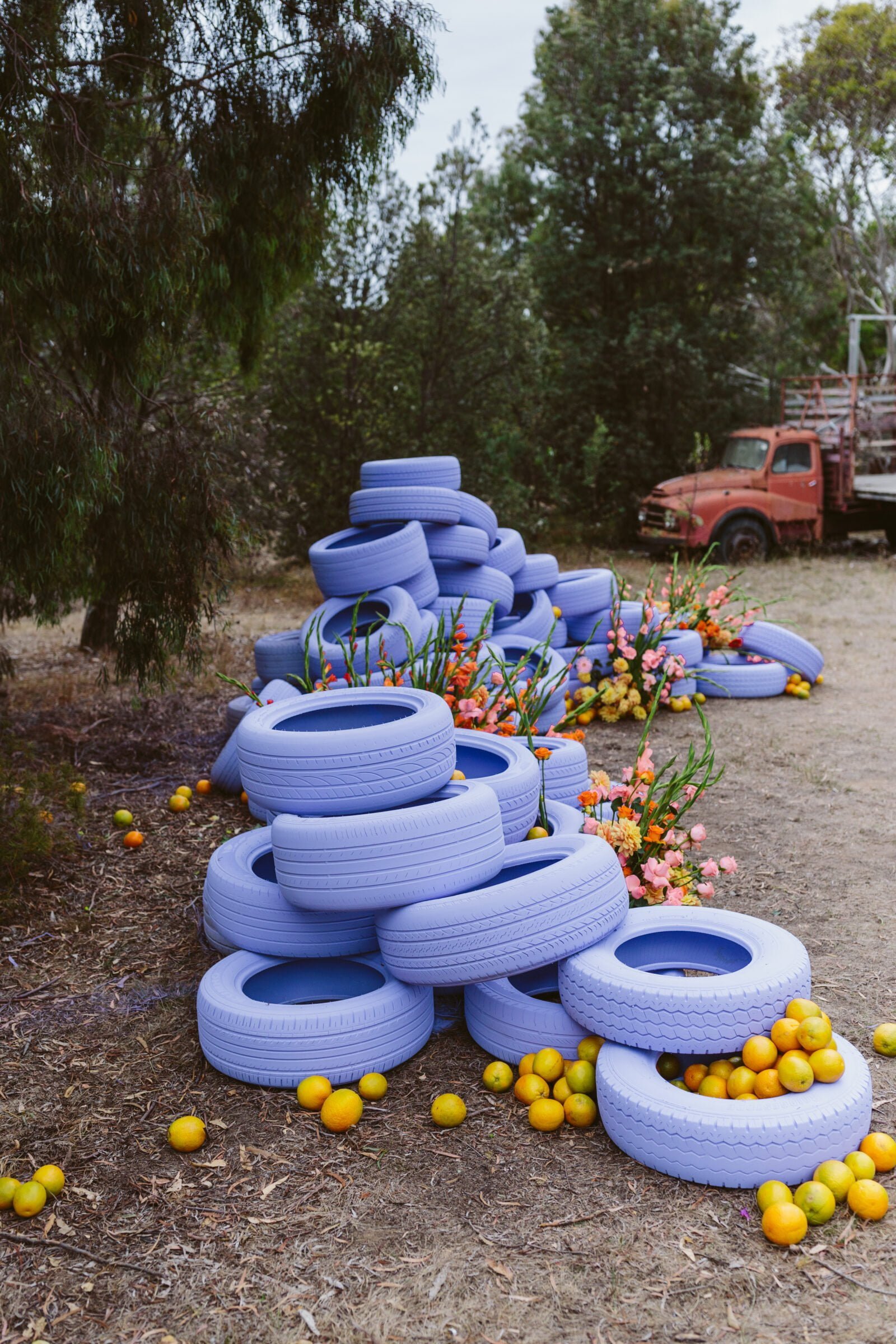 Maybe you’re keen on a more quirky vibe in which case the giant stack of old tyres spray painted purple and decorated with lemons by Victorian fave Nomad Styling (and photographed by Beck Rocchi) might be more up your alley? A naked tipi might tickle your fancy like the one Poppy Culture created below (complete with dream catchers mind you and photographed by Georgia Verrells) or something circular perhaps? Like that beautiful setup Sydney faves Aisle of Eden created at our fave bush venue Audley Dancehall (captured by Gui Jorge)