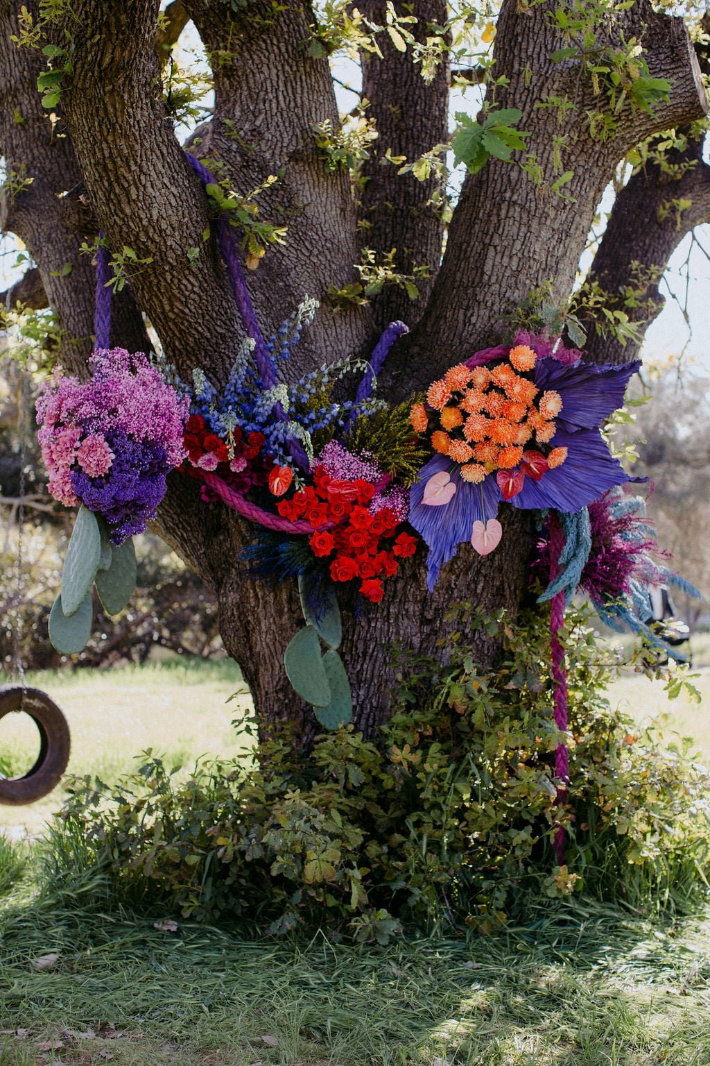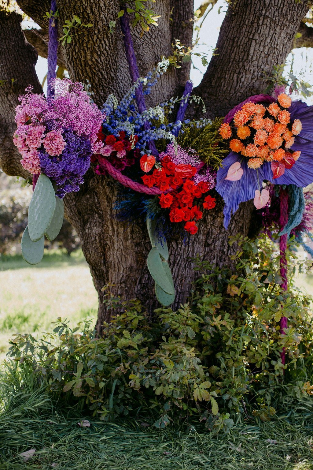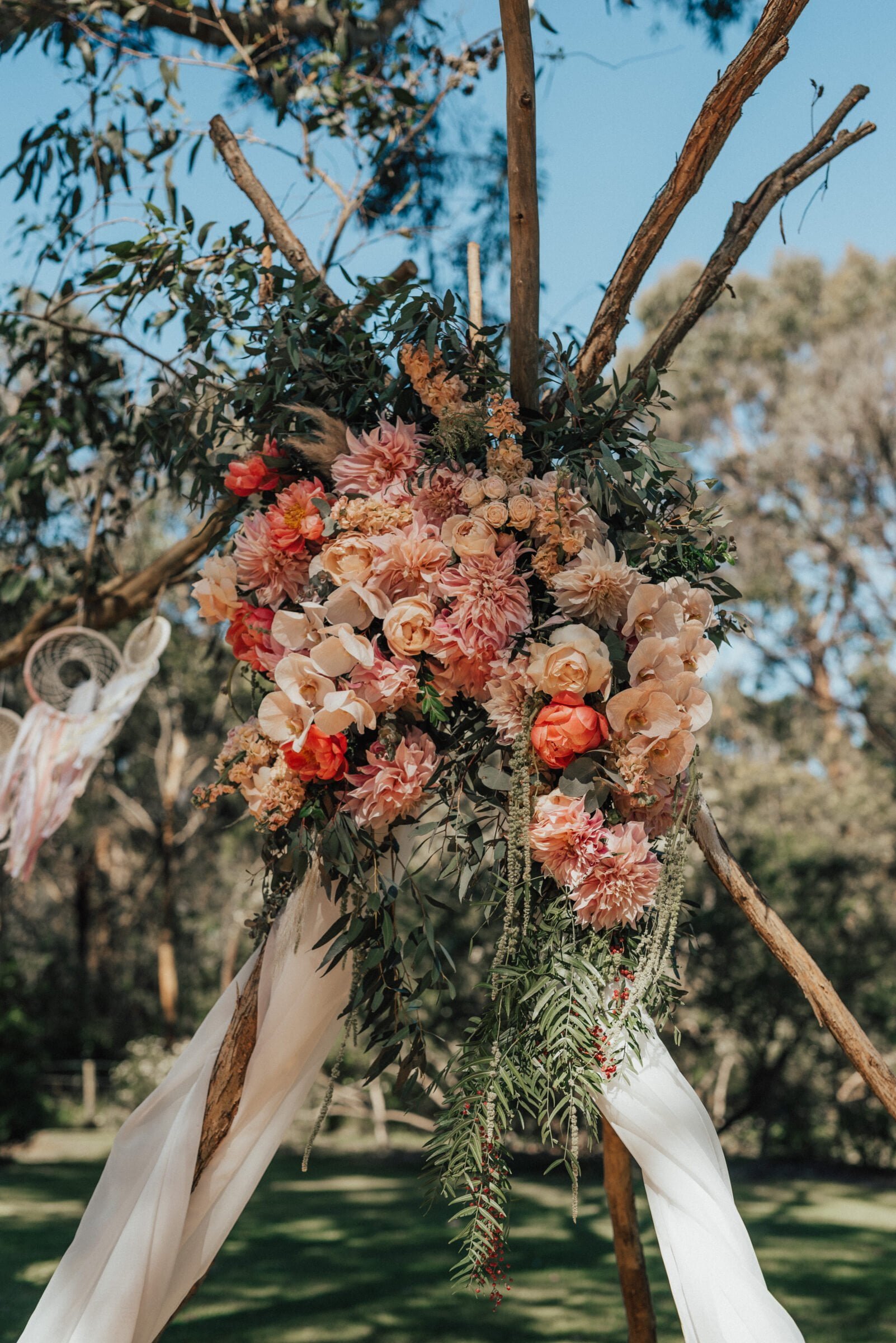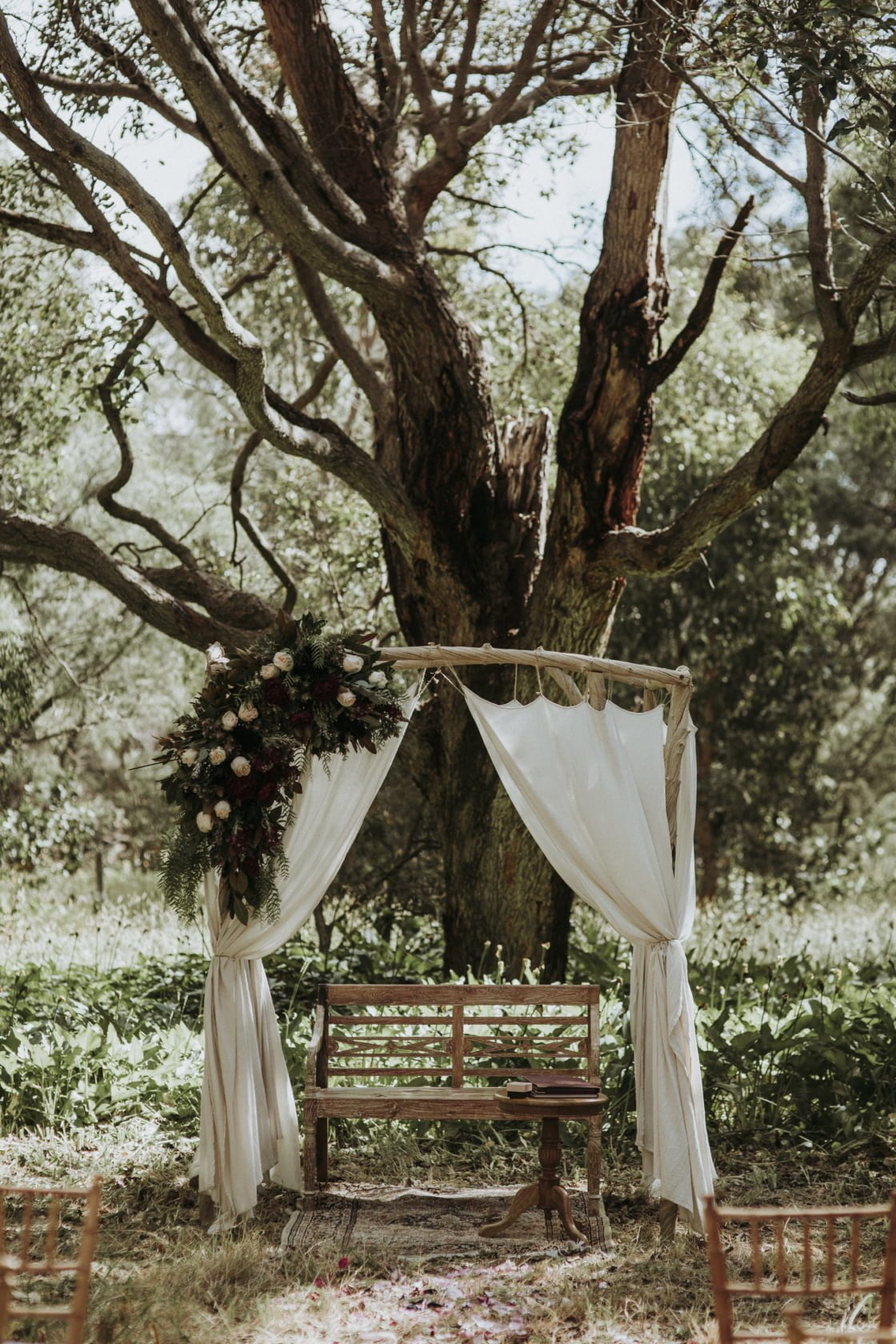 Maybe you’re keen on a more quirky vibe in which case the giant stack of old tyres spray painted purple and decorated with lemons by Victorian fave Nomad Styling (and photographed by Beck Rocchi) might be more up your alley? A naked tipi might tickle your fancy like the one Poppy Culture created below (complete with dream catchers mind you and photographed by Georgia Verrells) or something circular perhaps? Like that beautiful setup Sydney faves Aisle of Eden created at our fave bush venue Audley Dancehall (captured by Gui Jorge)