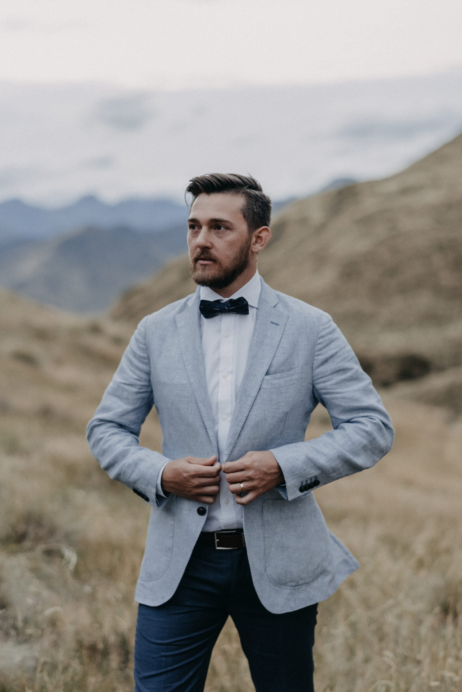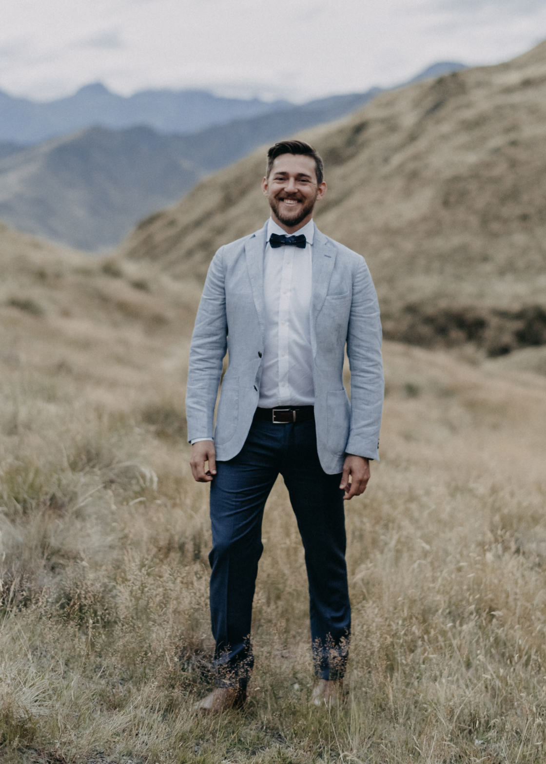 Craig mixed things up a bit with his dark navy suit pants and light blue dress jacket (both by MJ Bale, of course) for his mountain top wedding which was photographed by one of our fave Canberra lens ladies, Lauren Campbell. You can check out more of Lauren’s work here and more of Montana and Craigs Queenstown elopement here. Thinking about eloping in New Zealand? You’re going to need the Queenstown Wedding Association in your life! It’s your one stop shop for planning an elopement across the ditch.