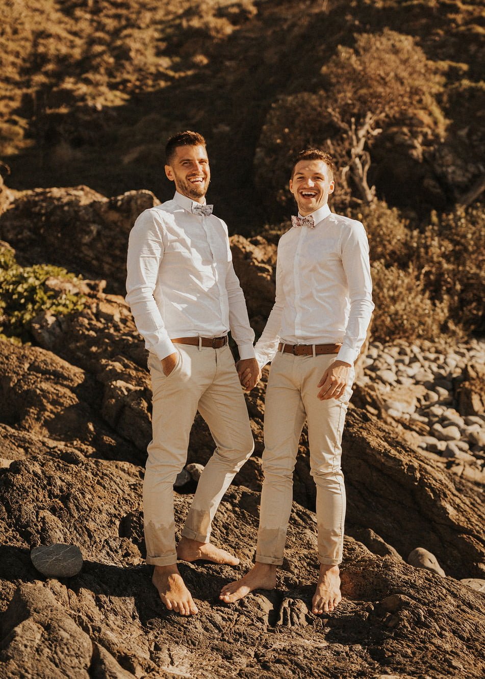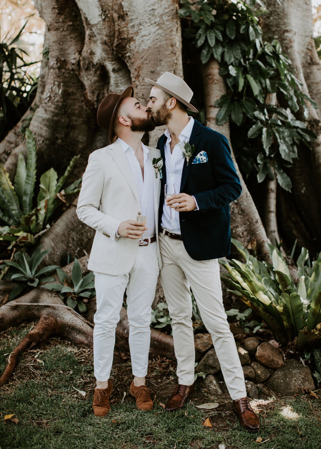 Rob and Andy nailed the low key coastal elopement look with their bare feet, tan slacks and crisp white shirts, choosing to ditch the jackets completly for their summer time wedding. Photographed by Cedar and Salt, both gents are dressed head to to in menswear label Politix. If you’re planning on tying the knot in Byron Bay or its surrounds click here for a list of our favourite local vendors from photographers, venue, hair and makeup artists , celebrants and footwear (just to name a few).