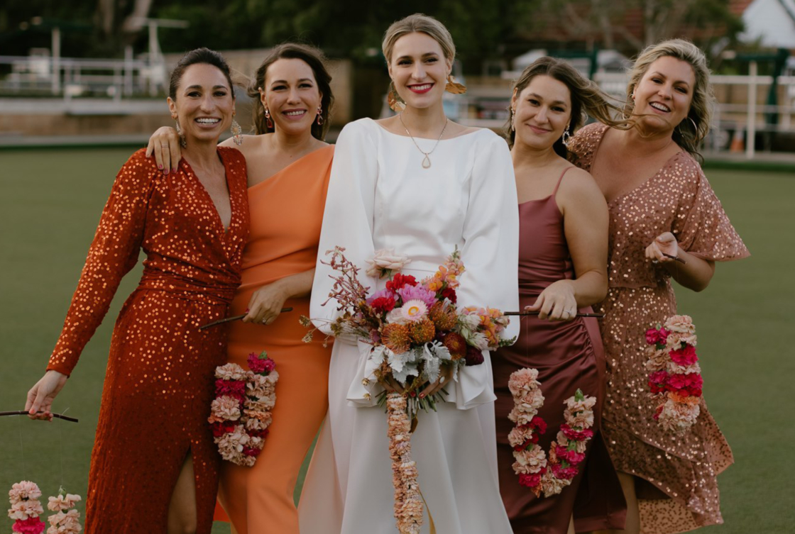 Never has a hands-off approach gone so right! When Ash and Kalim tied the knot, the bride gave her fab florist, The Marmalade Sky, nothing more than a basic colour brief. But, boy, what a result. “I gave Kimberley from The Marmalade Sky free rein with my bouquet,” Ash explains. “I basically just told her a few colours I like and she absolutely nailed it. I couldn’t have wished for a more perfect bouquet. It was epic and felt so right for me.” We love that cheeky paper daisy poking its head out from the middle of the bunch, and those gorgeous floral strings held by Ash’s bridesmaids. Gorge! Oliver Smith Photo captured the florals in all their glory against the casual-cool backdrop of the South Cronulla Bowling Club.