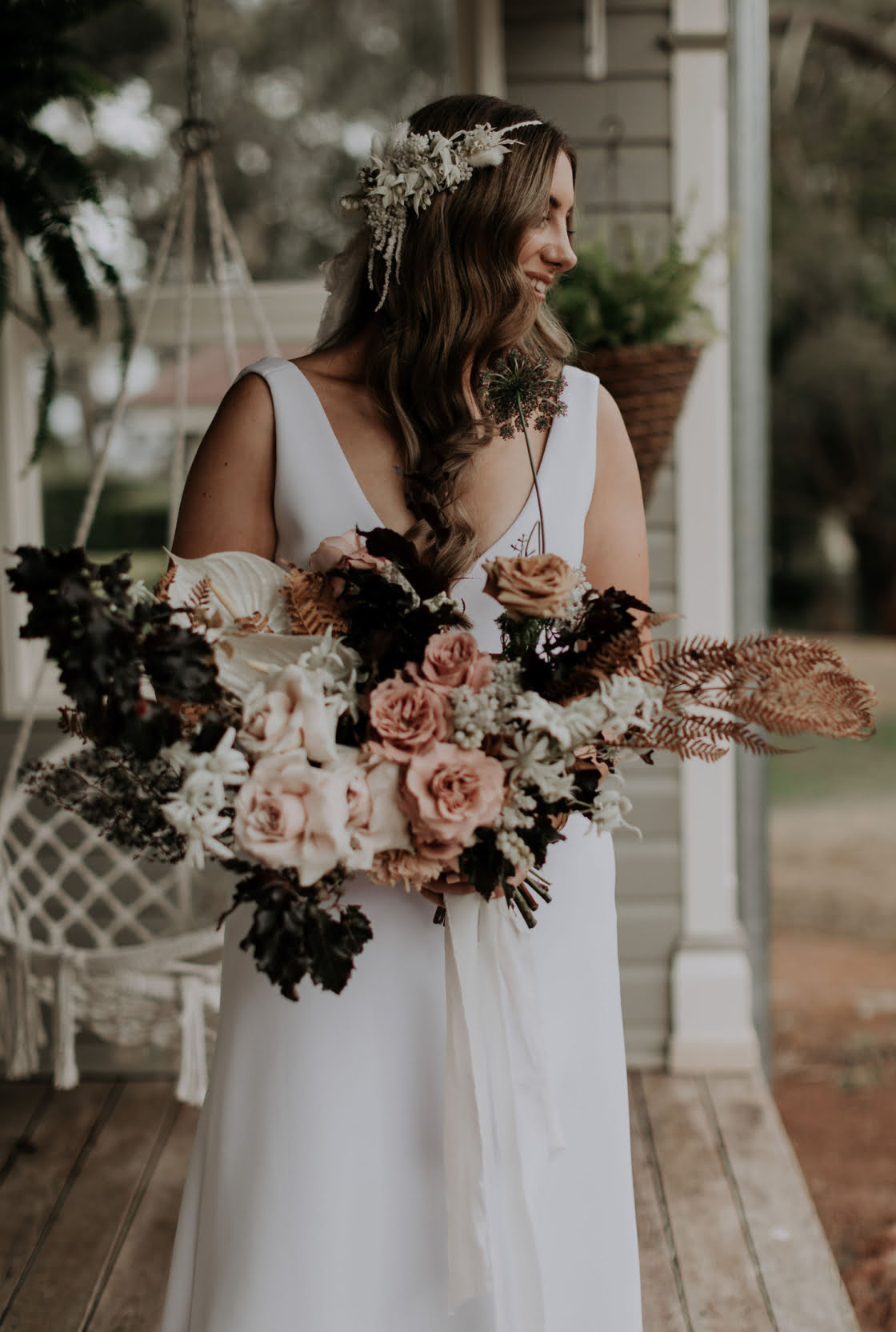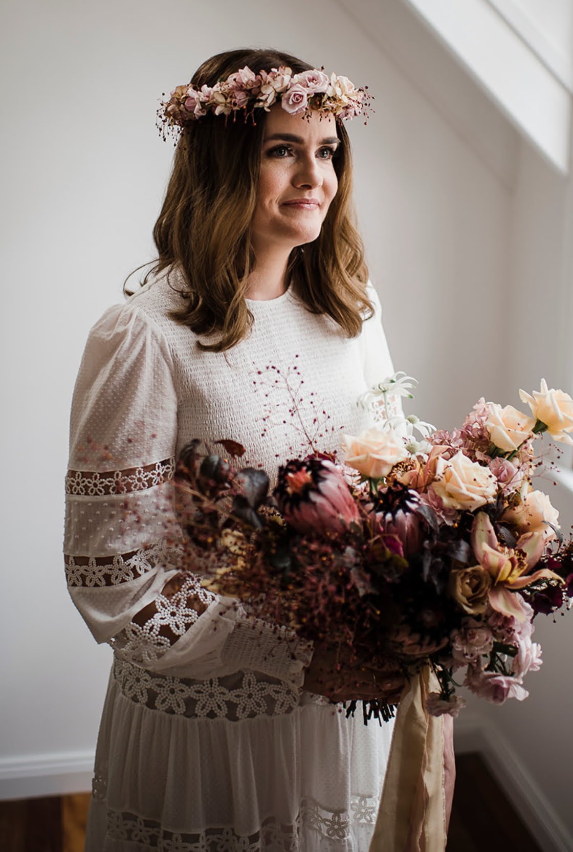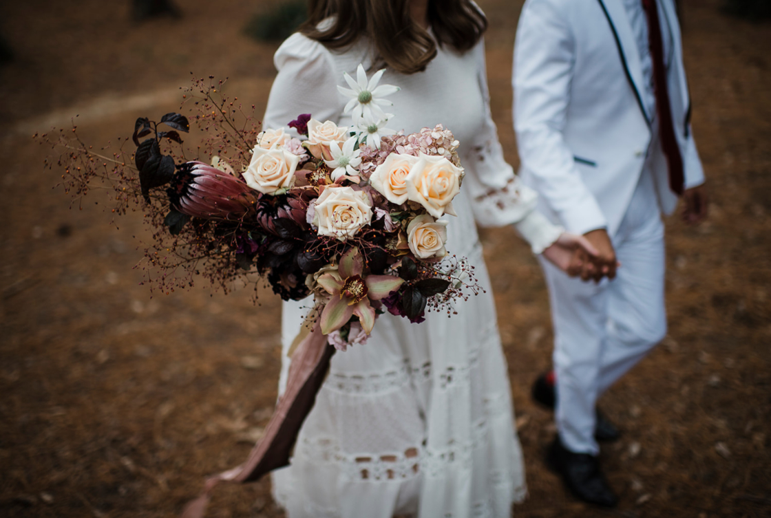 Here’s proof that an elopement doesn’t need to skimp on the glamour! When Meghan married Ash, her Film & Foliage bouquet was absolutely everything, from the pops of creamy-peach in those lush roses to the deep, moody burgundies and dusty vintage pink shades of Australian natives. But it wasn’t just her beautiful bunch that had bride Meghan singing. “We absolutely loved the floral arbour created by the florist, which was made up entirely of native flowers,” she shares. “They also put together a gorgeous flower crown for me to wear with my dress.” Working alongside the rest of the Anteloping team to create this special day, photographer Barefoot & Bearded caught it all on camera – check out all the pics right here then head to Film & Foliage’s directory listing when you’re ready for your own phenom flowers!