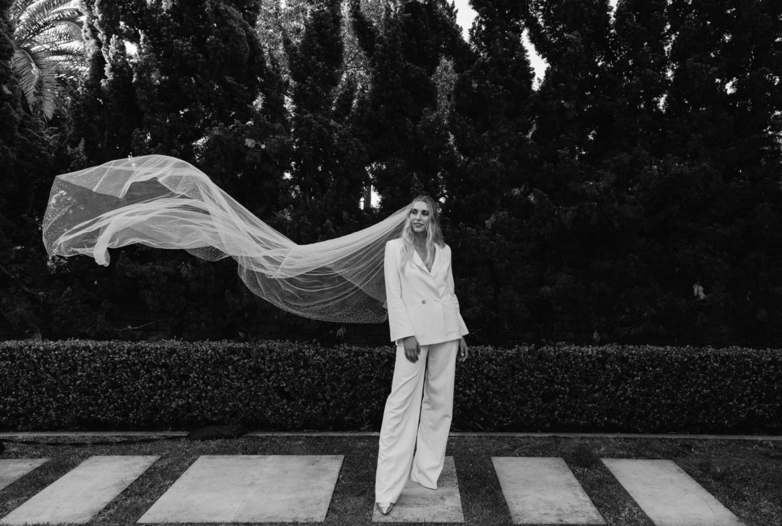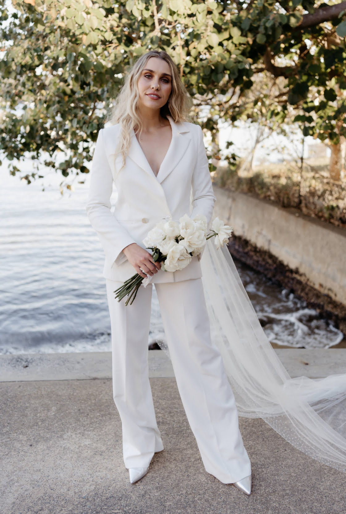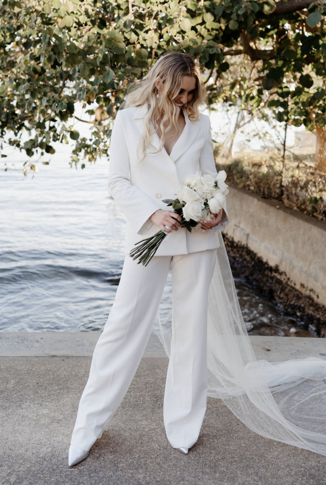 Okay, stop. Just stop everything. It’s not just the freakin’ stunning wide-leg pant and structured blazer two-piece that we’re loving here, it’s that incredible floaty veil, too. What a shot! (Snapped by the ever-so-talented Zoe Morley Photography, in case you were wondering.) Both the sweet suit and that ethereal swathe of tulle are by the brilliant Karen Willis Holmes. “I was on a photo shoot when I found my perfect outfit,” shares model Demi. “As soon as I put it on I felt so incredible, I didn’t want to take it off. I knew it was what I wanted to wear on my special day. The girls at Karen Willis Holmes were amazing as well. We had such a fun time in the showroom together and they made my experience a dream.” Teamed with a pair of Meggan Morimoto heels and this look is officially modern-bridal heaven. (Psst – click here for more from Zoe Morley Photography.)