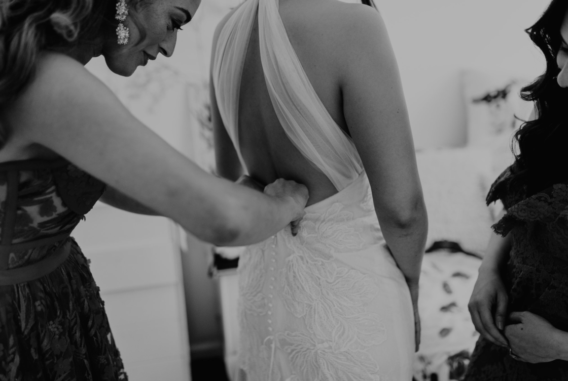 A whole bunch of Hello May‘s friends came together to work on this wedding, from Miranda Stokkel behind the camera to Pomp and Splendour on the flowers, Josue Films making cinematographic magic and Zena Lythgo Celebrant making it official. But today we’re talking about dresses, and dang, this Hera Couture gown is a beauty! “I tried numerous dresses, but nothing was quite like the Venezia gown from Hera Couture,” gushes Jess of her classic look. “I fell in love with the high neckline, the delicate and intricate flower embellishments, and the open back with soft tulle. I felt elegant, confident and myself.” With Tom rounding out the day’s fashionable fits in M.J. Bale, this was one well-dressed wedding. (Psst – see more Miranda Stokkel’s magic over here.)
